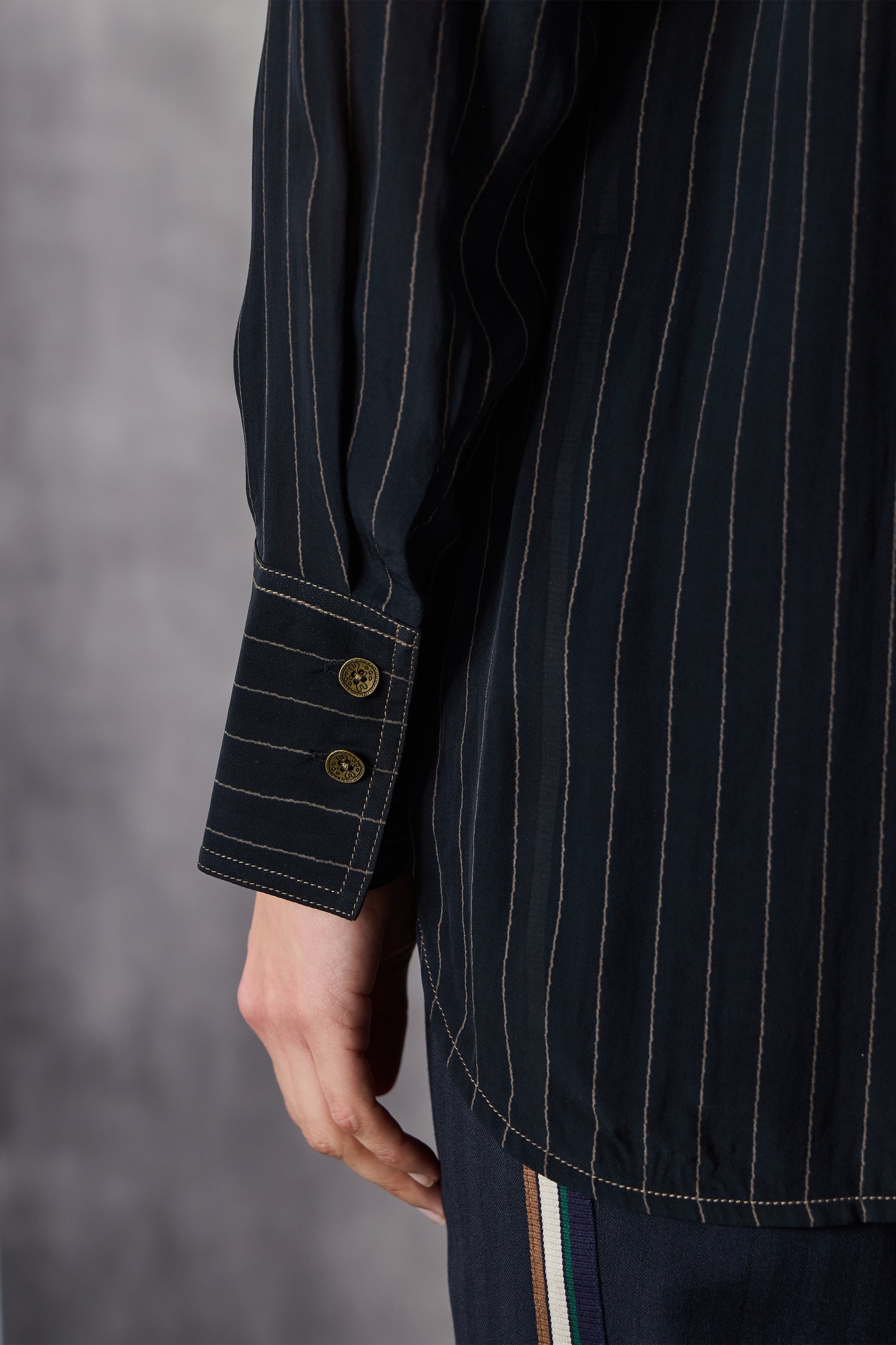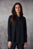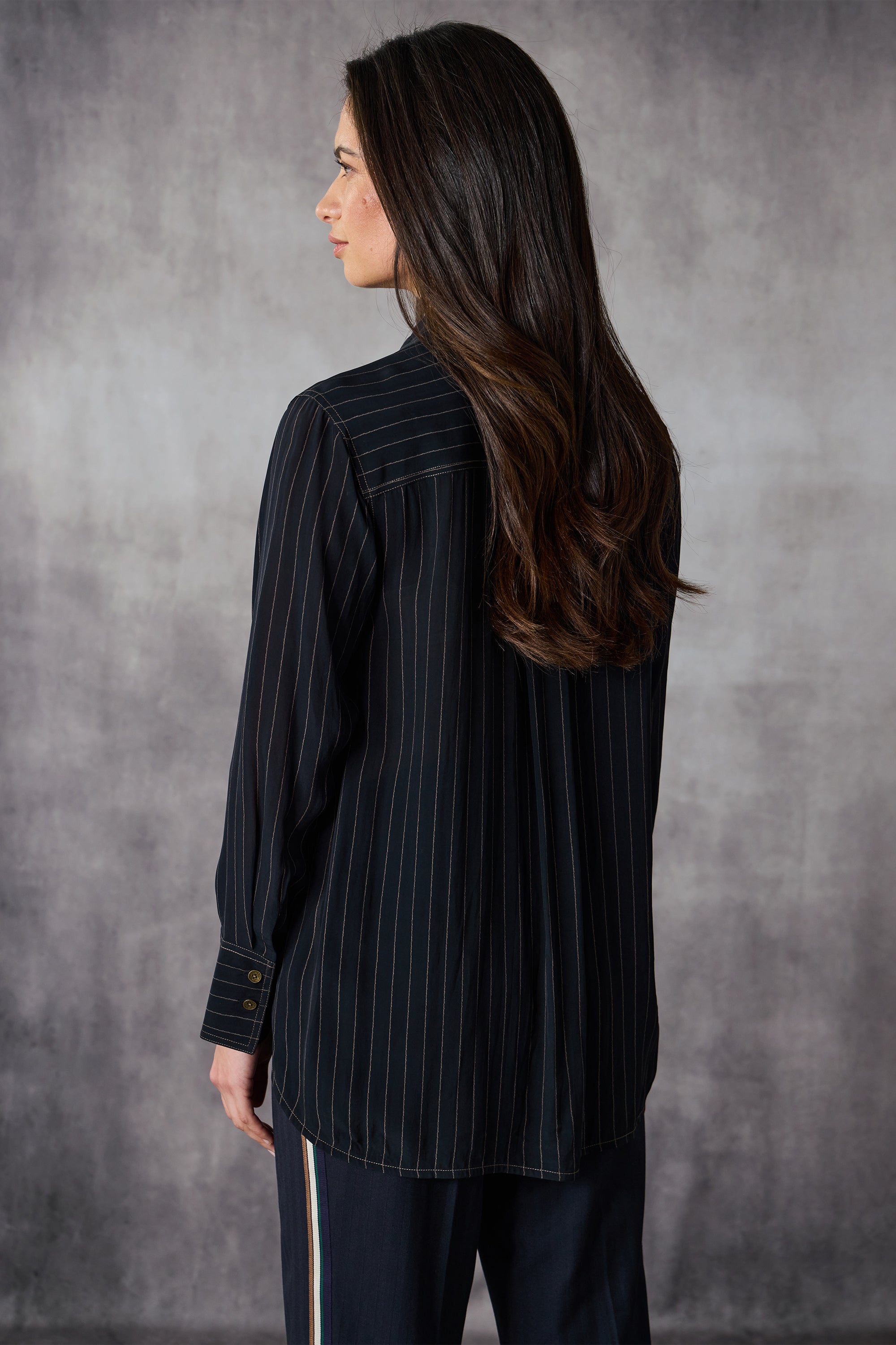 This classic long-line shirt in soft viscose features a subtle stripe and relaxed fit. Designed with long sleeves, wide cuffs, a structured collar, antique brass buttons, and contrast stitching, it’s an effortlessly stylish piece that combines comfort and sophistication for versatile everyday wear.