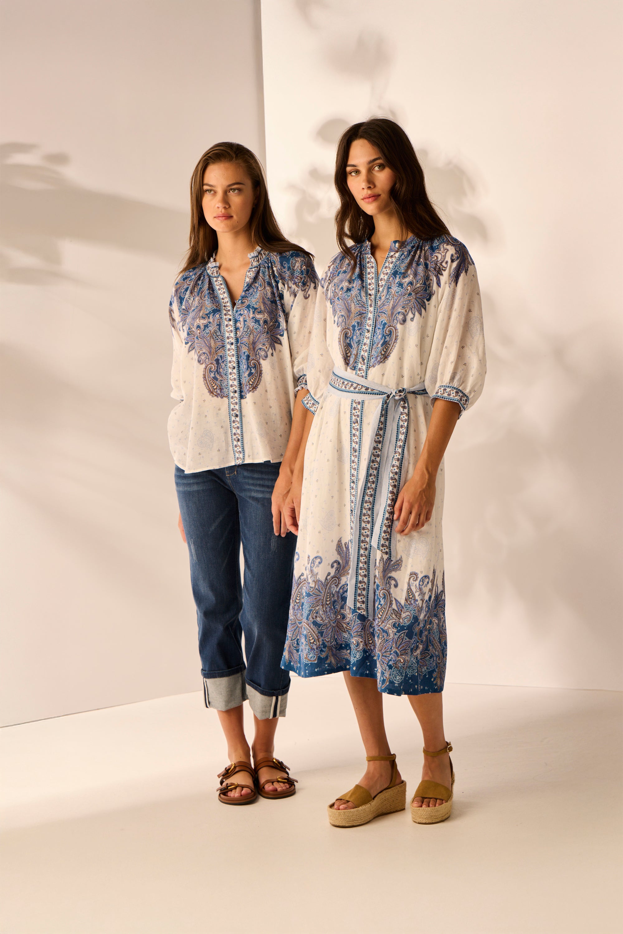 Step into artistic allure with the Payton Dress, a relaxed‑yet‑elegant silhouette crafted from a breezy Tencel‑ramie blend in the signature Payton print. Raglan sleeves gathered at border‑print cuffs and self‑covered buttons add refined detail. A removable belt offers waist‑cinching versatility. Effortlessly stylish for any occasion, it balances comfort and charm.