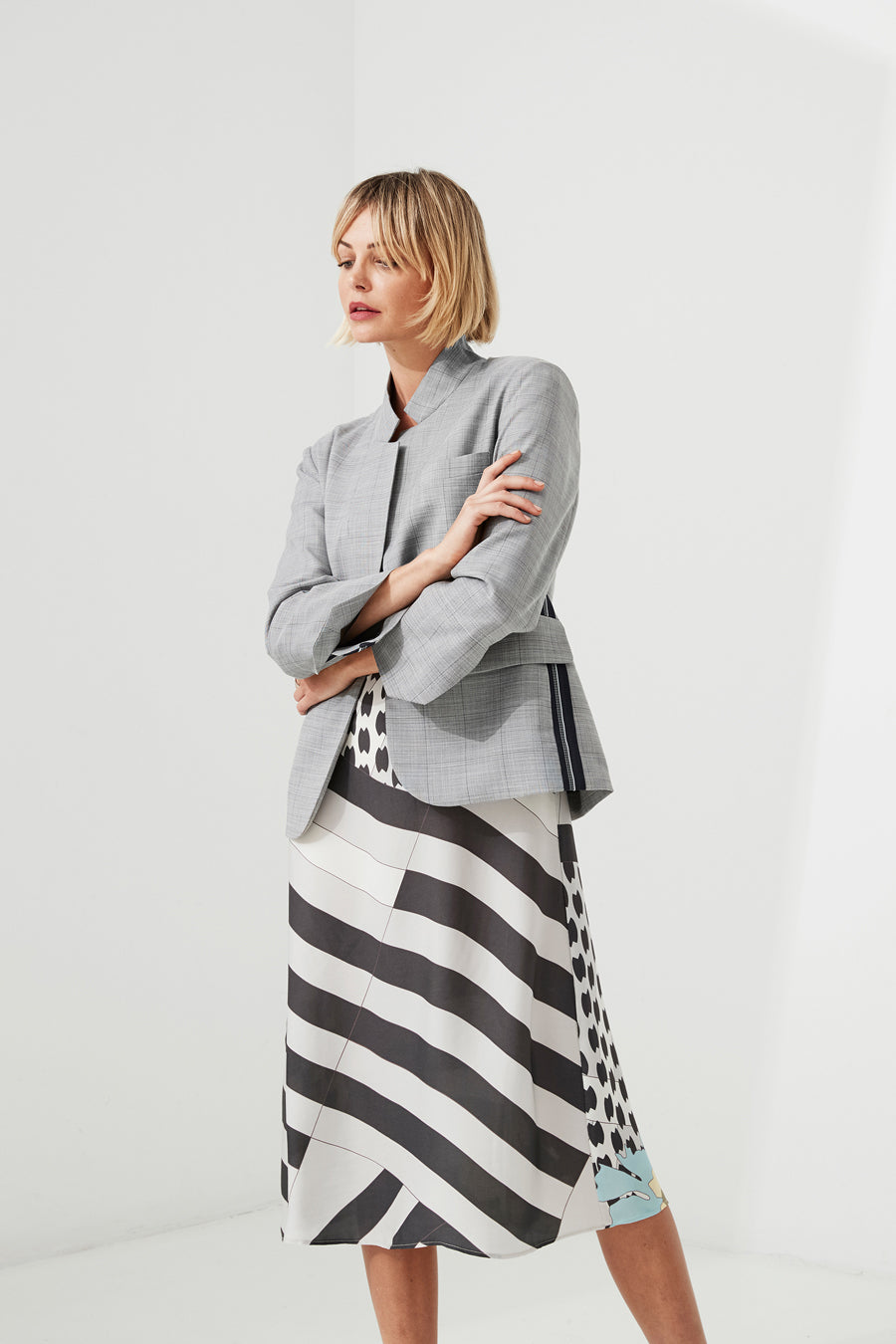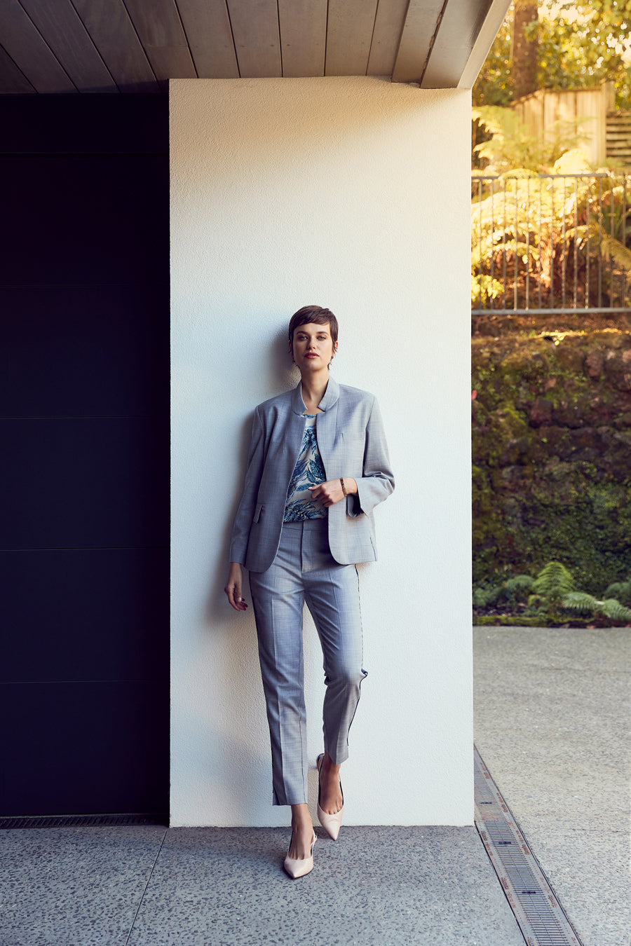 Tailored jacket, featuring novelty tape at side and sleeve placket, paired with Pearl pants.
