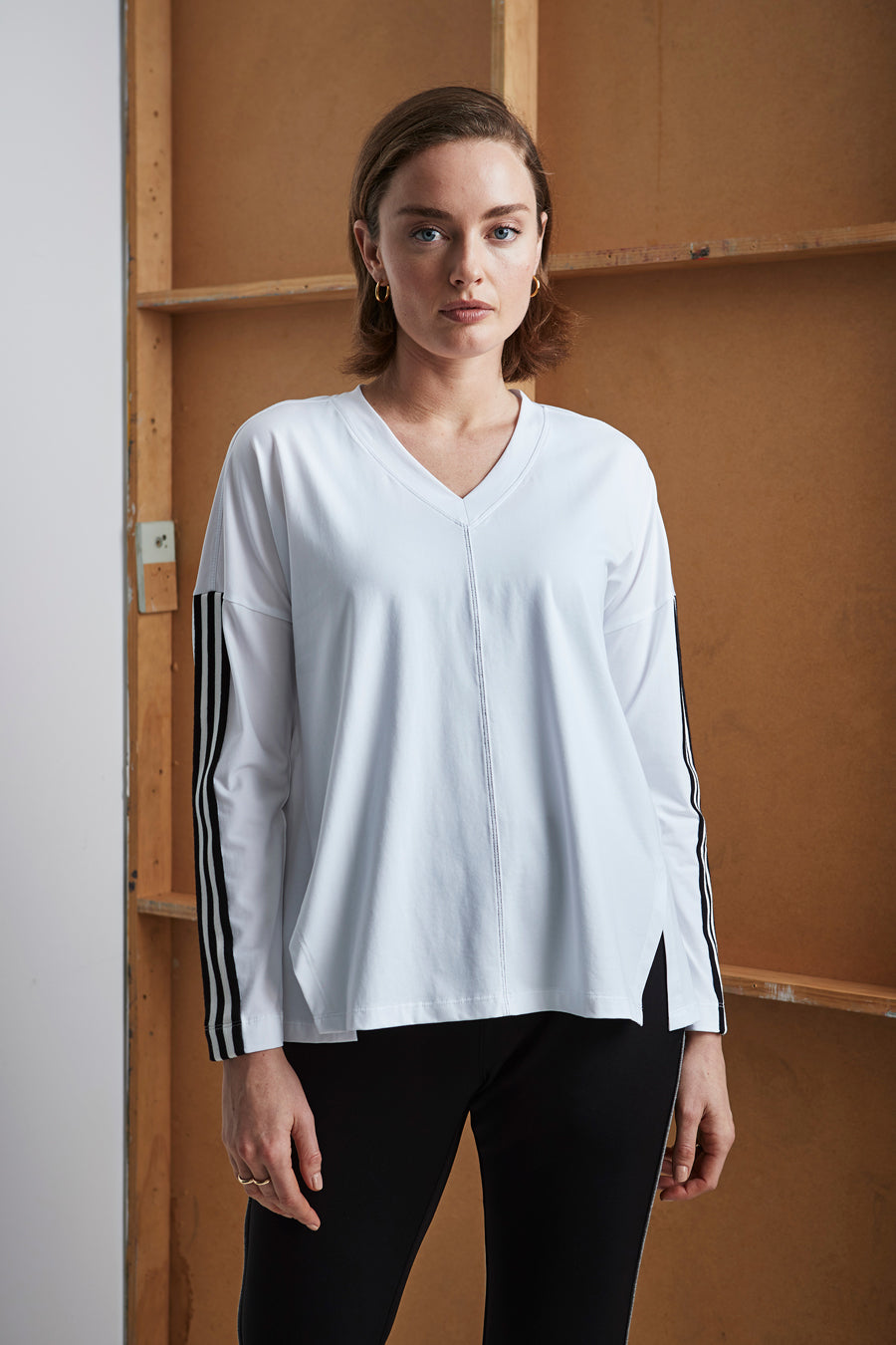 Soft cotton blend, boxy fit top, featuring; drop shoulder, front hem vents, long sleeves and novelty tape at the sleeves.