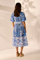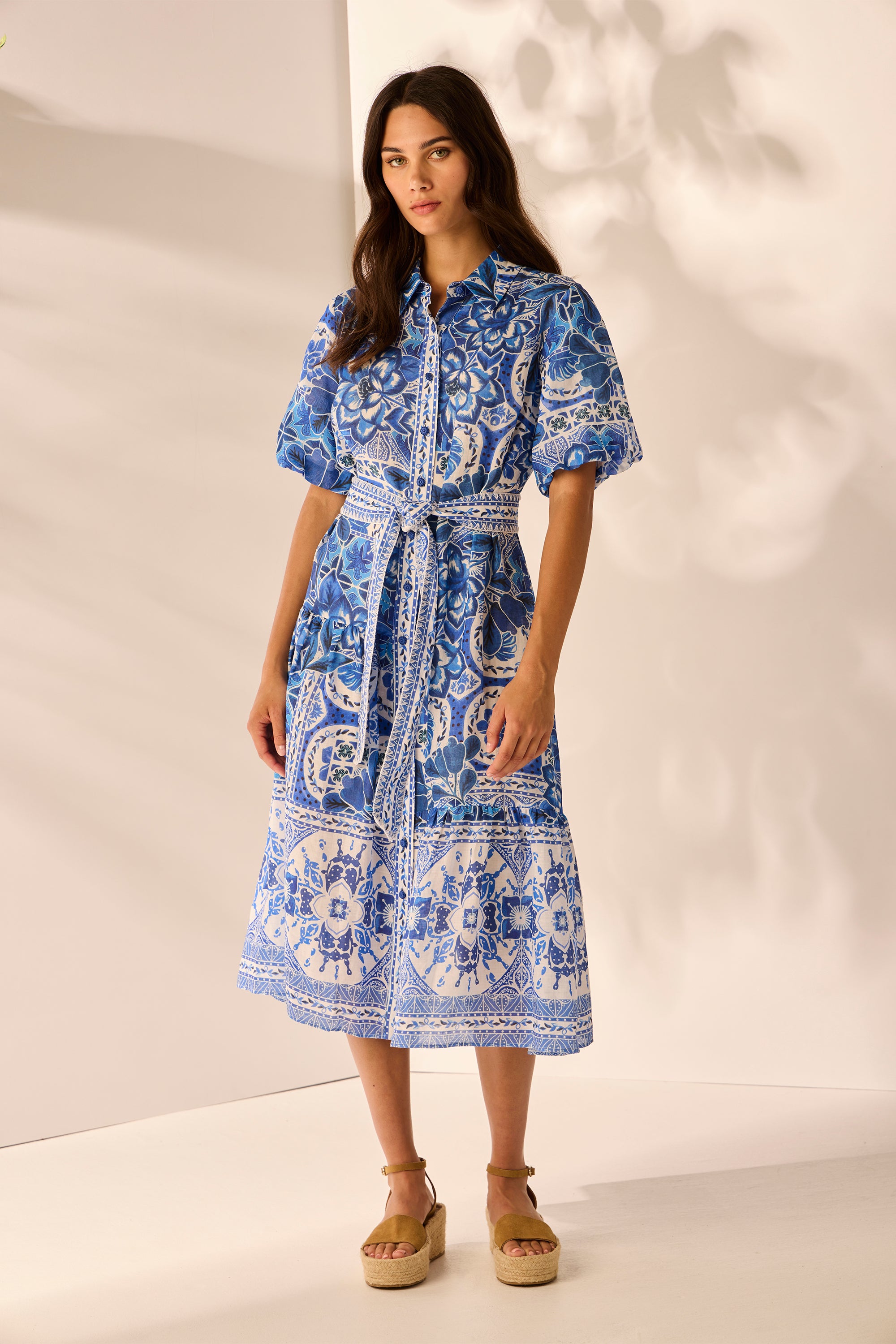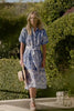 The Porto Dress is a perfect balance of elegance and artisanal charm, featuring a mid-calf length silhouette with a flowing high-low gathered hem. Thoughtful details like blanket stitch embroidery on the belt, a border print accent, and a centre-front placket with raffia buttons make this a standout piece for effortless styling.
