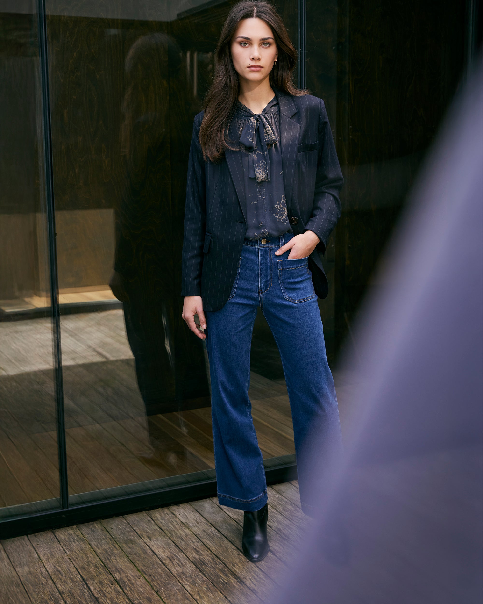 The Principal Jacket offers a contemporary take on classic tailoring with its striped wool blend suiting. Designed with asymmetrical tortoiseshell buttons, this blazer is perfect for adding sophistication to your ensemble.