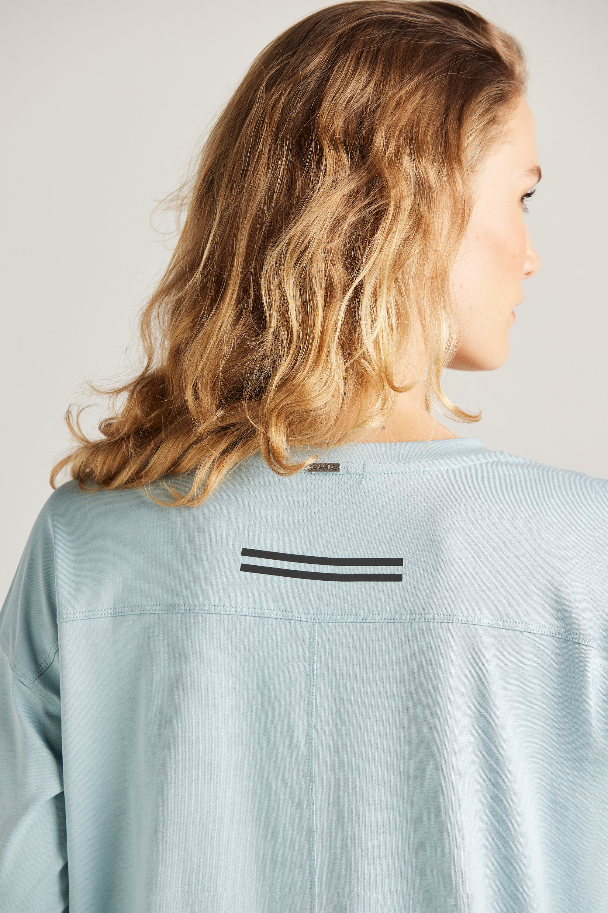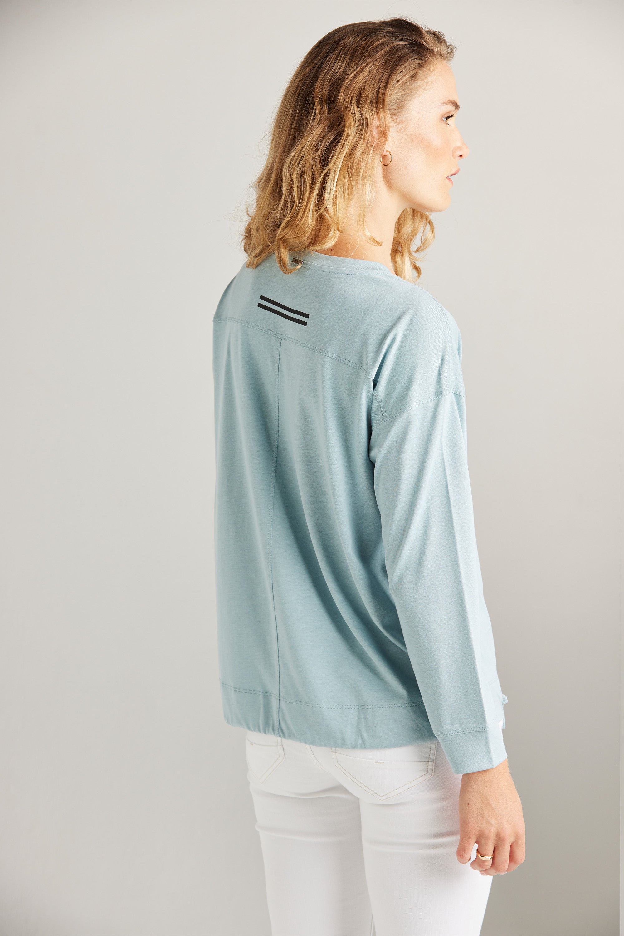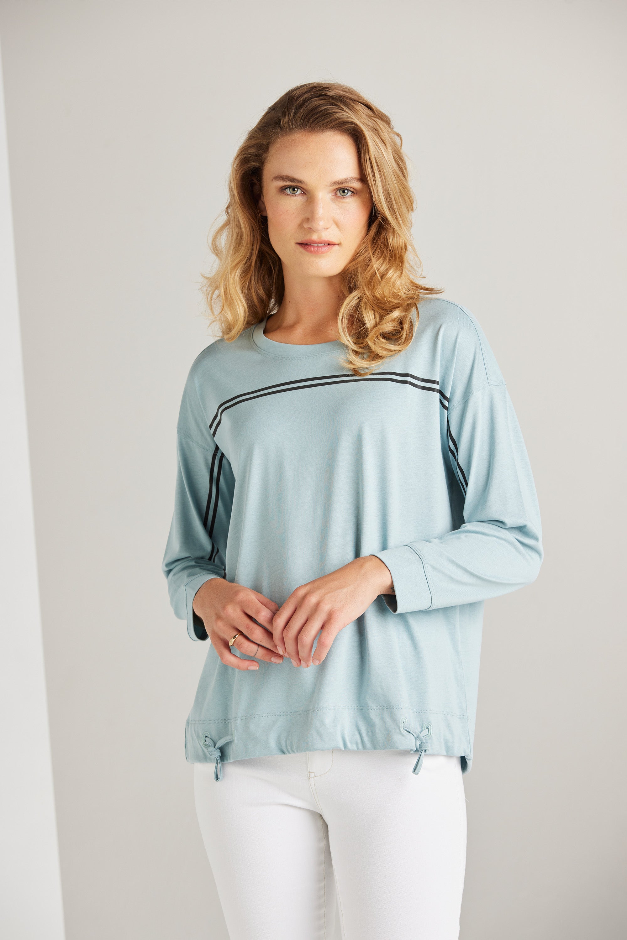 The Rally Top, crafted from a soft Tencel and cotton jersey blend, boasts a boxy fit that exudes effortless minimalism. It features drop shoulders, long sleeves, and a hem drawstring that elevates the design adding a touch of sophistication. The top is further enhanced by its subtle tonal topstitching and a unique novelty heat seal contrast stripe detail that is gracefully placed across the sleeves and chest.