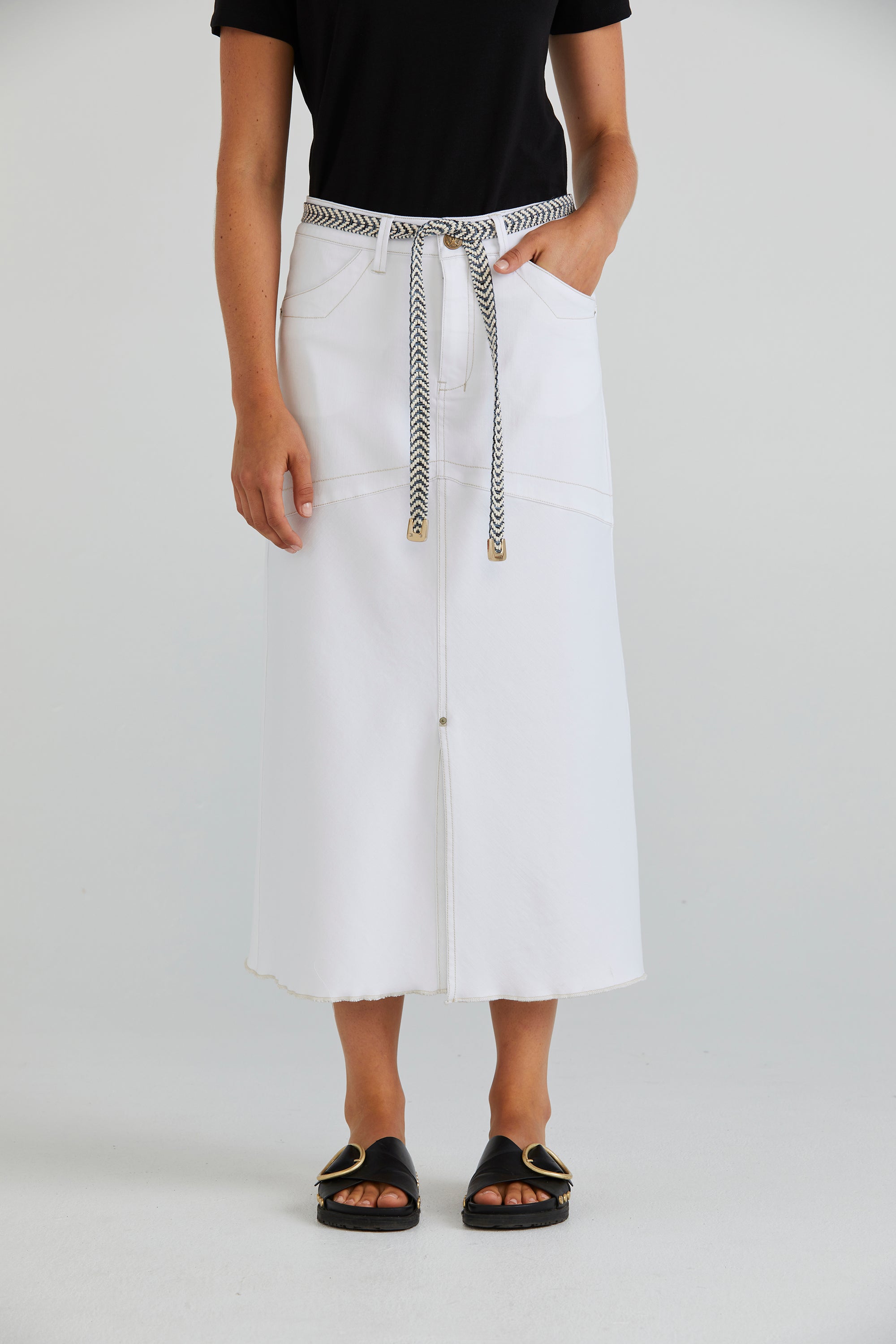 Elevate your denim collection with the Rhode Skirt, a midi-length design crafted with a contrast top-stitched panels for added detail. The bias-cut lower skirt and shaped back darts ensure an exceptionally flattering fit. Complete with a splits, featuring rivet detail and a removable herringbone weave belt with metal tie ends, this skirt exudes both style and versatility.