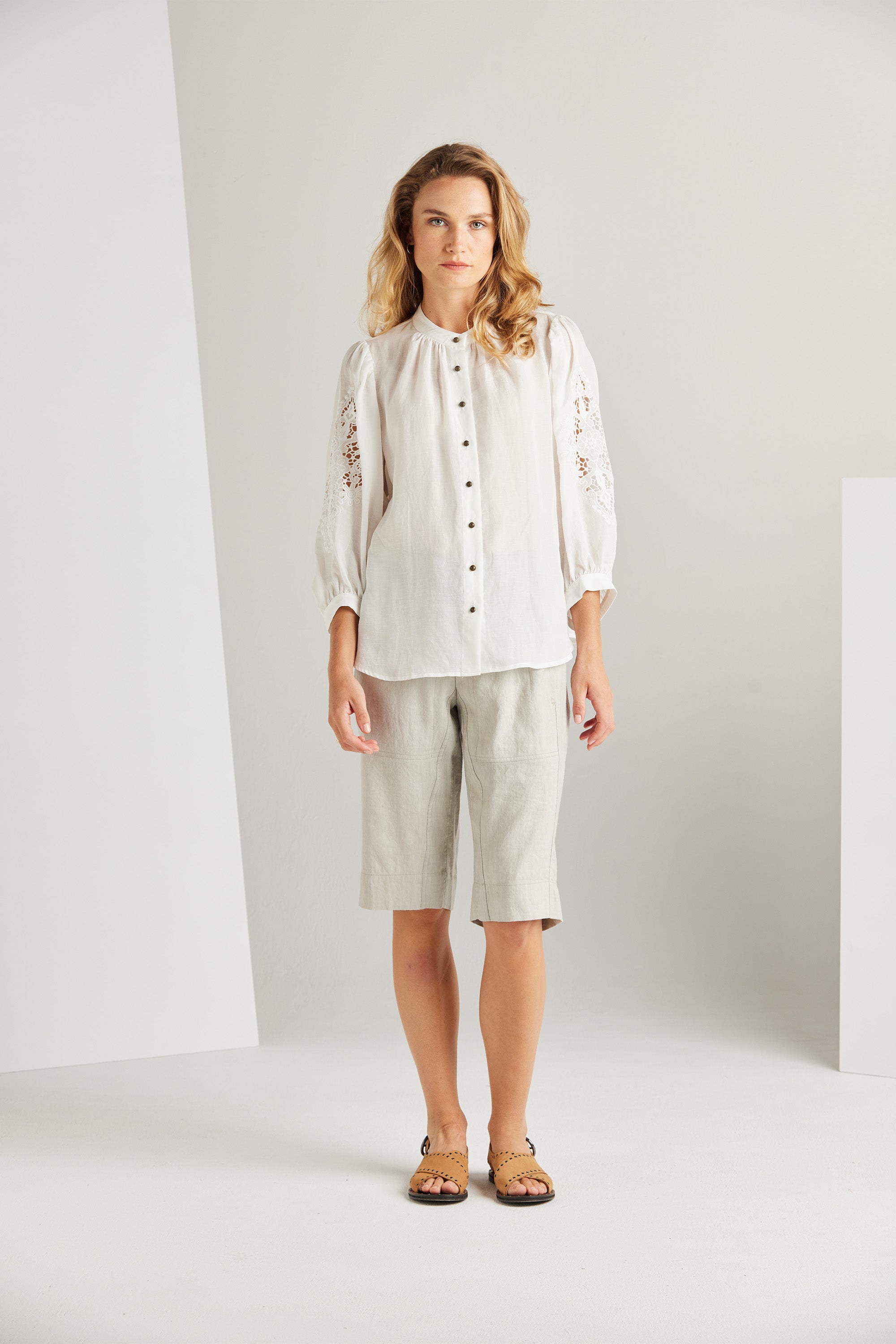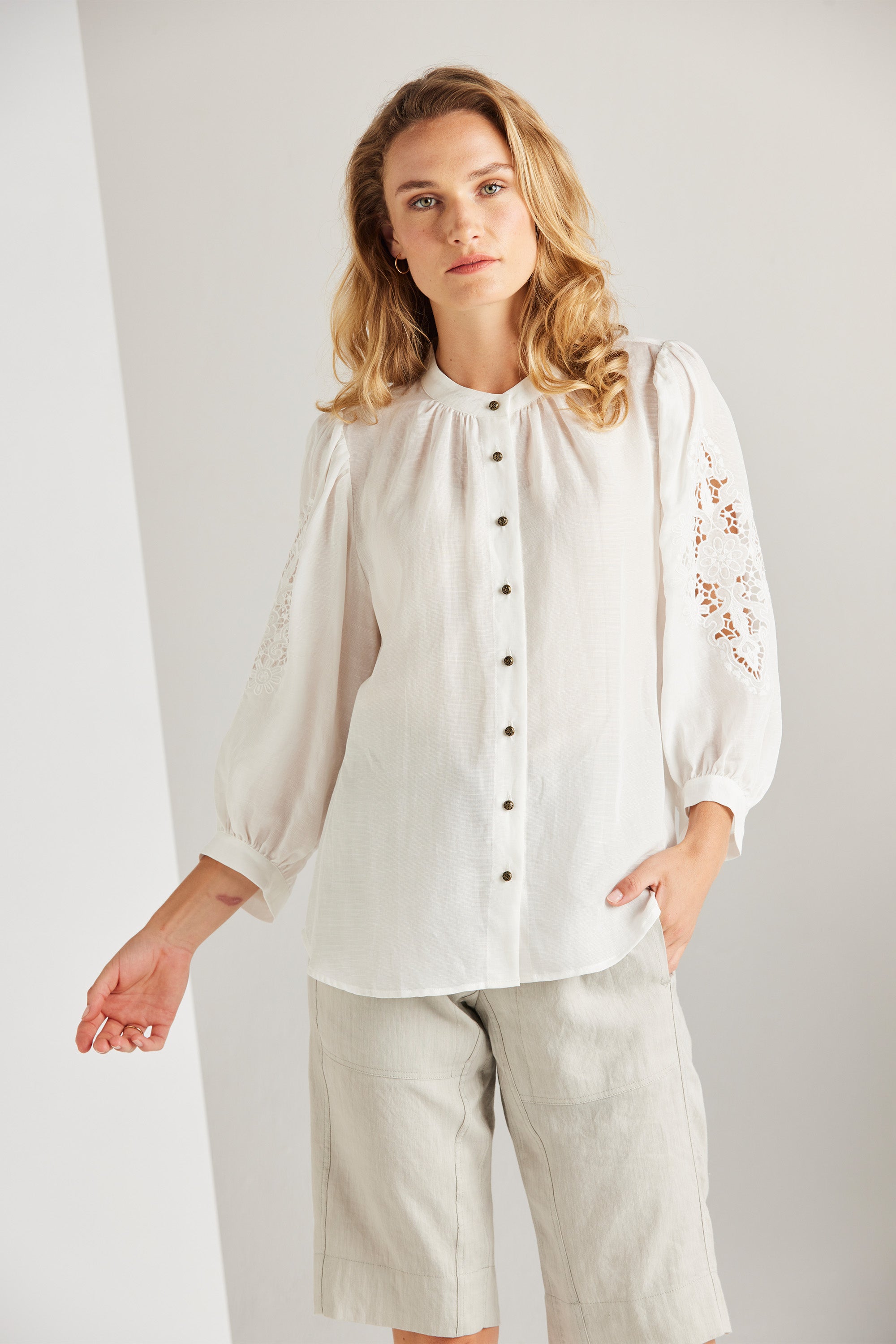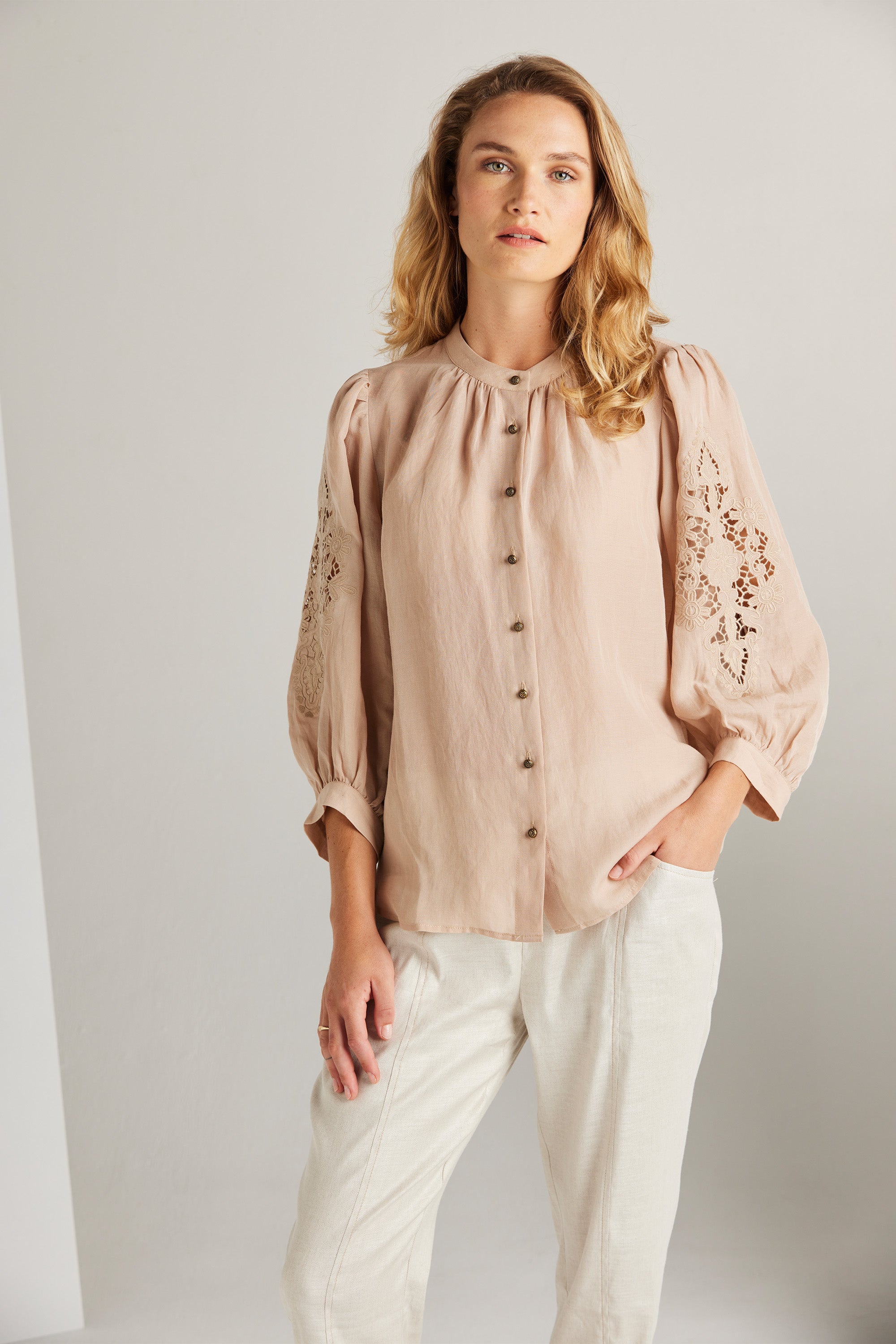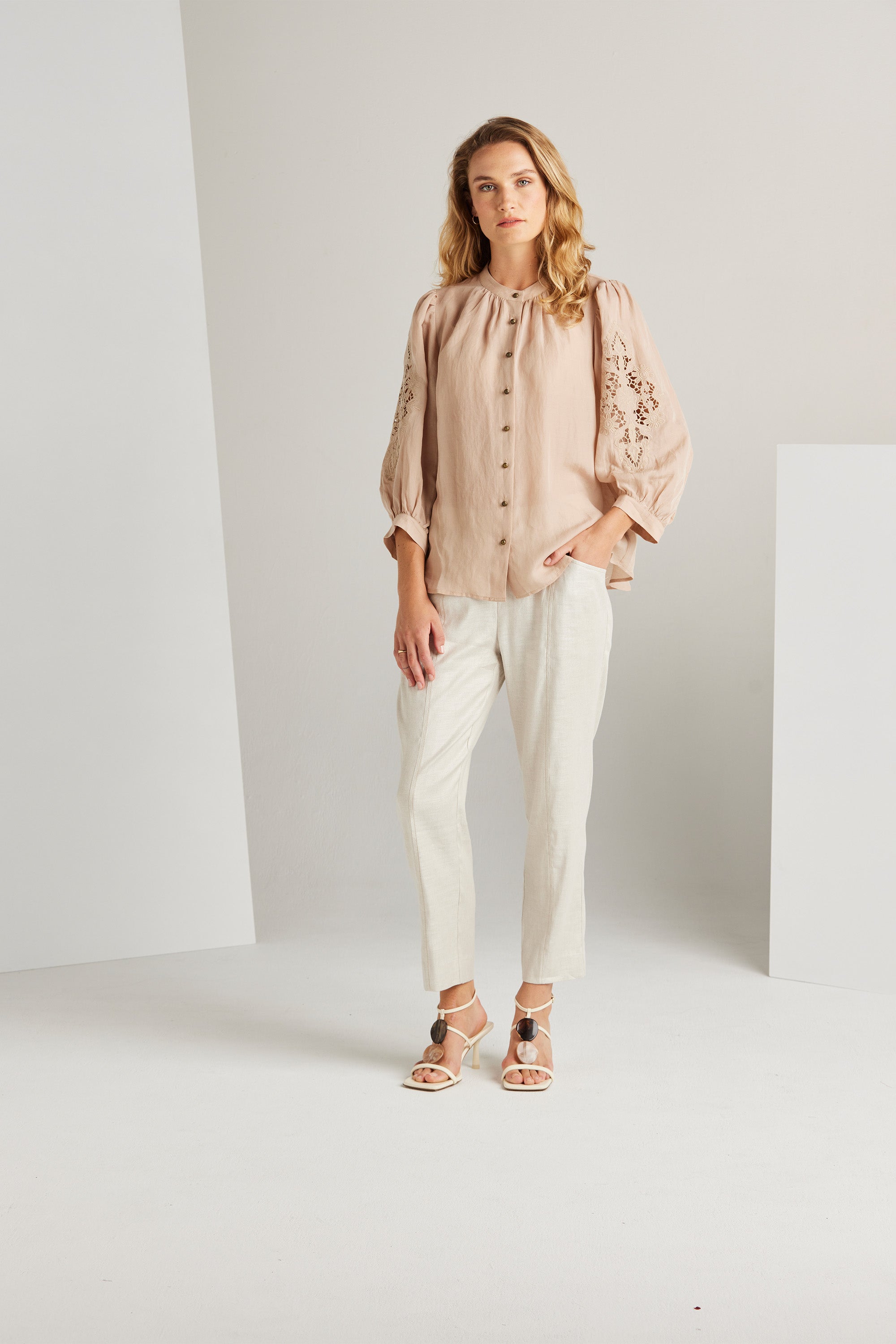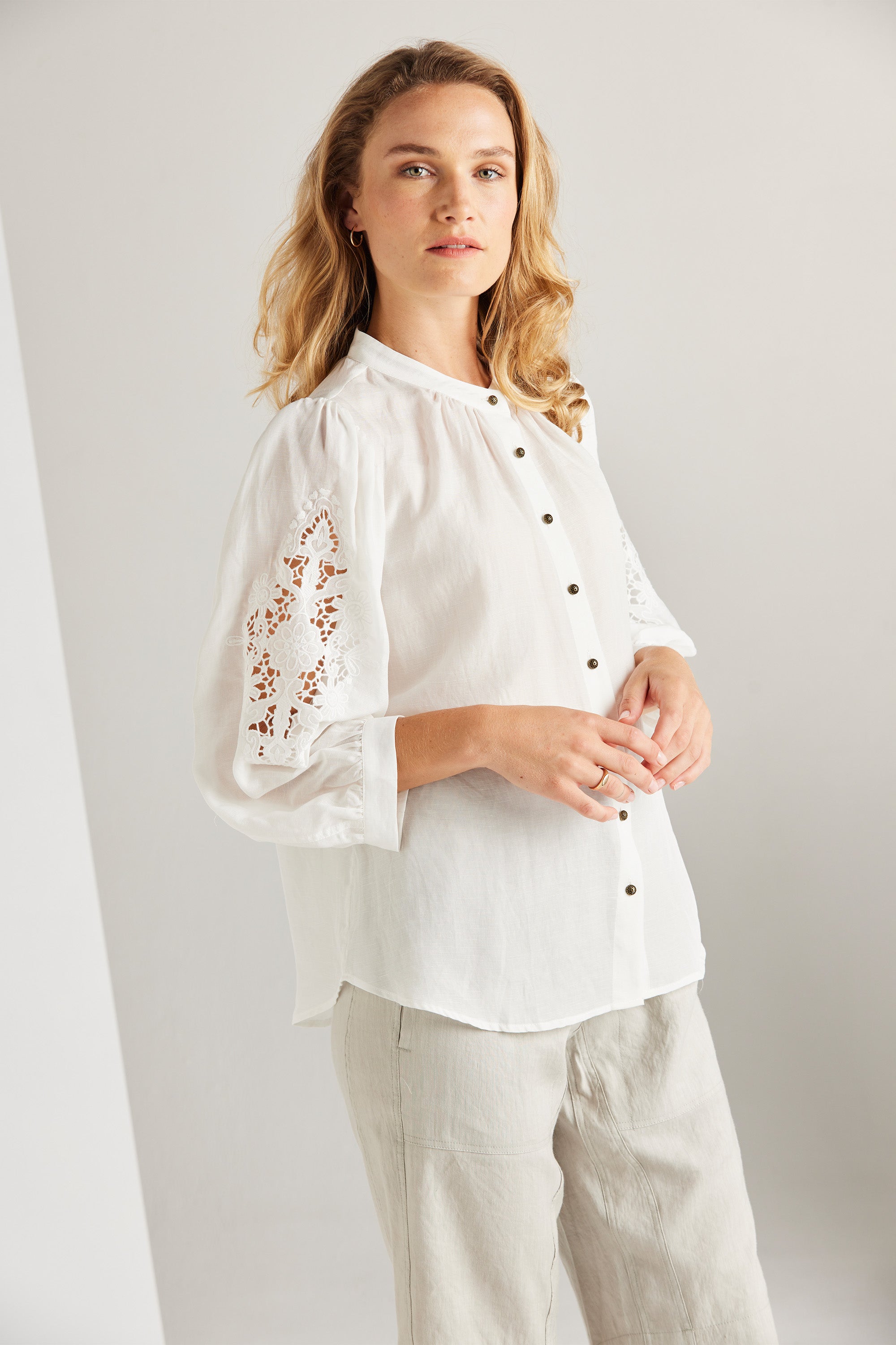 The Riley Shirt is a must-have for spring and can be worn for both work and leisure. Its design celebrates femininity, with exquisite ornate embroidery on the sleeves, a central front placket adorned with charming dome-headed metal buttons, and a delicate collar stand. Pair it with jeans or our linen suiting for a sophisticated and fashionable ensemble.