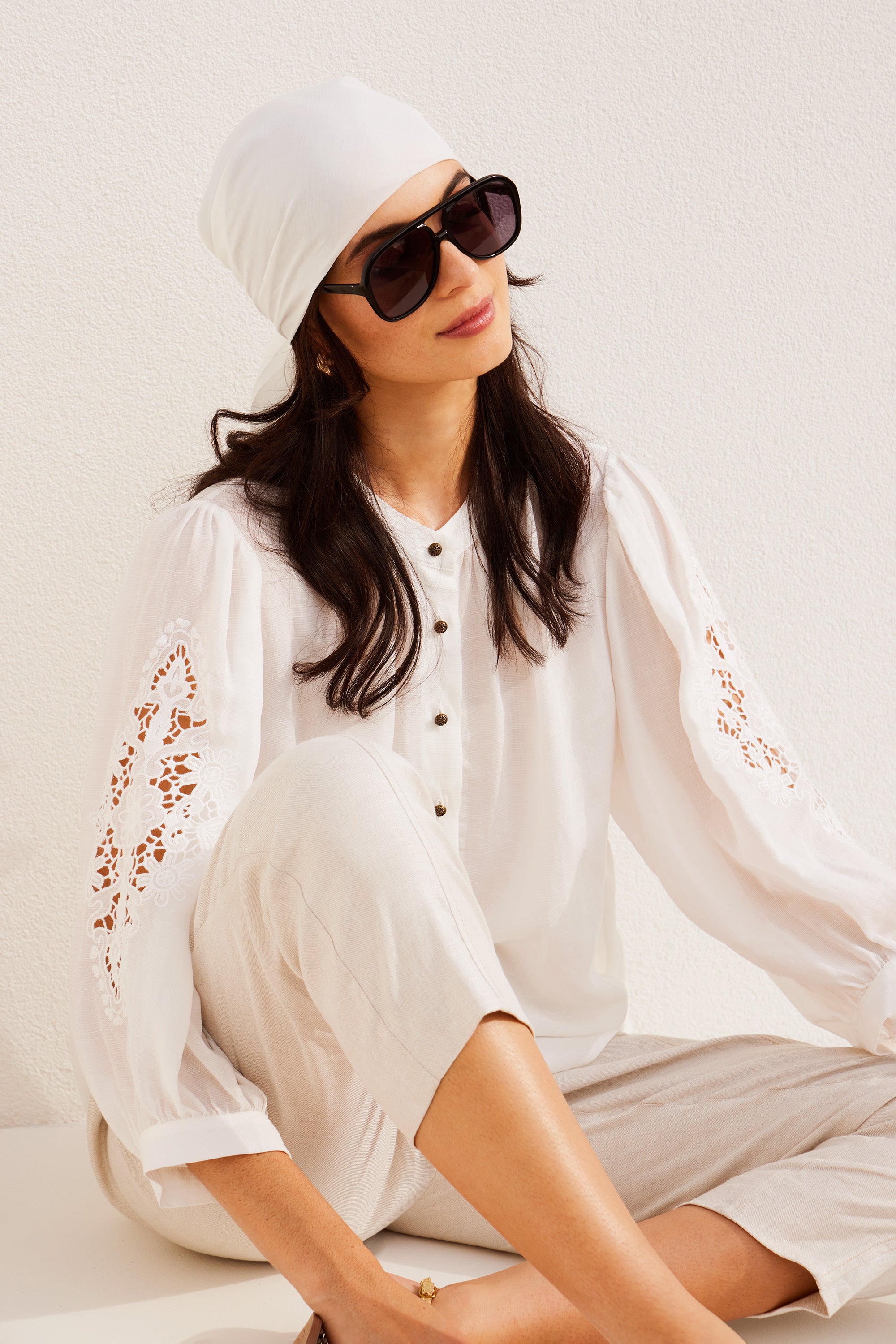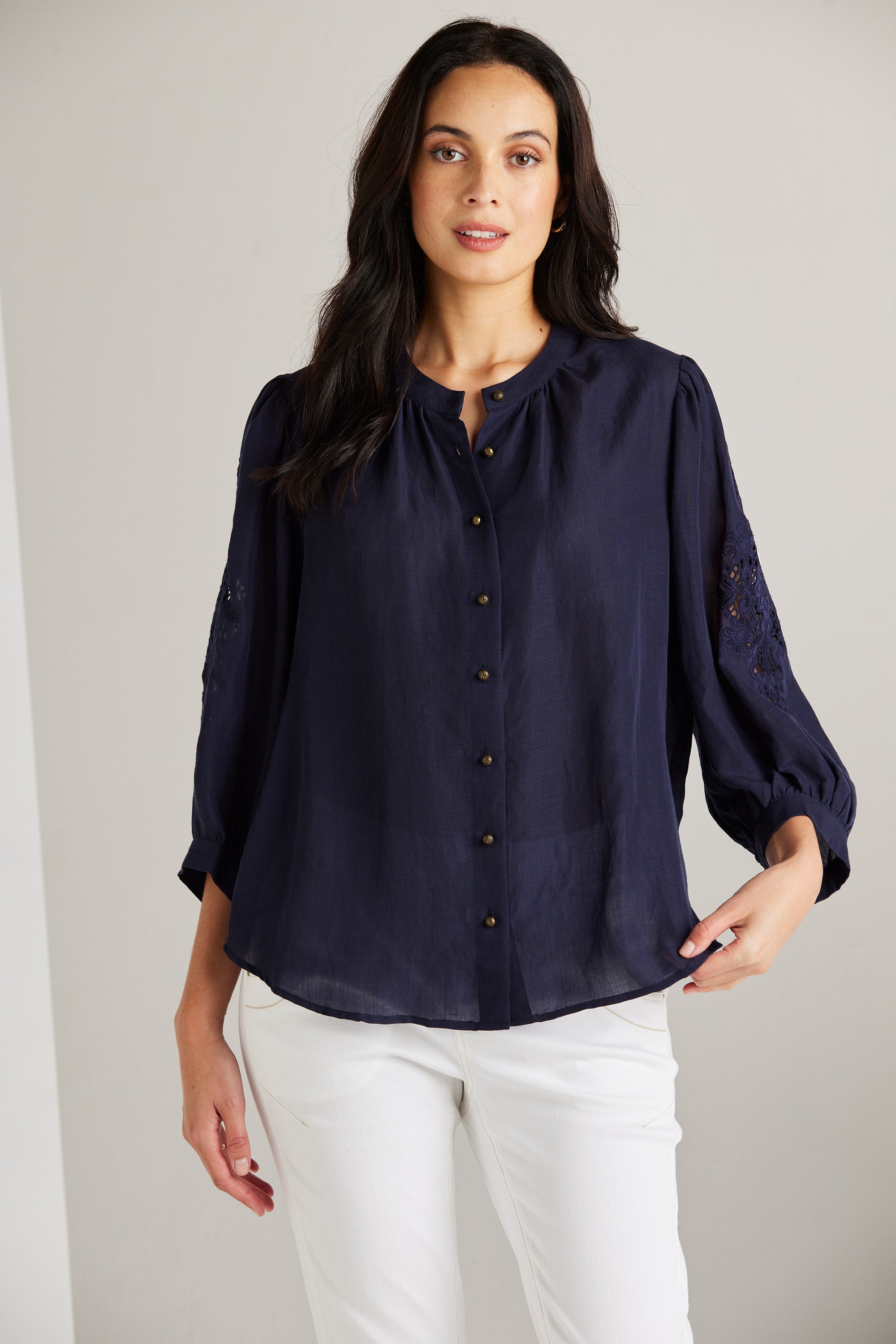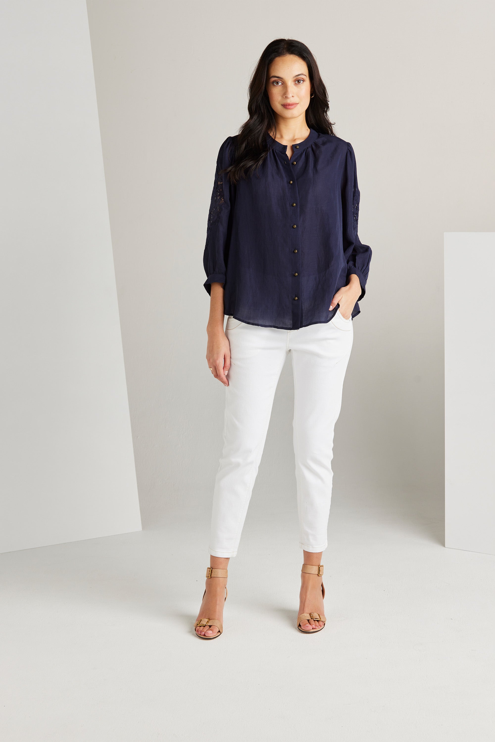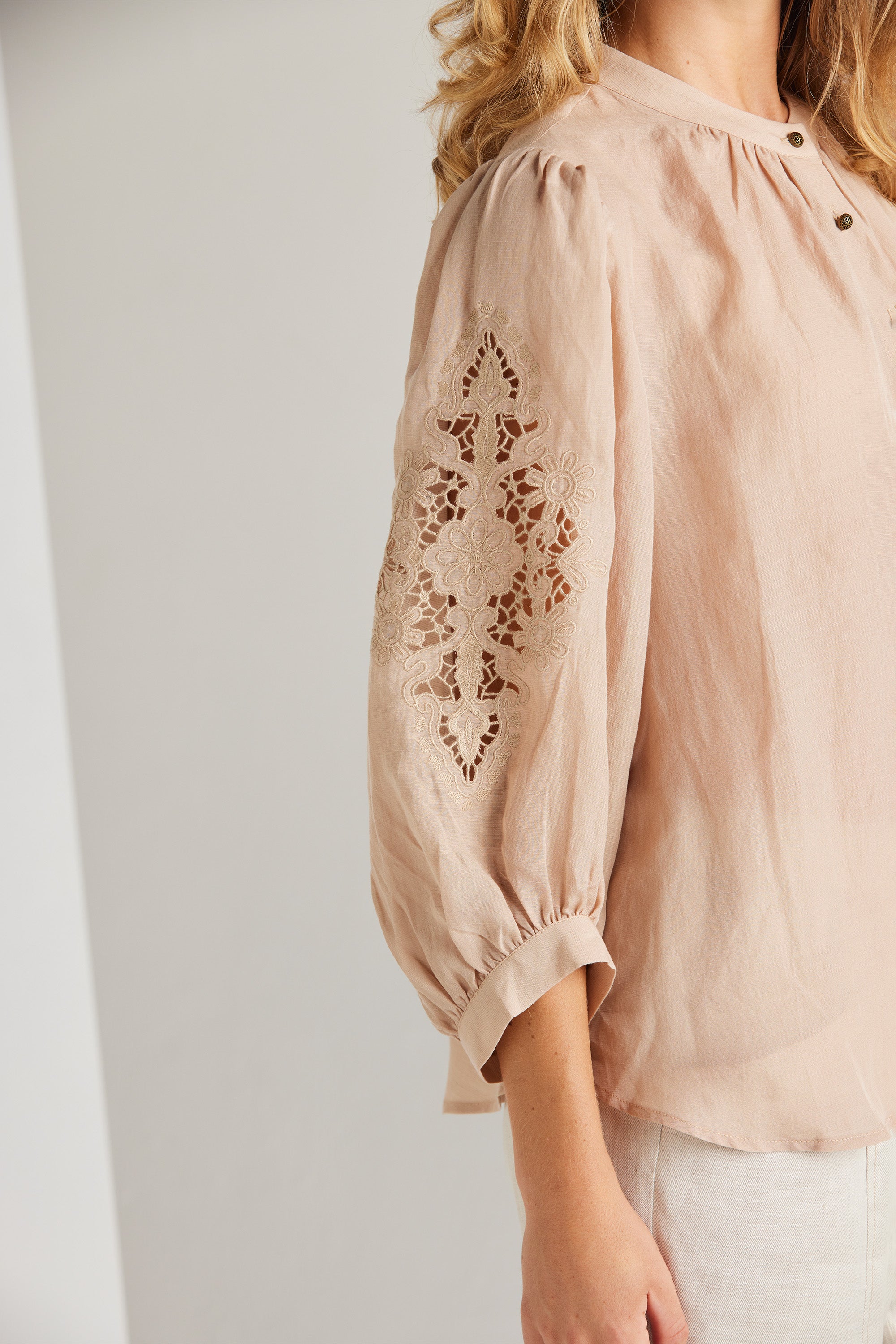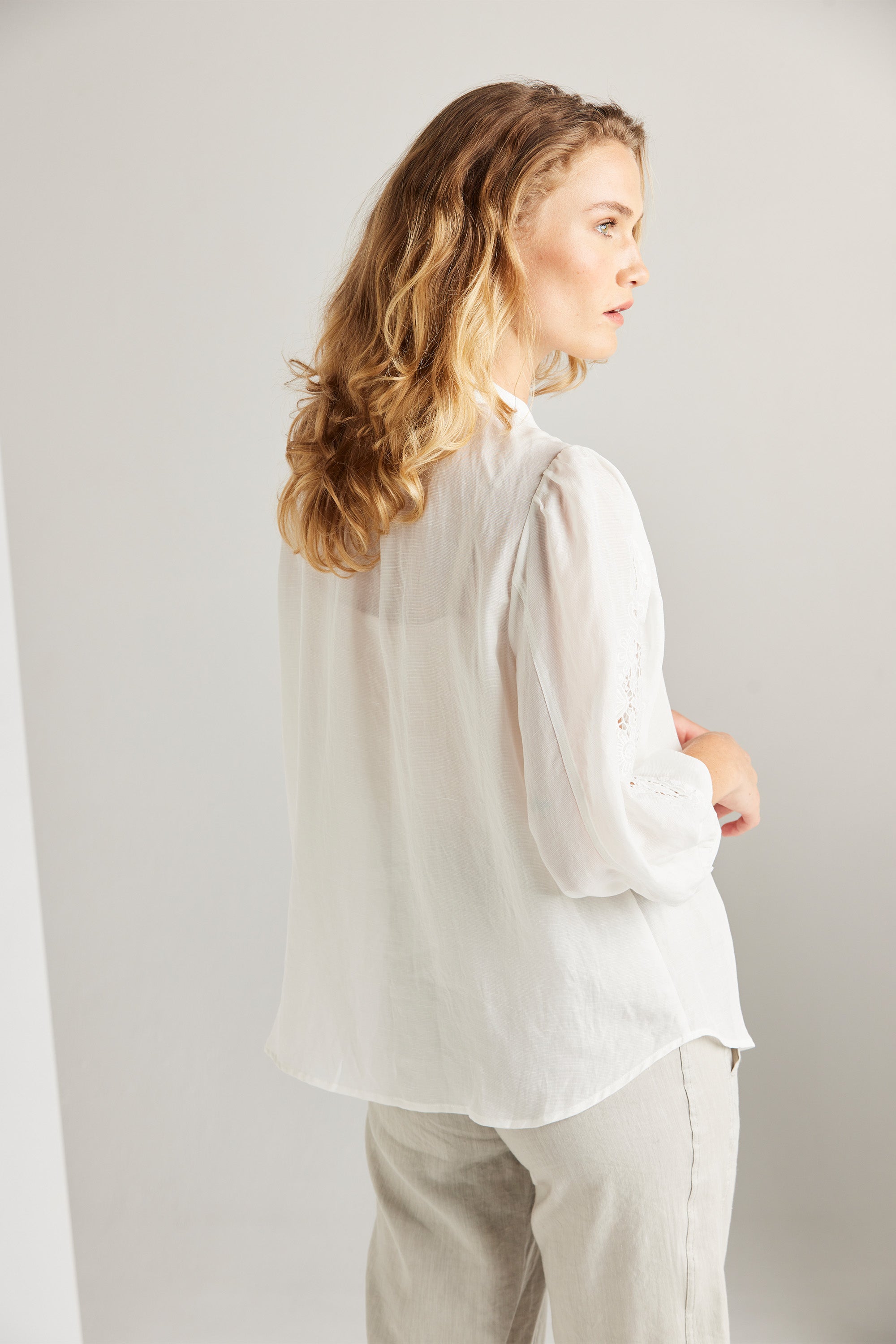The Riley Shirt is a must-have for spring and can be worn for both work and leisure. Its design celebrates femininity, with exquisite ornate embroidery on the sleeves, a central front placket adorned with charming dome-headed metal buttons, and a delicate collar stand. Pair it with jeans or our linen suiting for a sophisticated and fashionable ensemble.