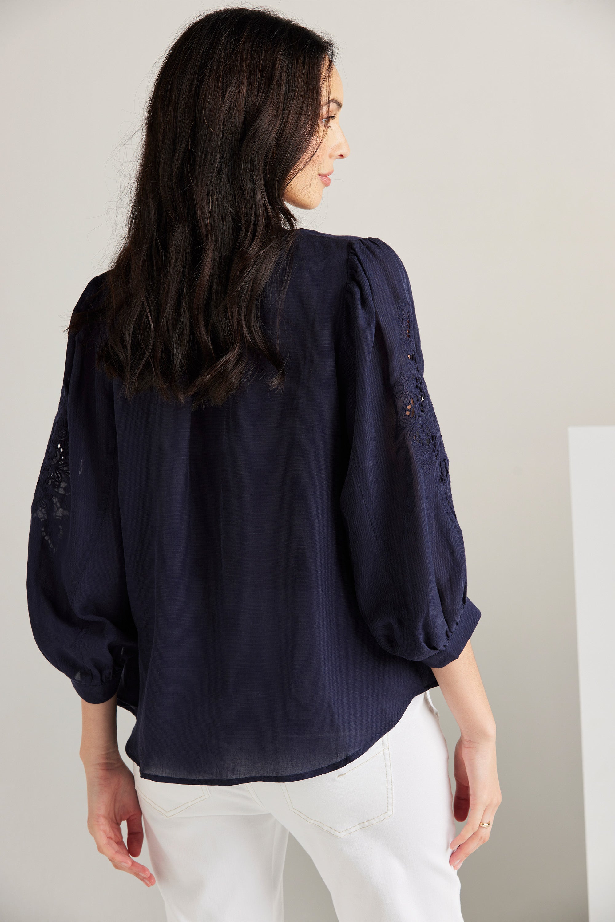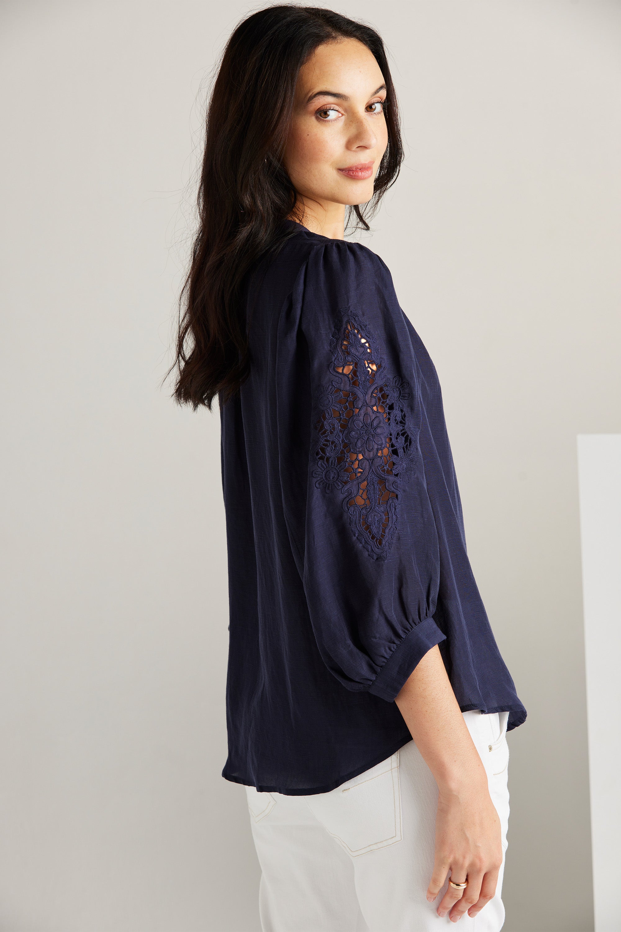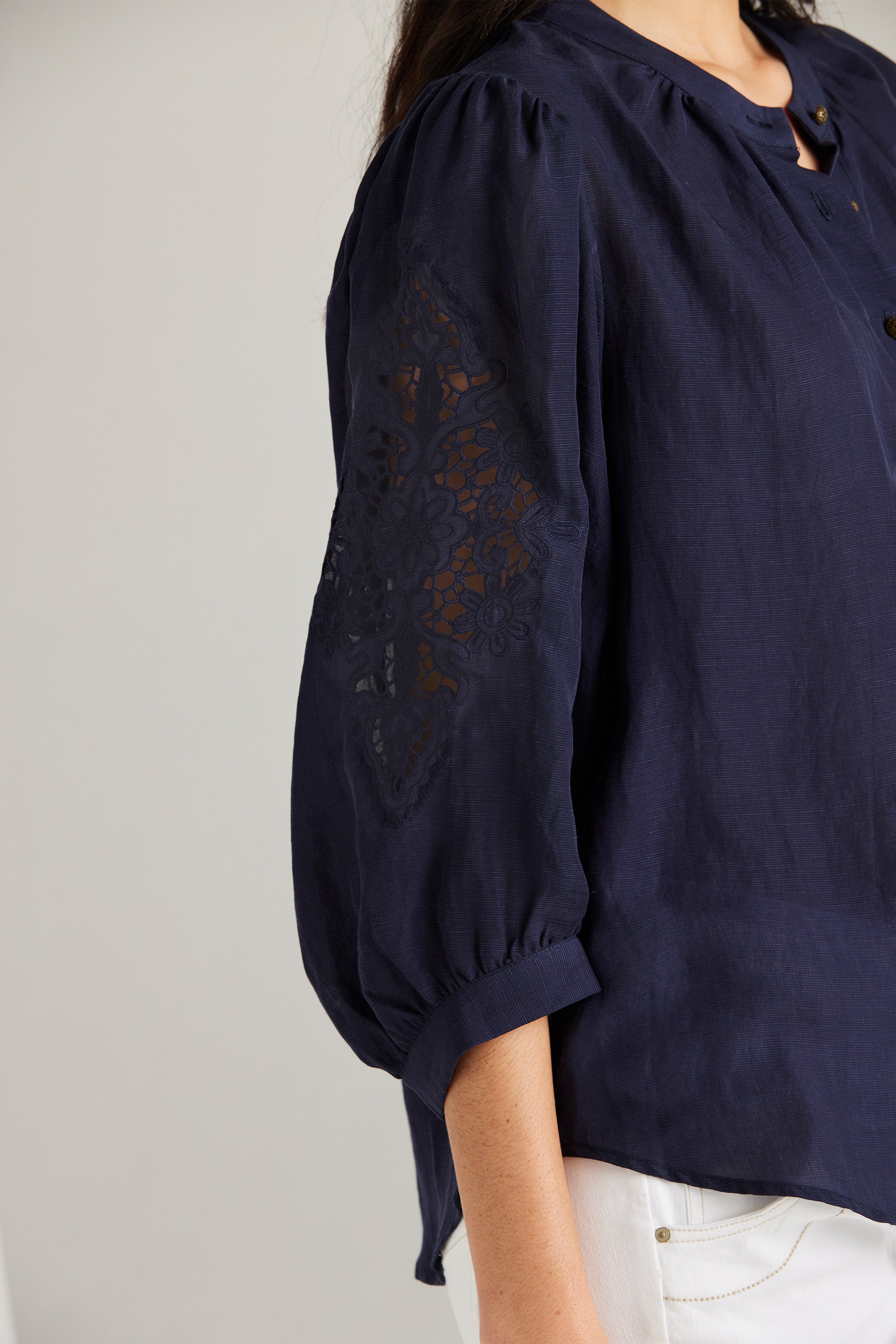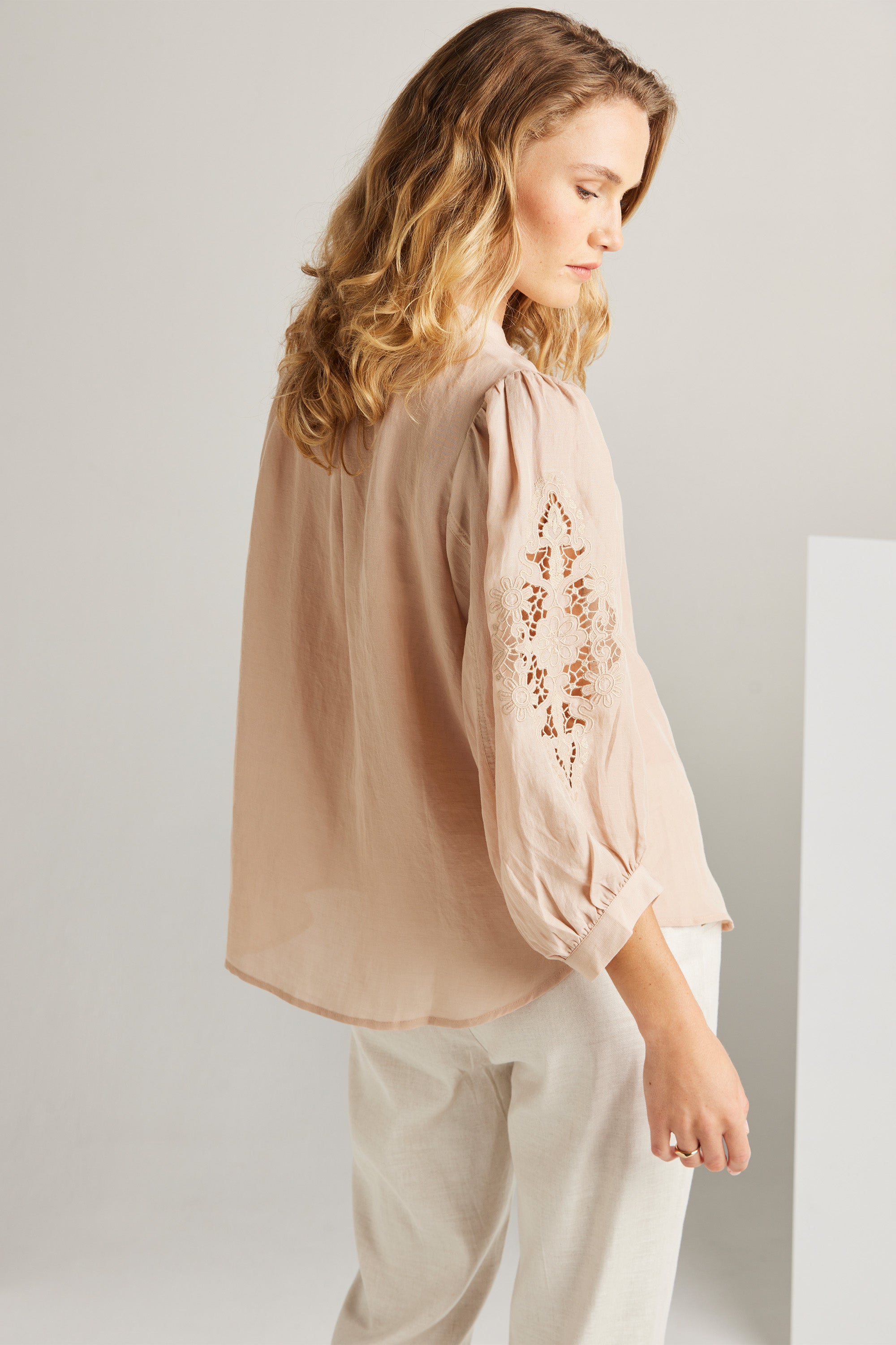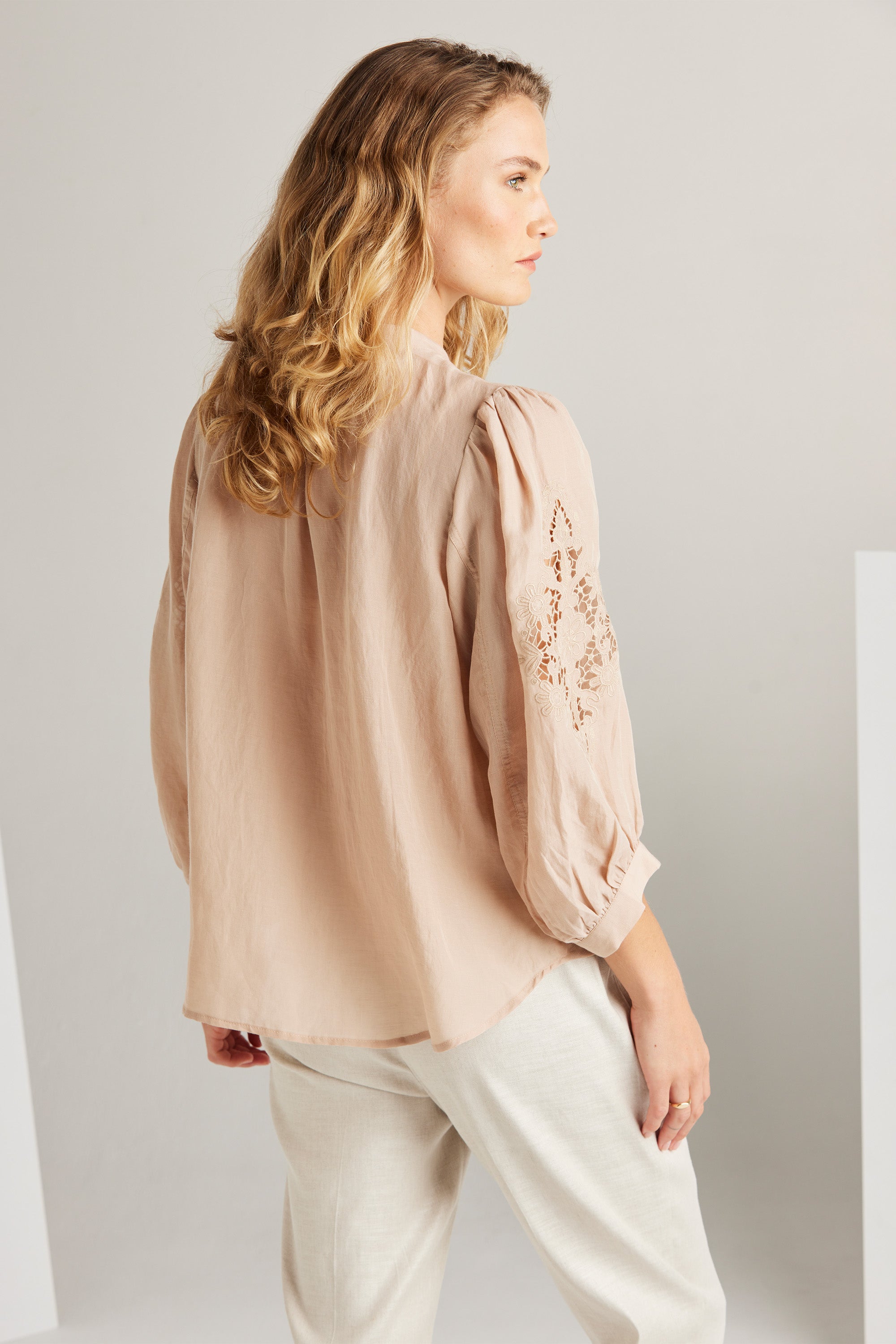 The Riley Shirt is a must-have for spring and can be worn for both work and leisure. Its design celebrates femininity, with exquisite ornate embroidery on the sleeves, a central front placket adorned with charming dome-headed metal buttons, and a delicate collar stand. Pair it with jeans or our linen suiting for a sophisticated and fashionable ensemble.