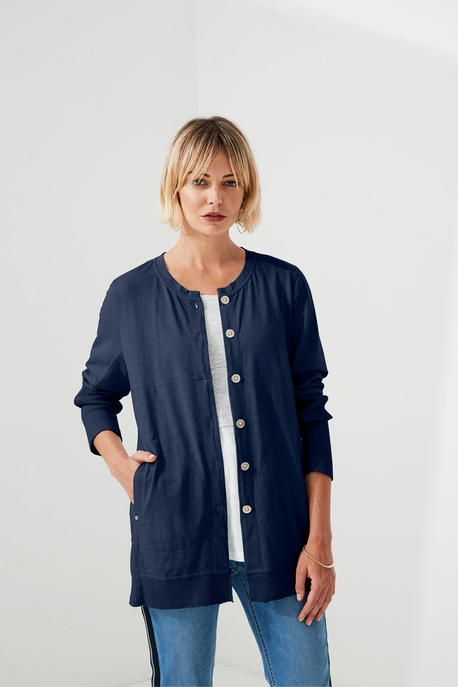 Longline cardigan available in three colours, long sleeve with ribbed cuff. Panel seams featured to create a nice contour, hemline falling below hip. Slightly distressed finish is achieved by special garment wash.