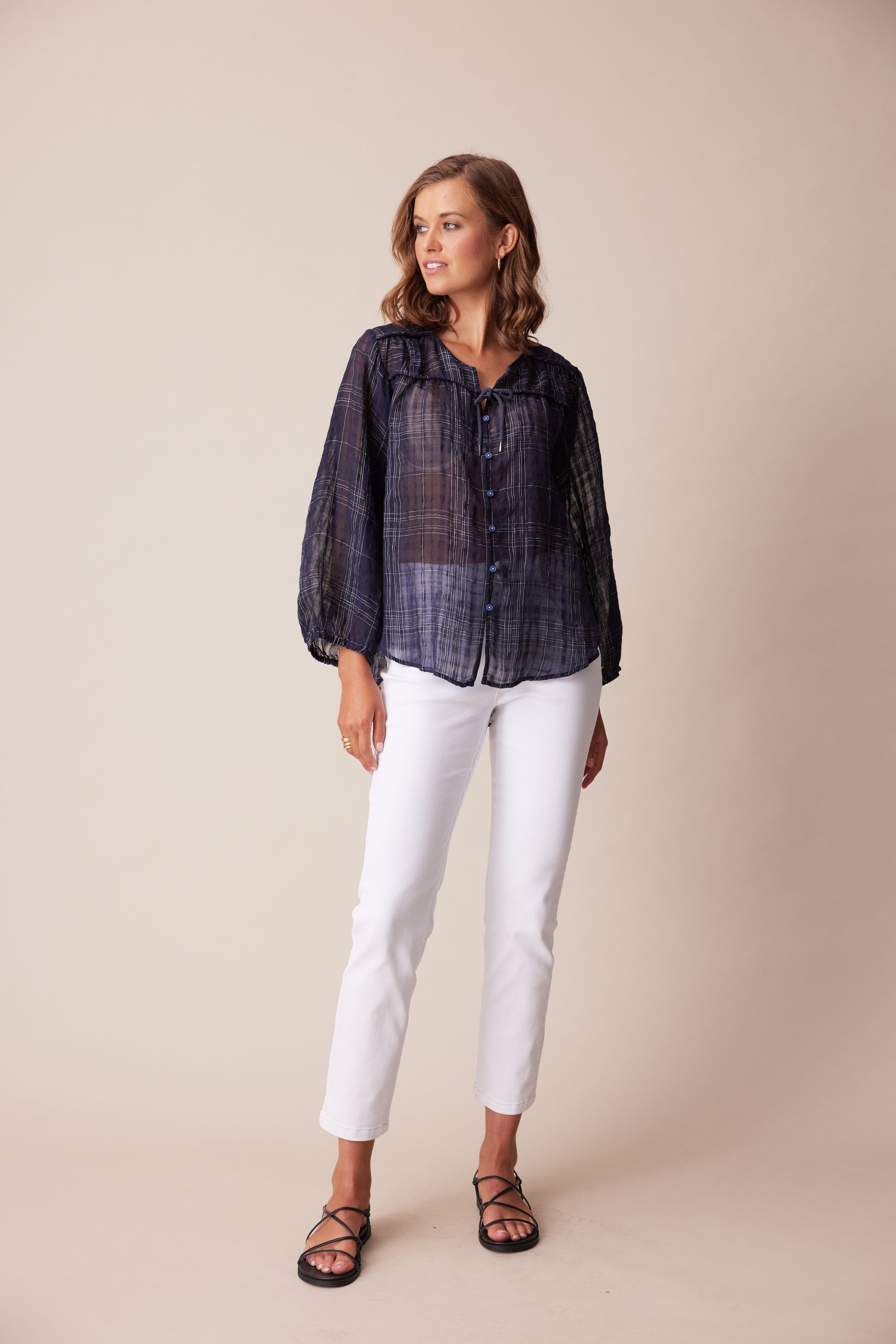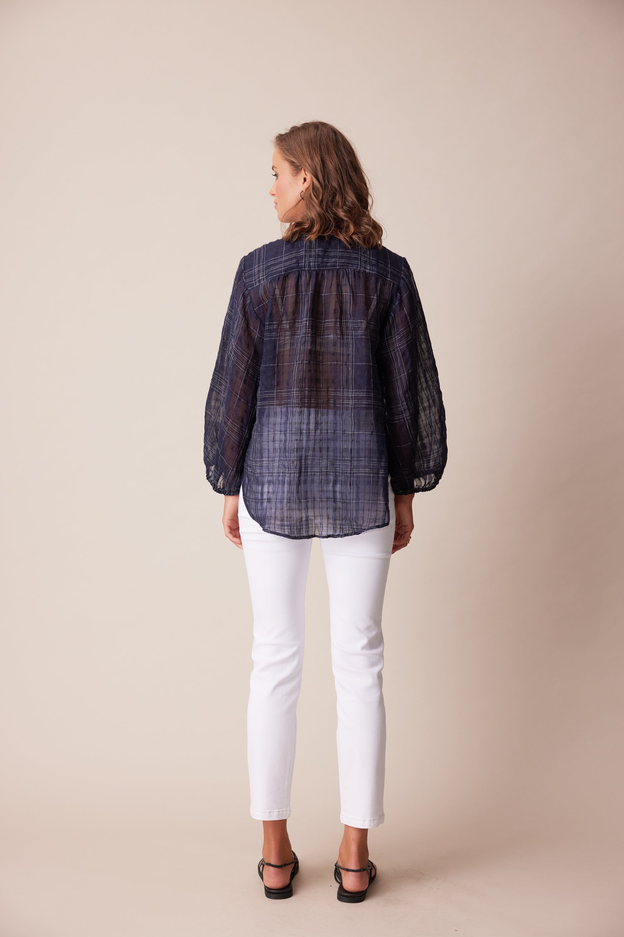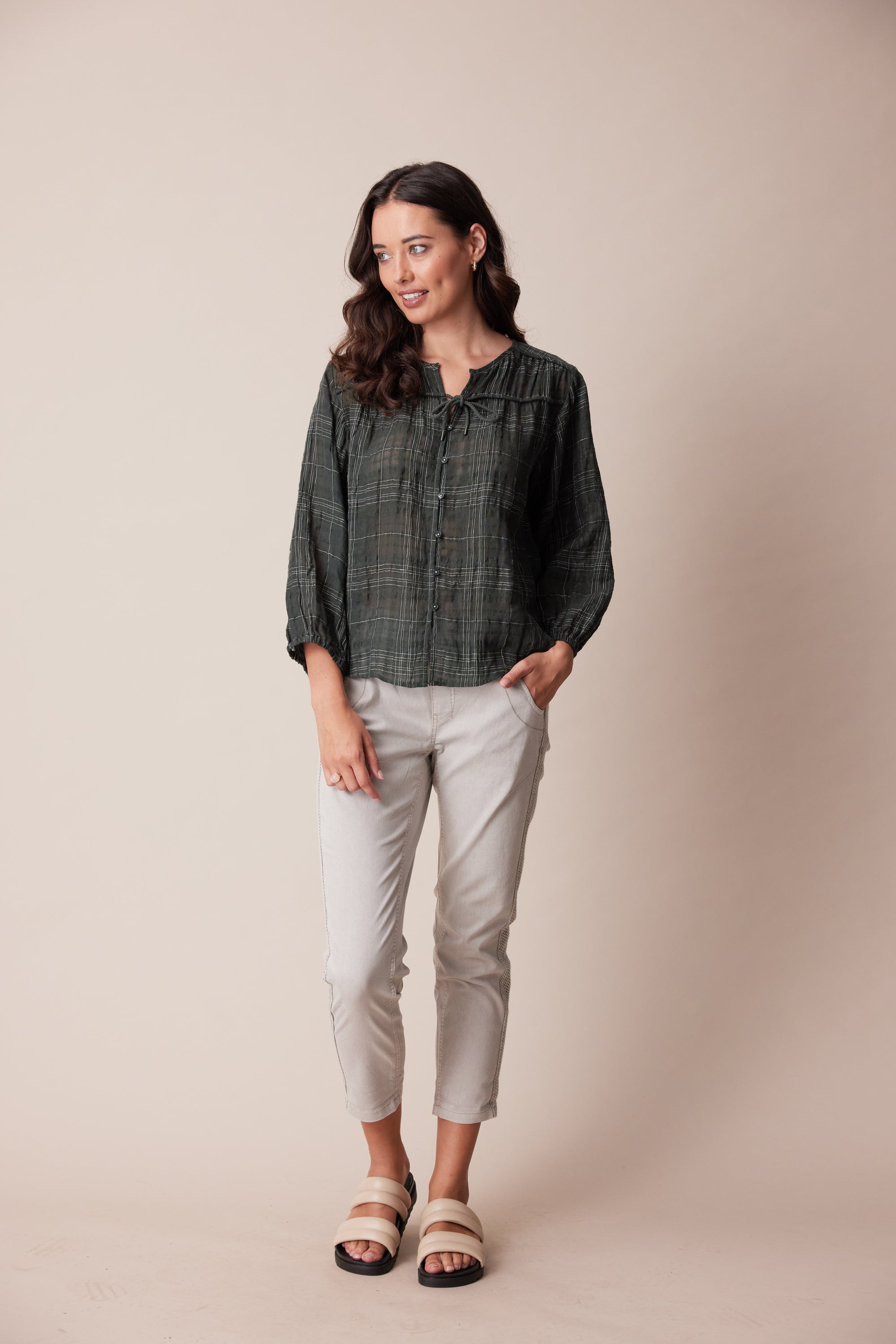 This lightweight linen blend check is beautifully formed into a loose-fitting button-through shirt. The front panels are lightly gathered over corded ties, and the neckline is finished with a narrow binding to complete the refined feminine look.