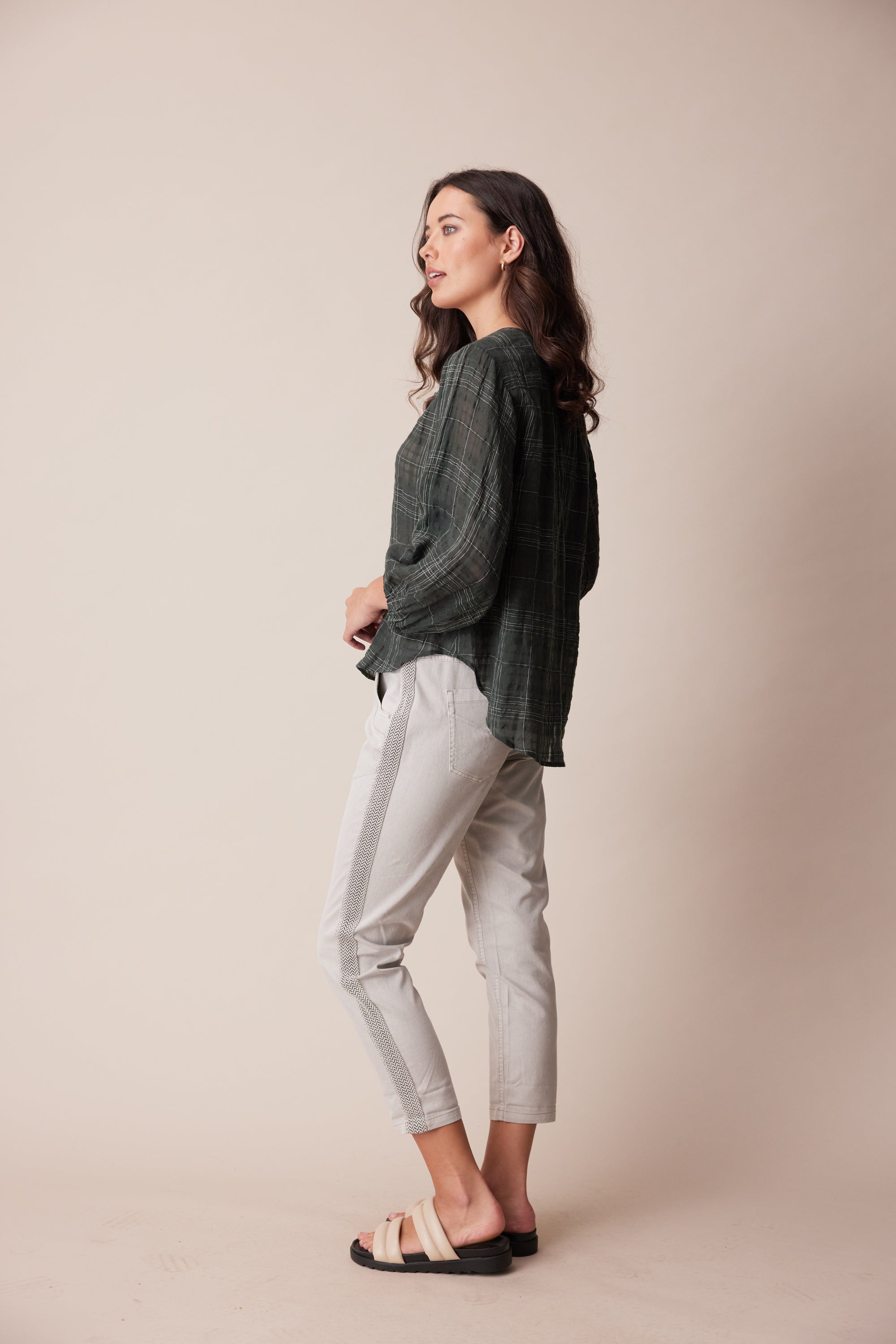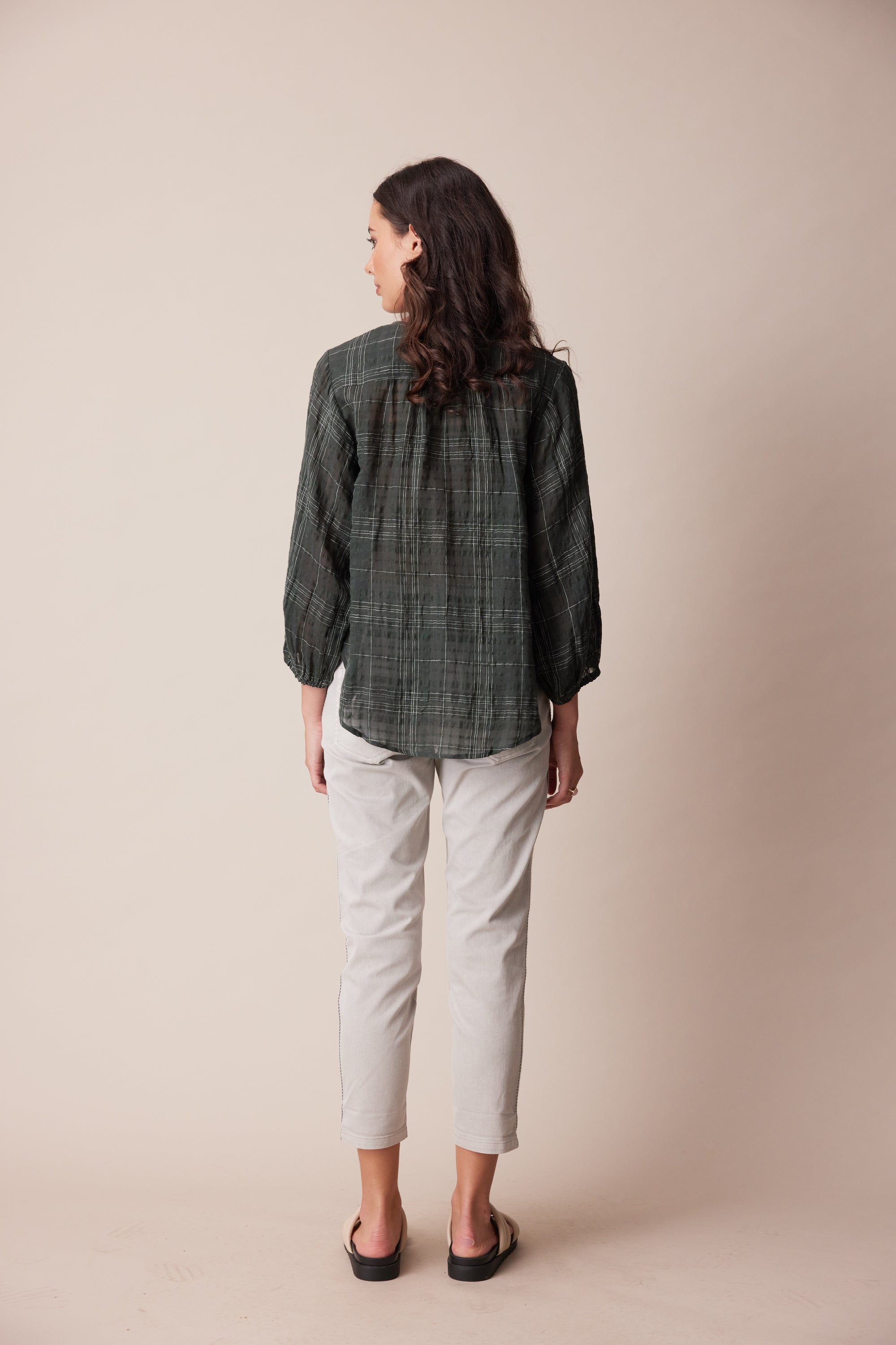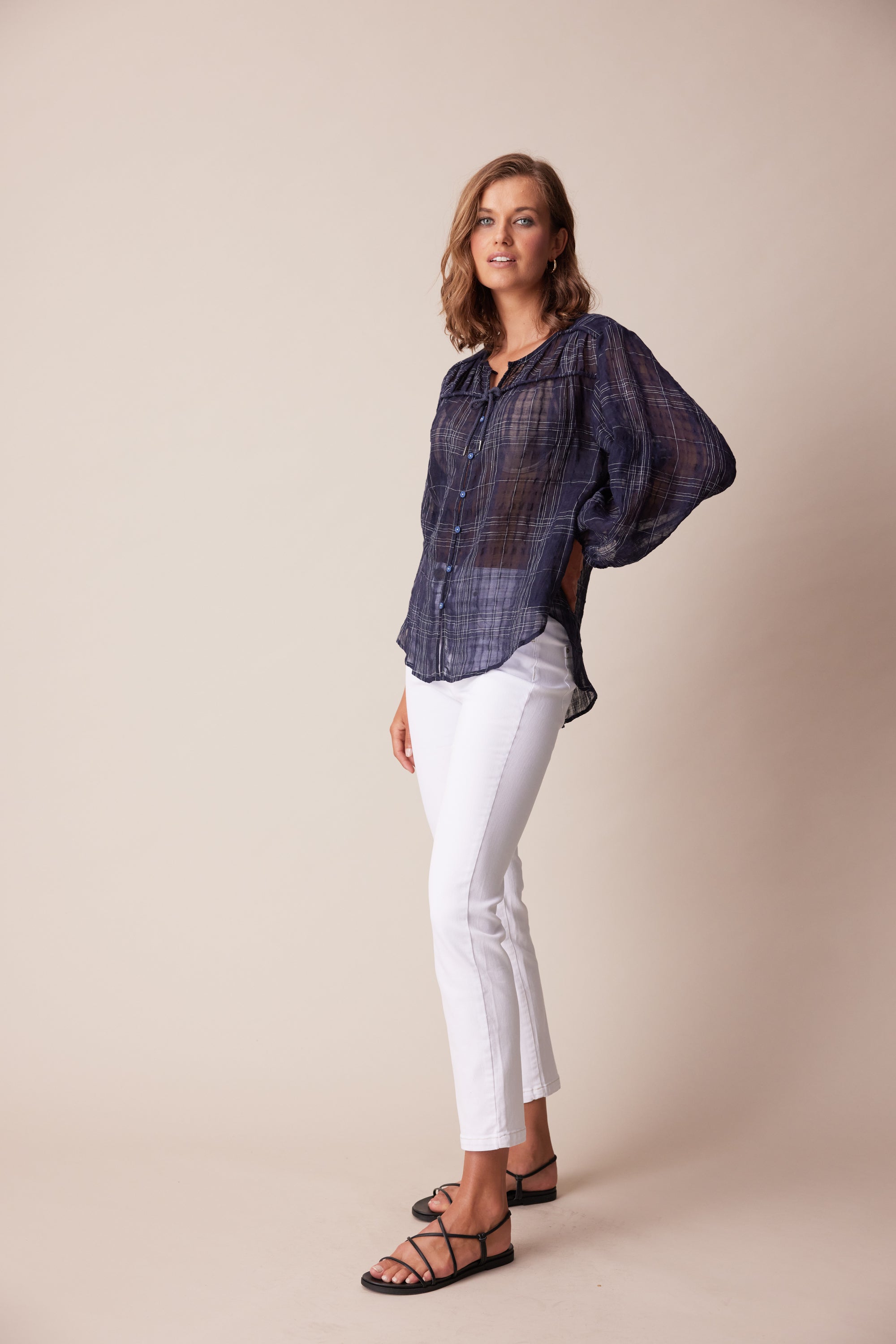 This lightweight linen blend check is beautifully formed into a loose-fitting button-through shirt. The front panels are lightly gathered over corded ties, and the neckline is finished with a narrow binding to complete the refined feminine look.