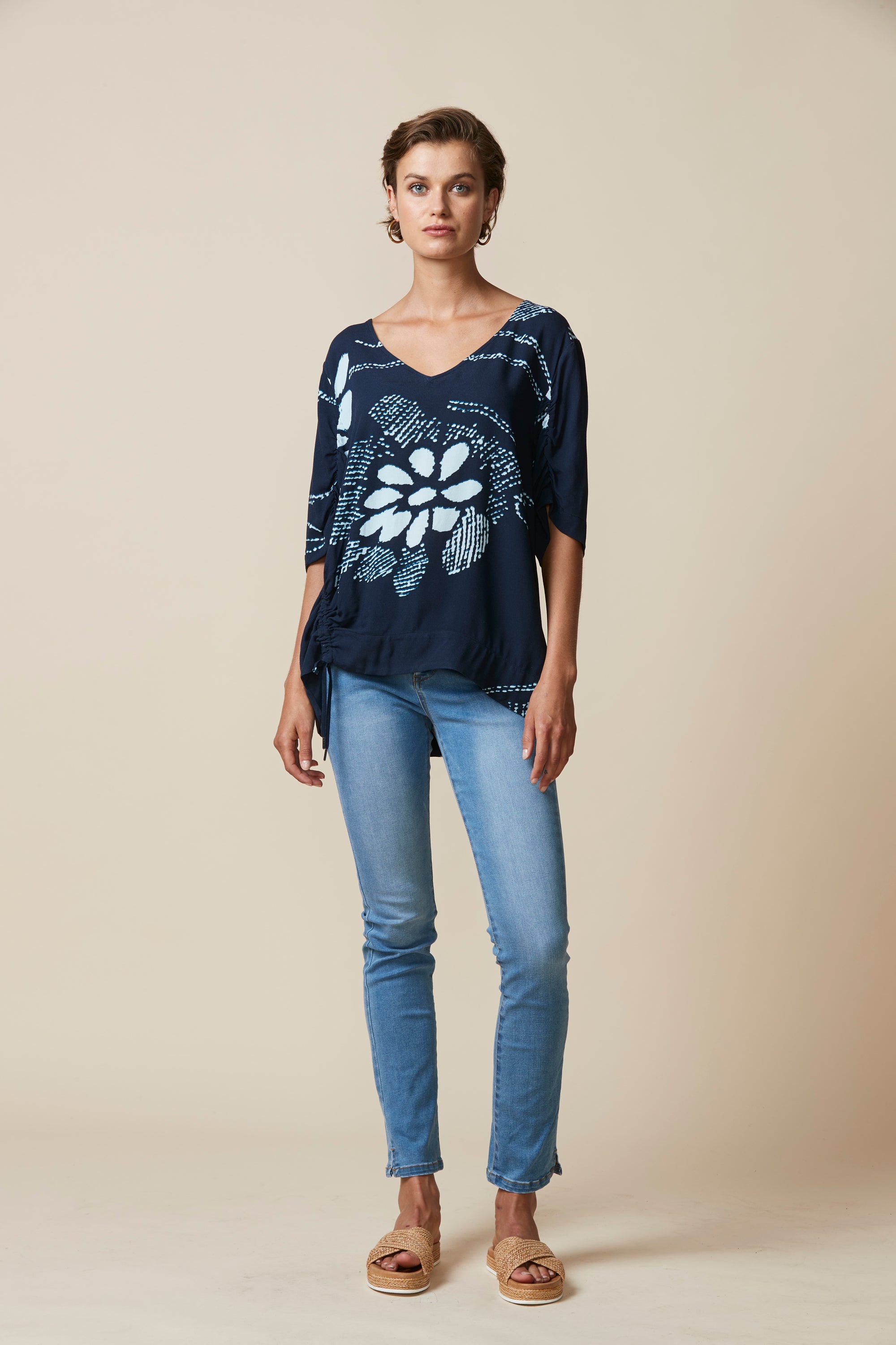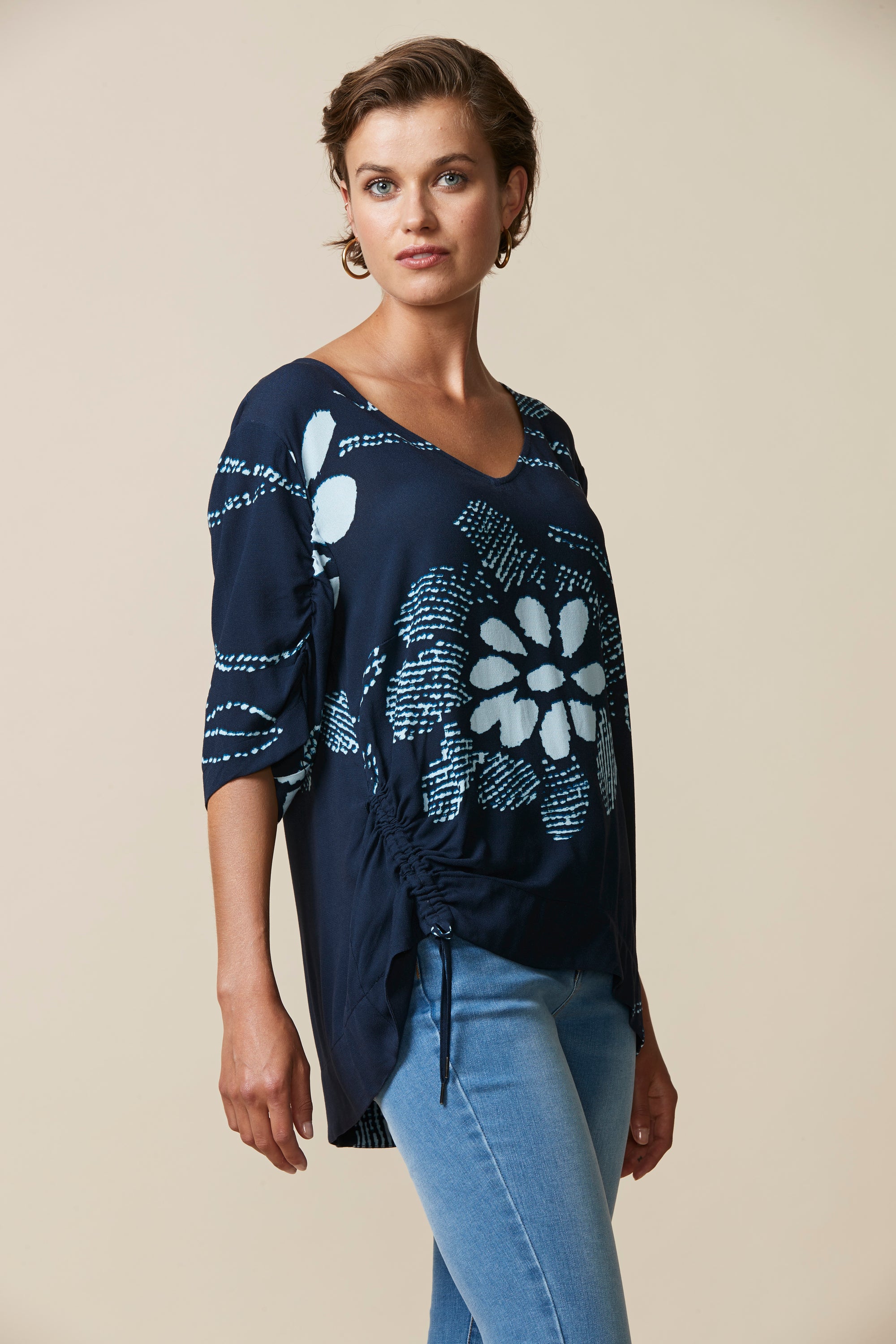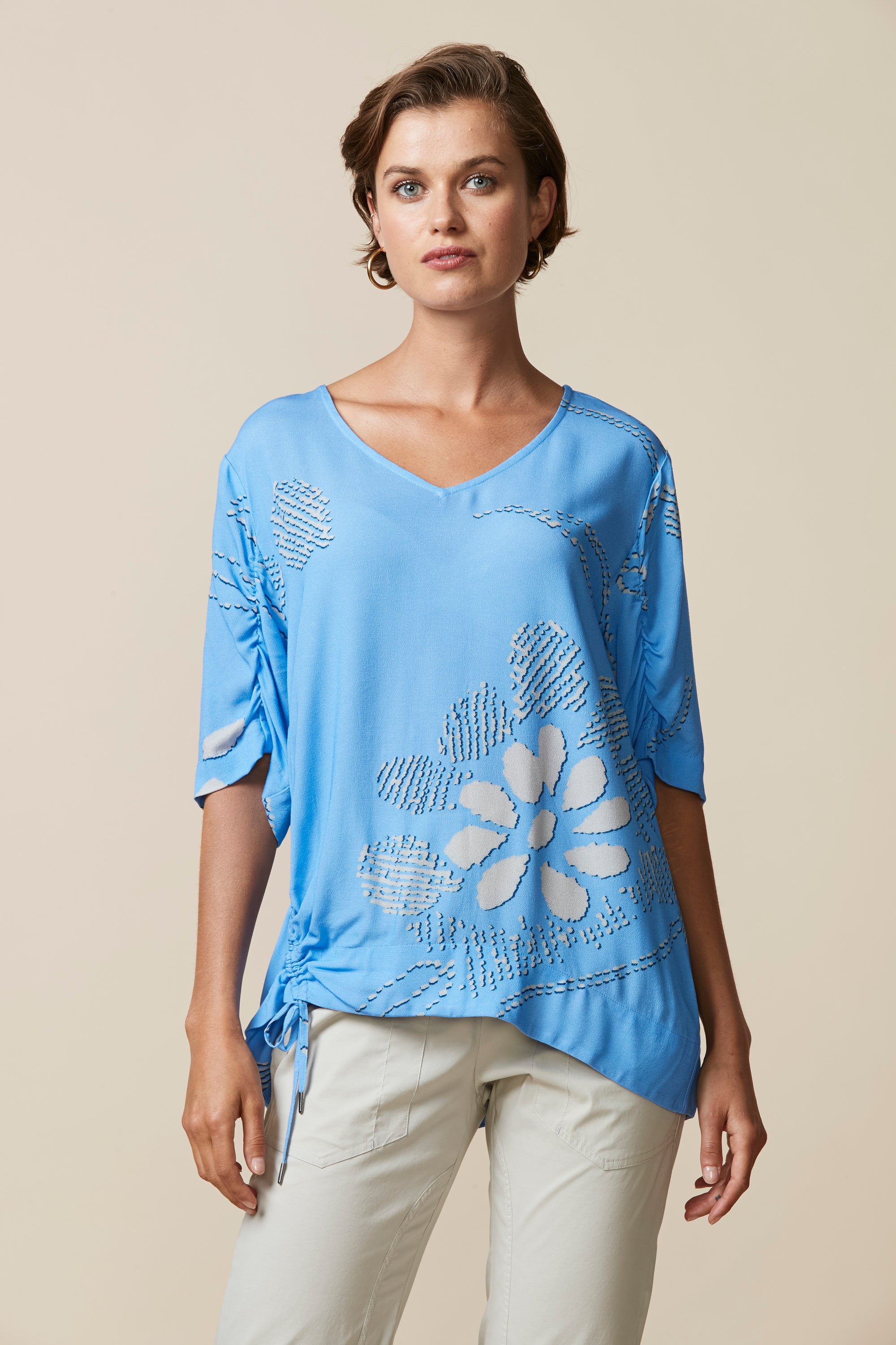Beautiful abstract floral printed top with soft drape, ruching detail on sleeves, and asymmetric drawstring detailing at hem.