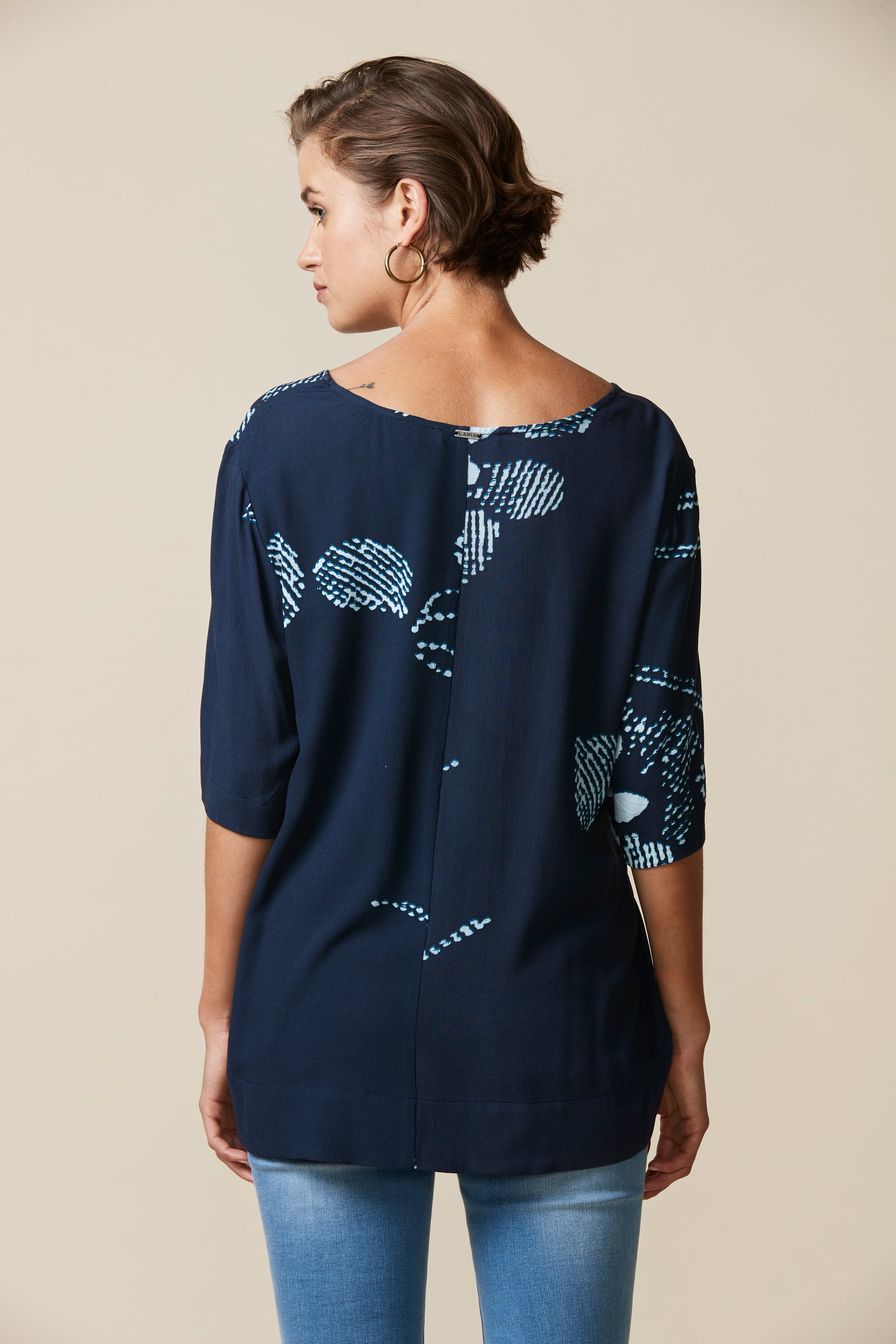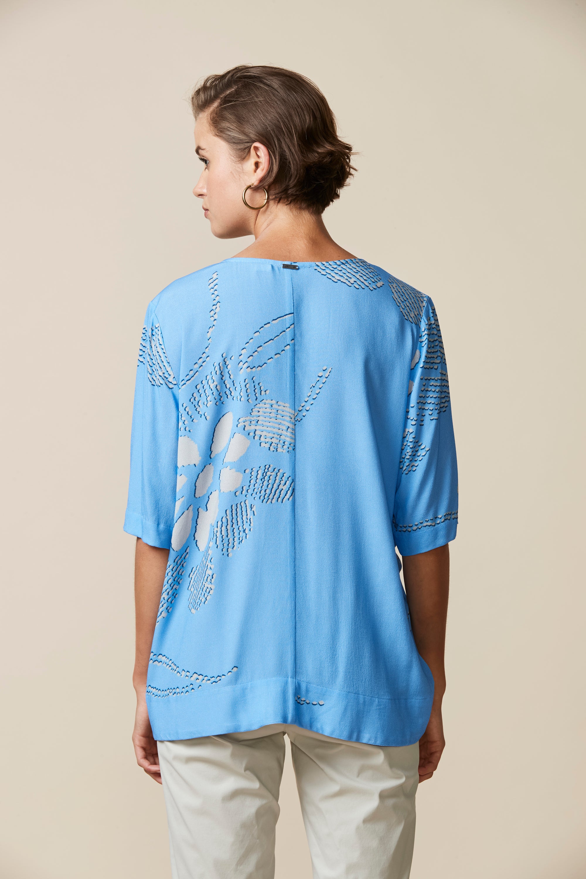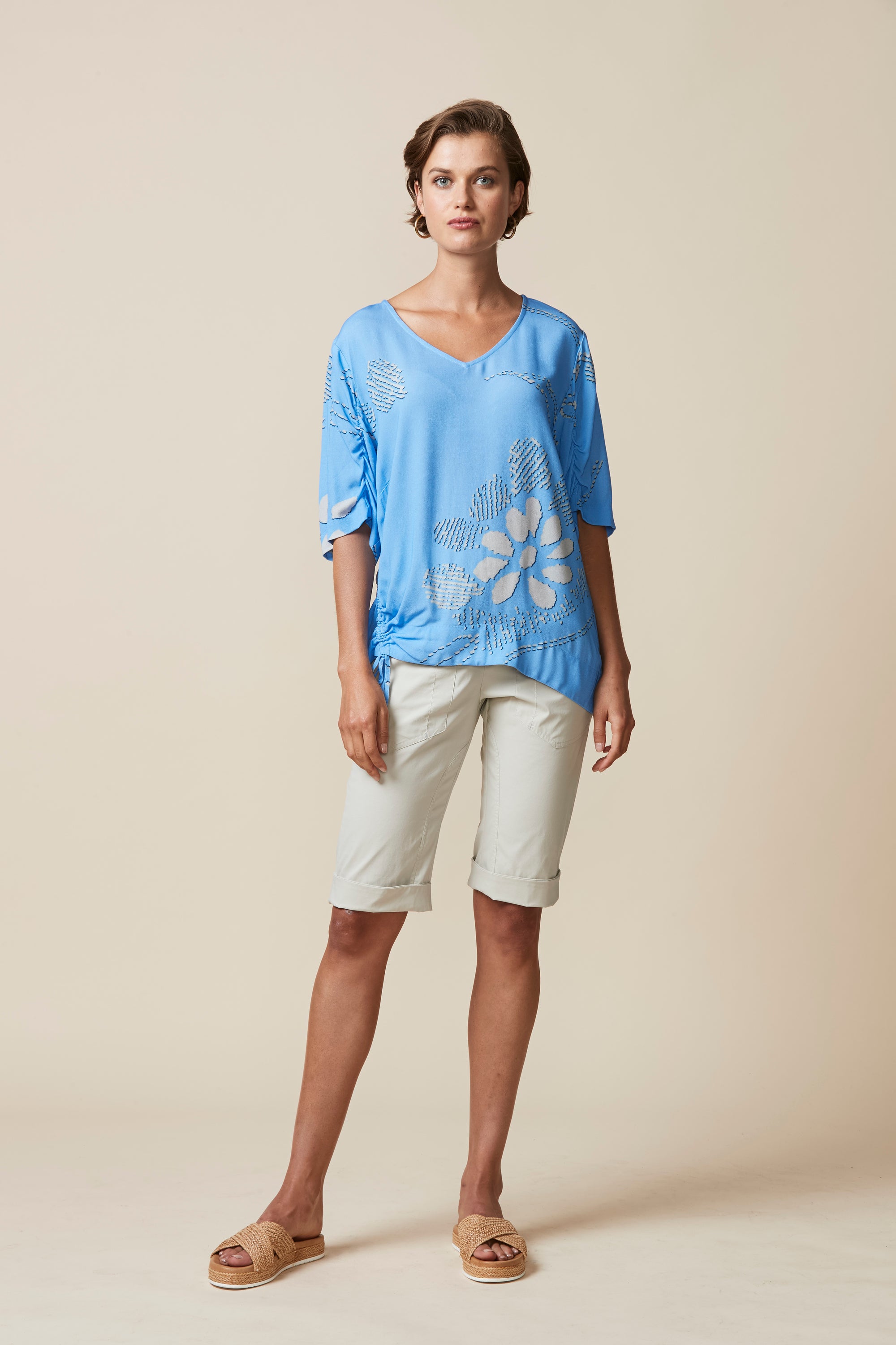 Beautiful abstract floral printed top with soft drape, ruching detail on sleeves, and asymmetric drawstring detailing at hem.