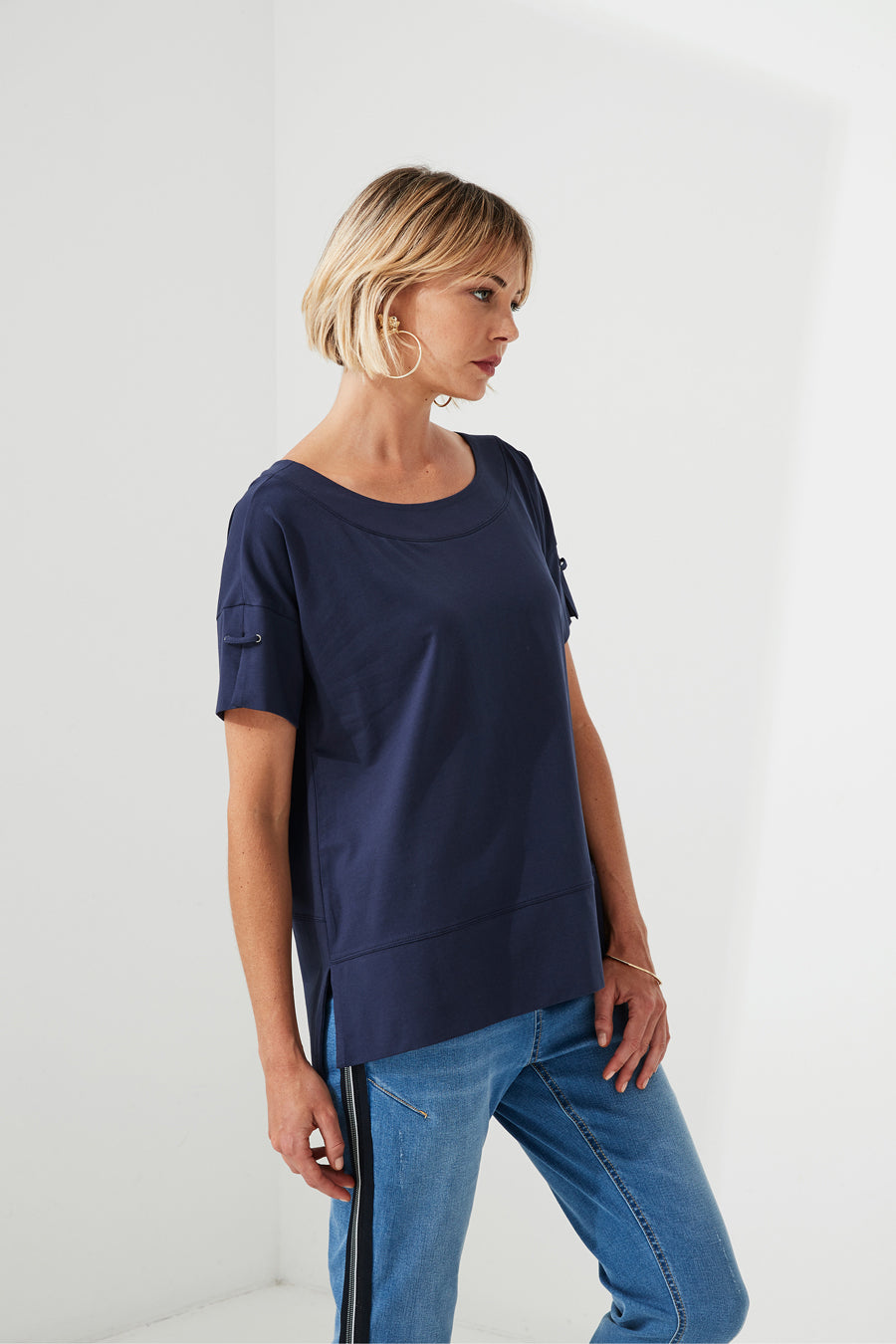 Soft cotton blend, boxy fit, featuring, drop shoulder with cuff short sleeves and splits at hemline. Features novelty tape at back. Colours: Silver Marl, White, Ink, Khaki, Fuchsia.