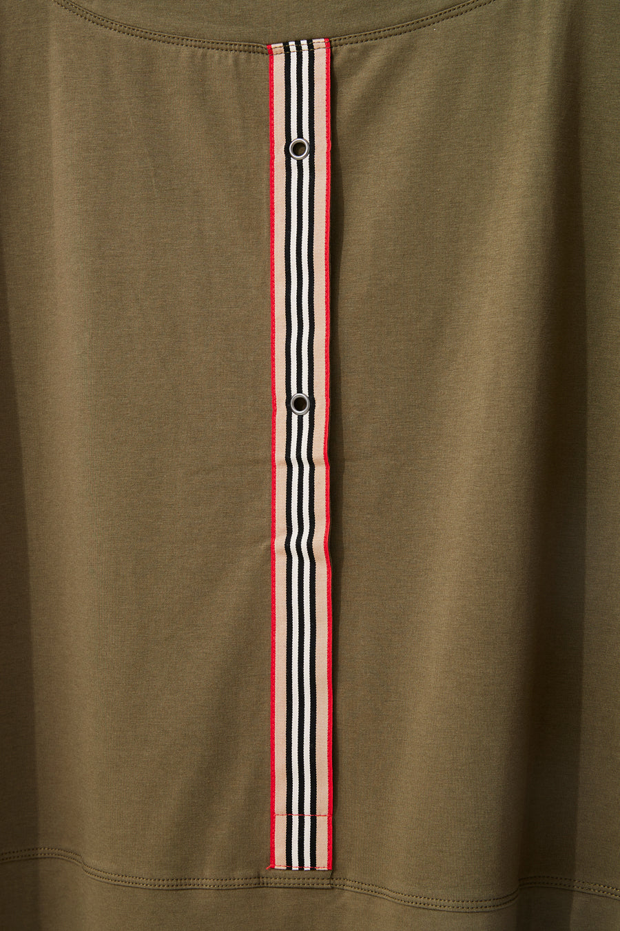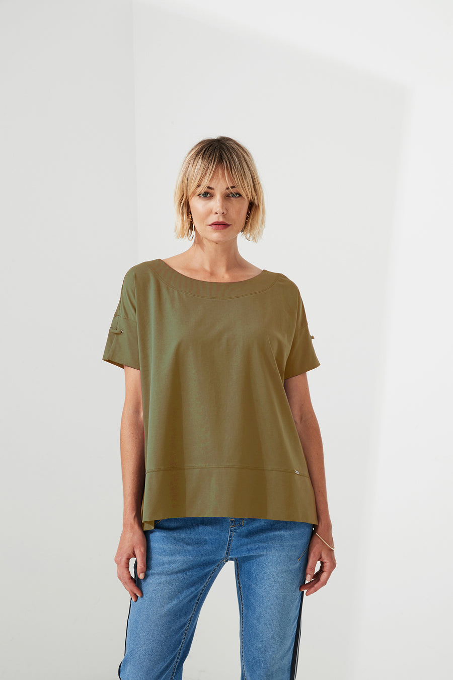Soft cotton blend, boxy fit, featuring, drop shoulder with cuff short sleeves and splits at hemline. Features novelty tape at back.