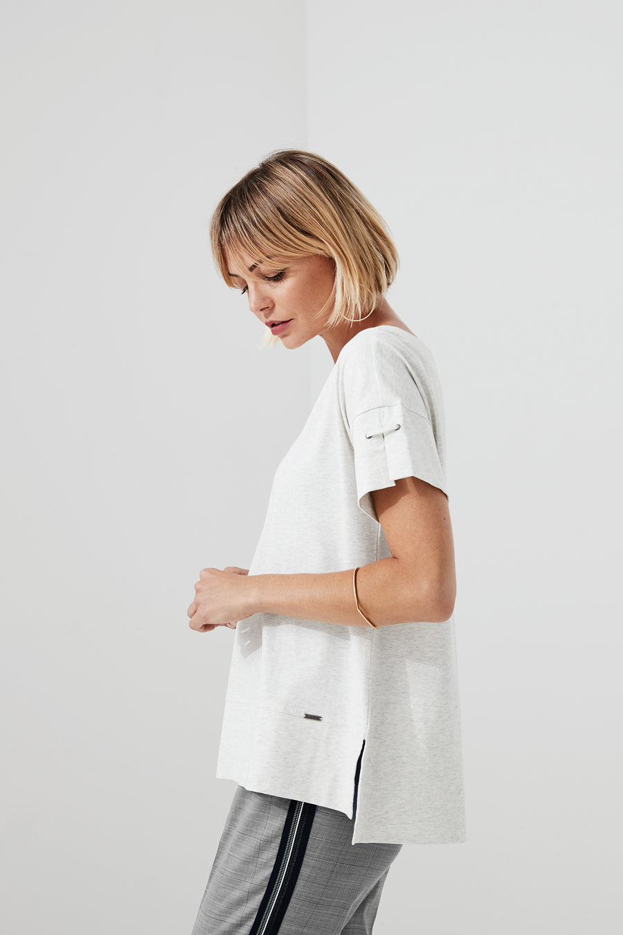 Soft cotton blend, boxy fit, featuring, drop shoulder with cuff short sleeves and splits at hemline. Features novelty tape at back.