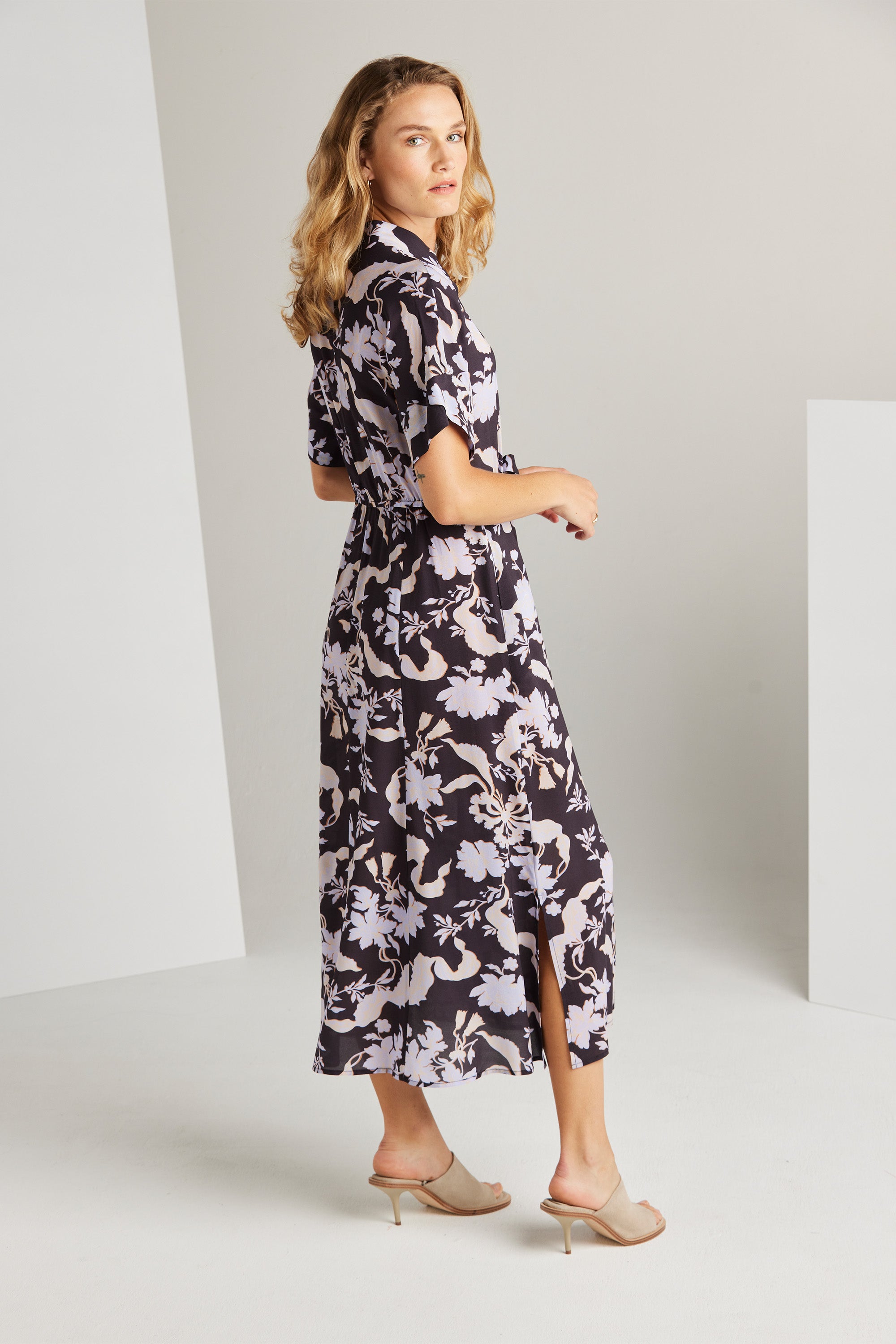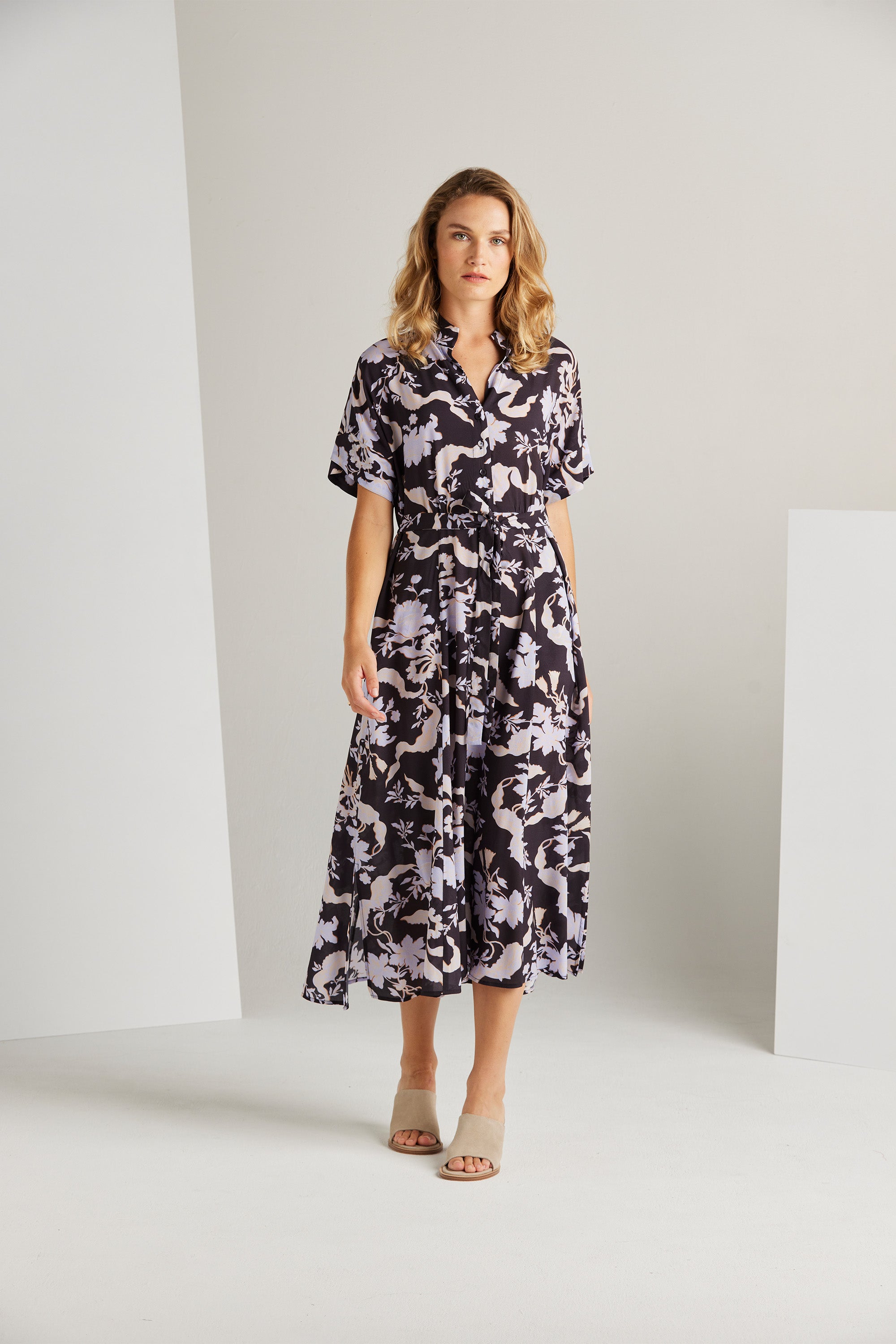 The Sander Dress emanates a sense of femininity. Its intricate floral print makes it the ideal outfit for spring attire. The front placket runs down the centre and is adorned with exquisite self-covered buttons. The addition of a shirt collar to this garment introduces a contemporary element, infusing it with a modern aesthetic and a touch of sophistication.