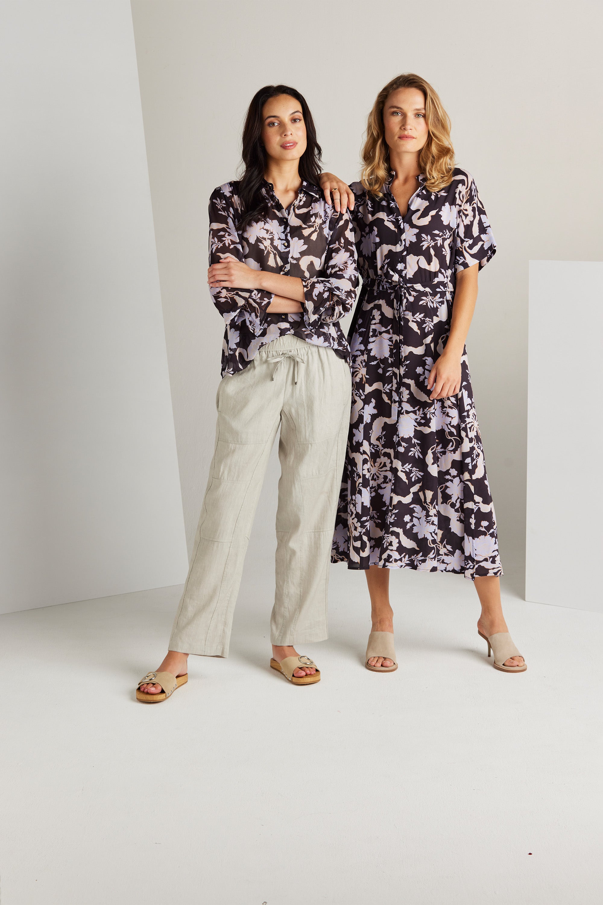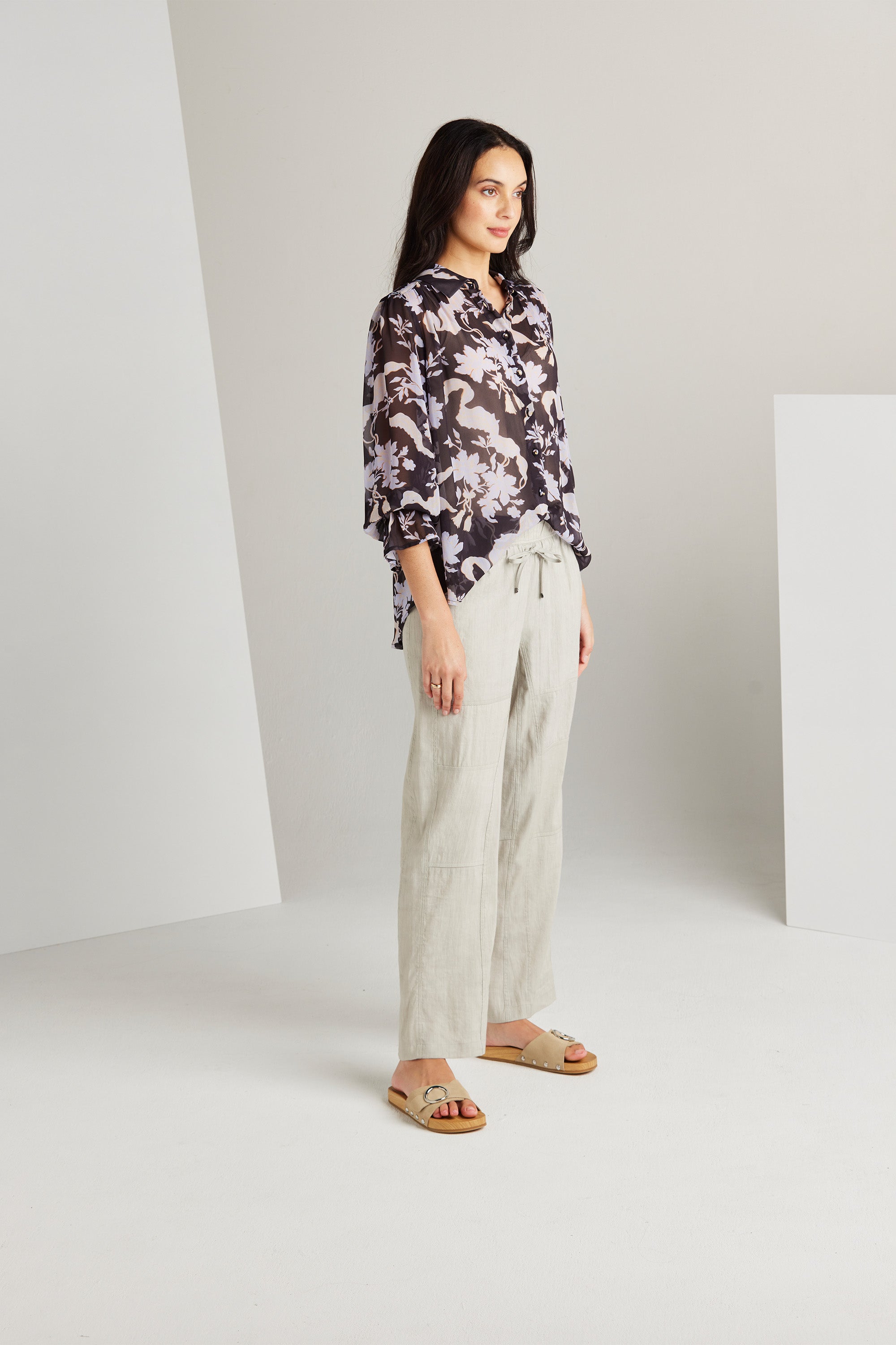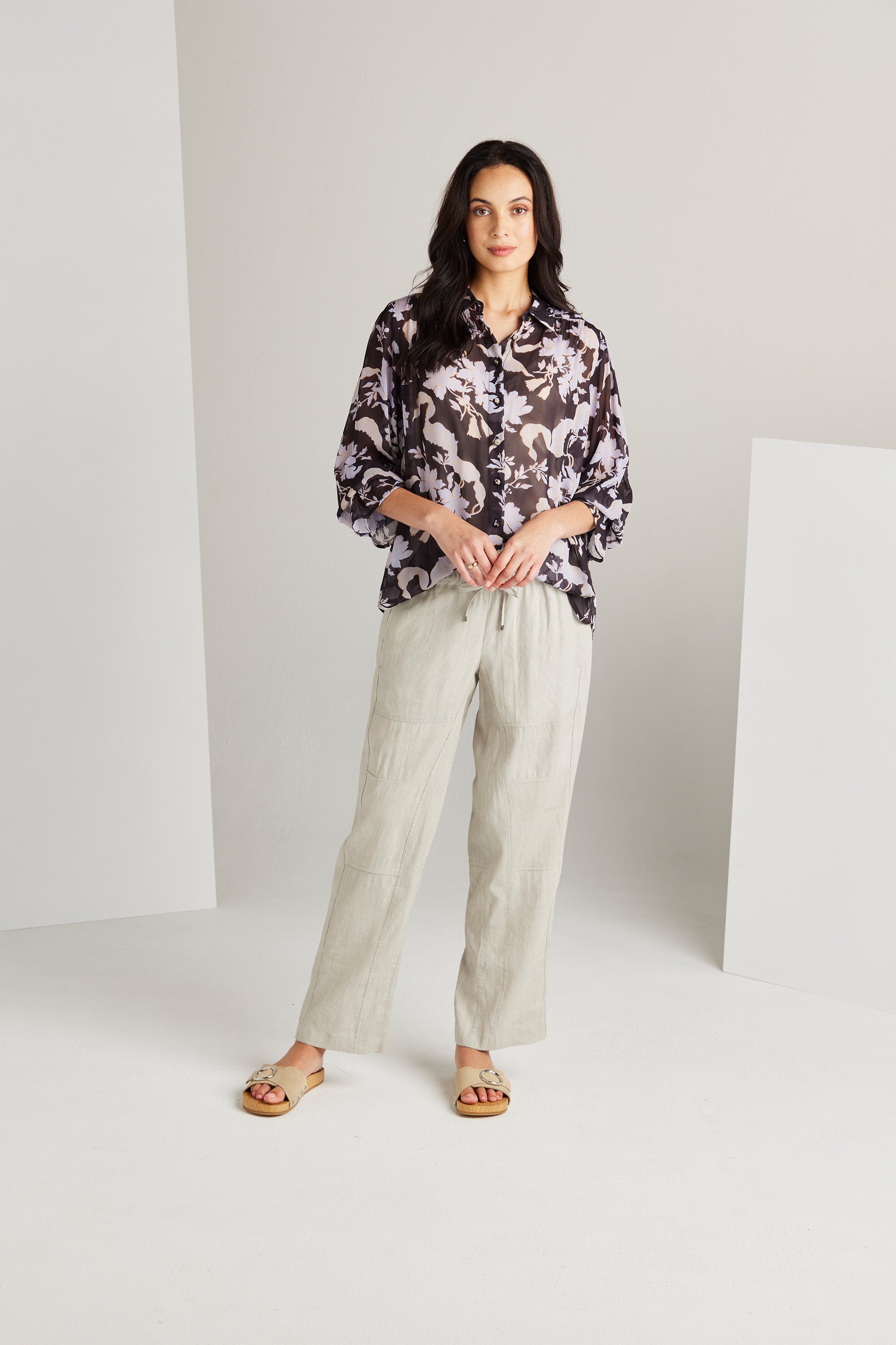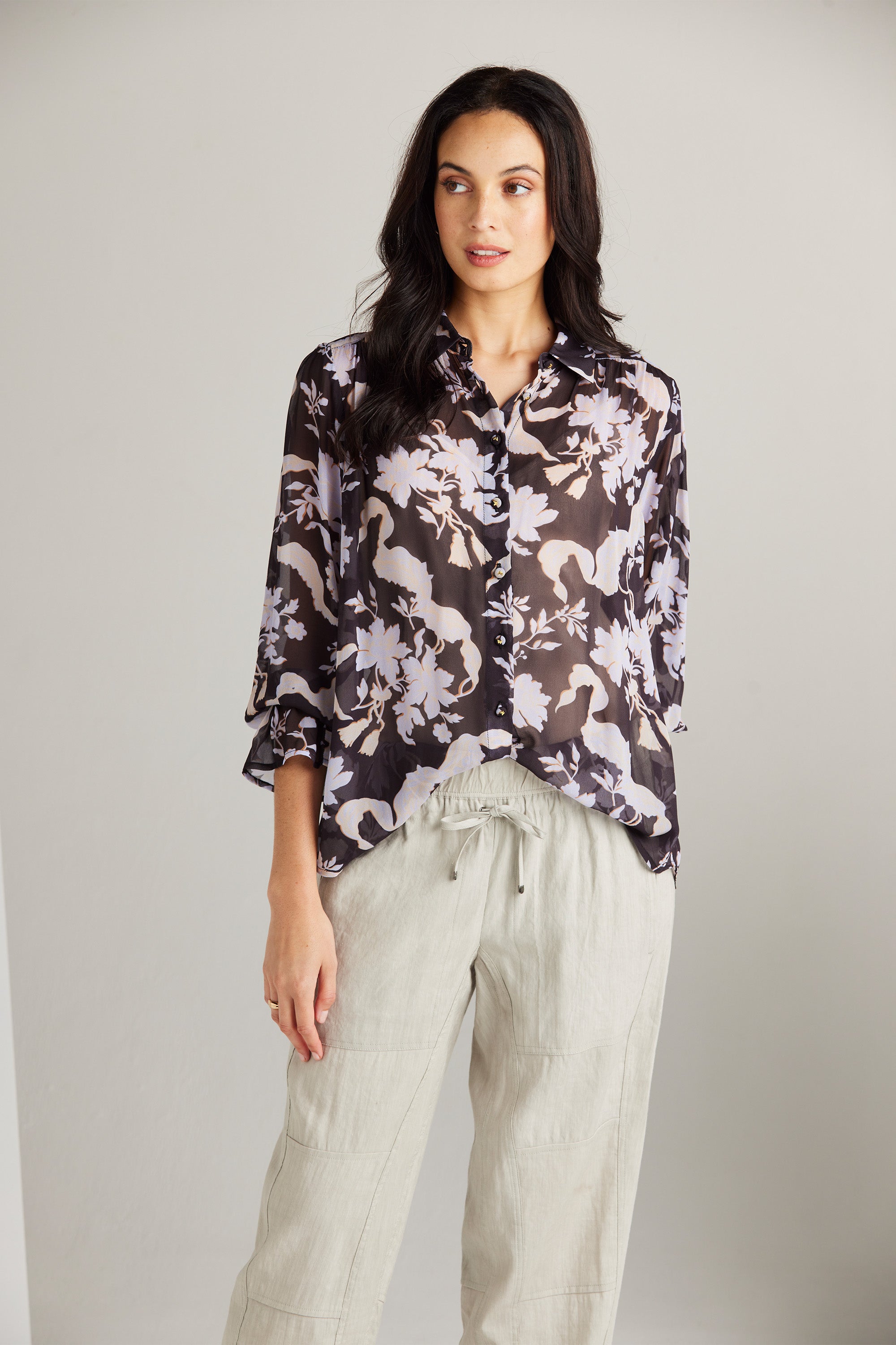 The Sander Shirt is designed with gathering around the shoulders and sleeves, which gives it an effortless and relaxed appearance. This elevated style is adorned with a feminine ornate floral print in plum hues and features self-covered buttons with gold metal butterfly details. It's versatile and it can be worn for any occasion.