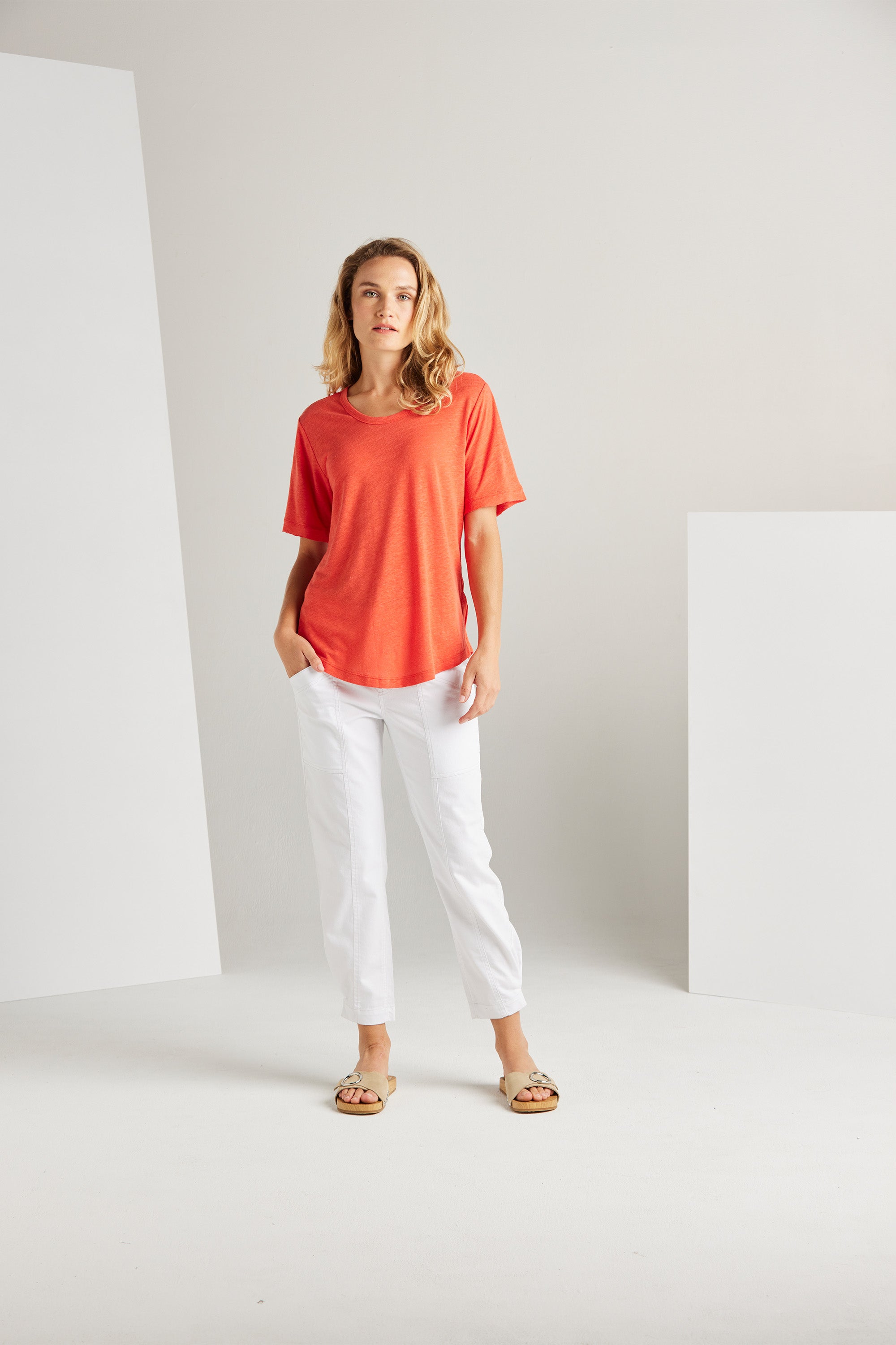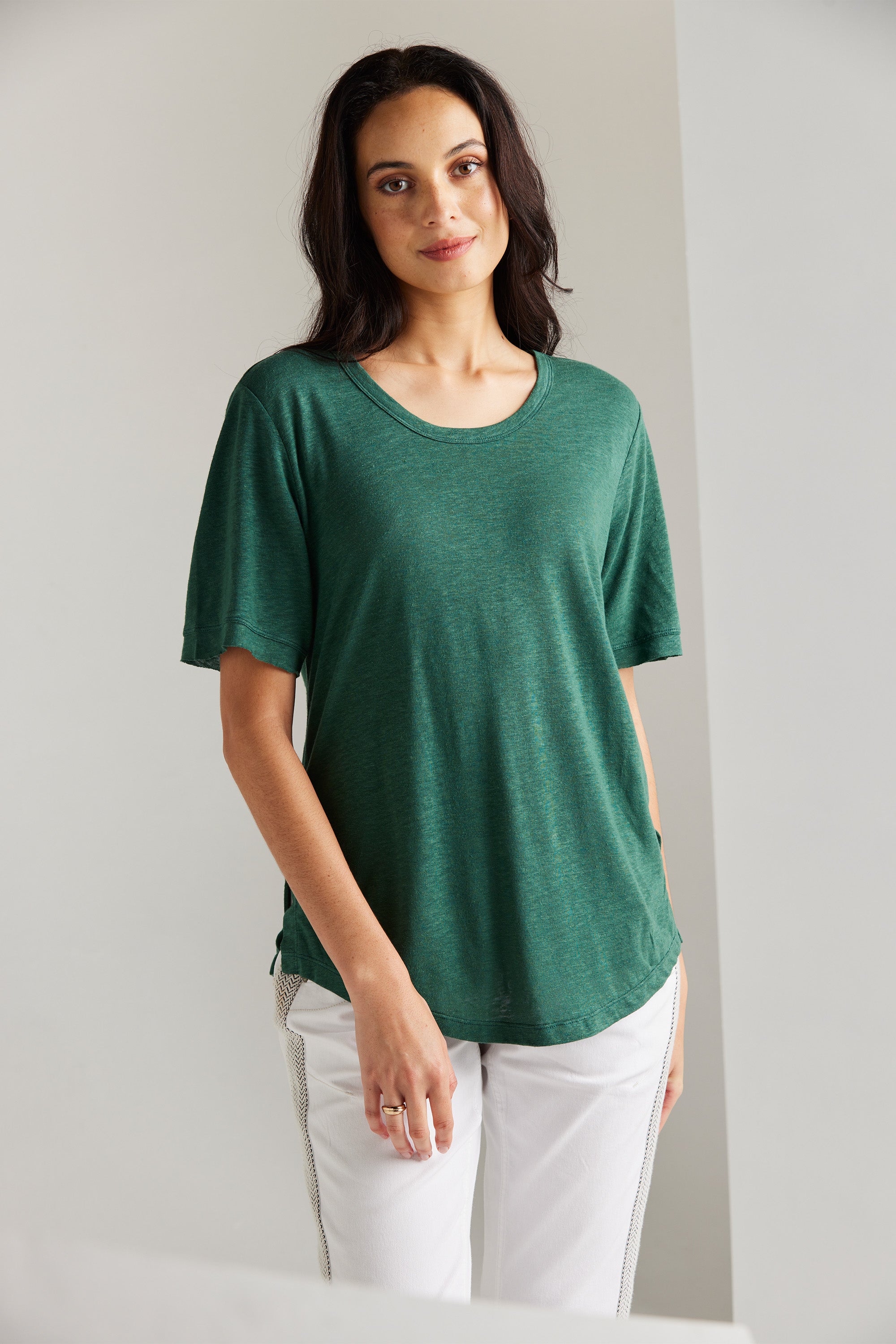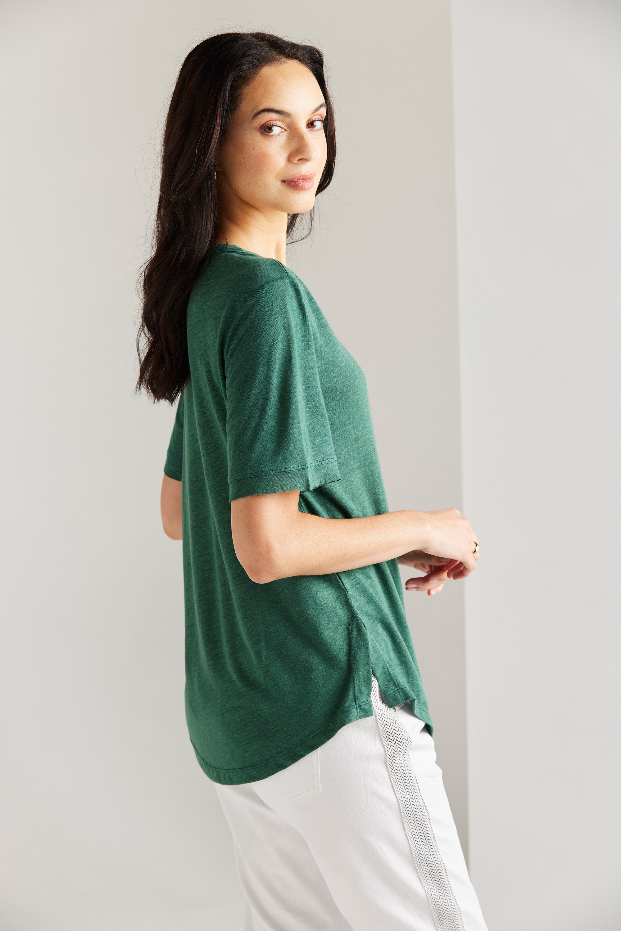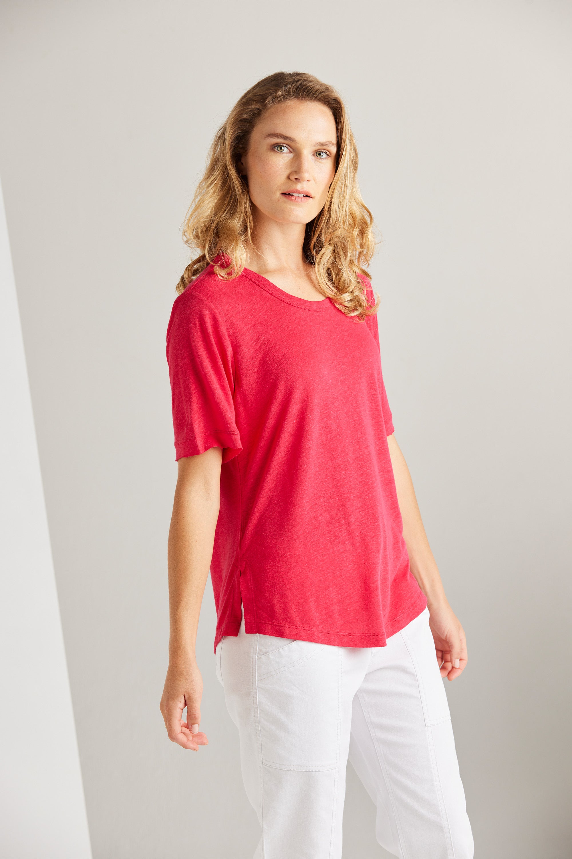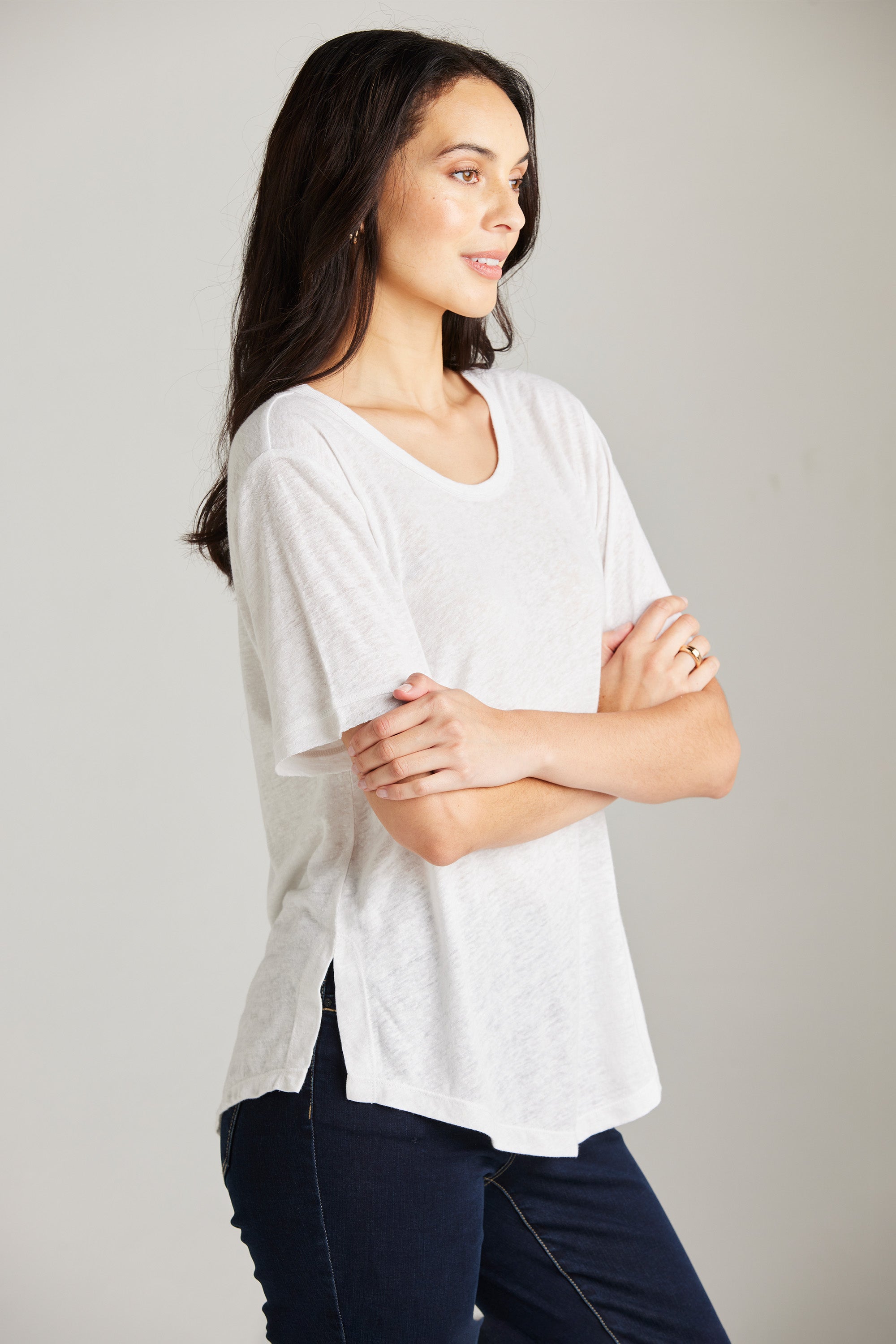 Refresh your wardrobe staples with this elevated basic. The Sara Top is in a solid colour linen viscose jersey blend. A timeless tee featuring a flattering crew-neck, and a curved hem with side splits. This top is available in five bright colours.
