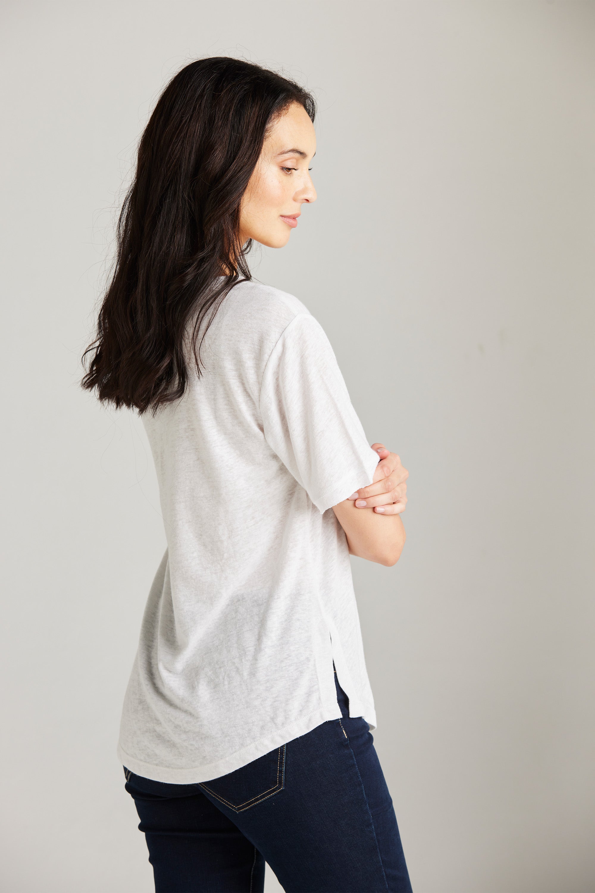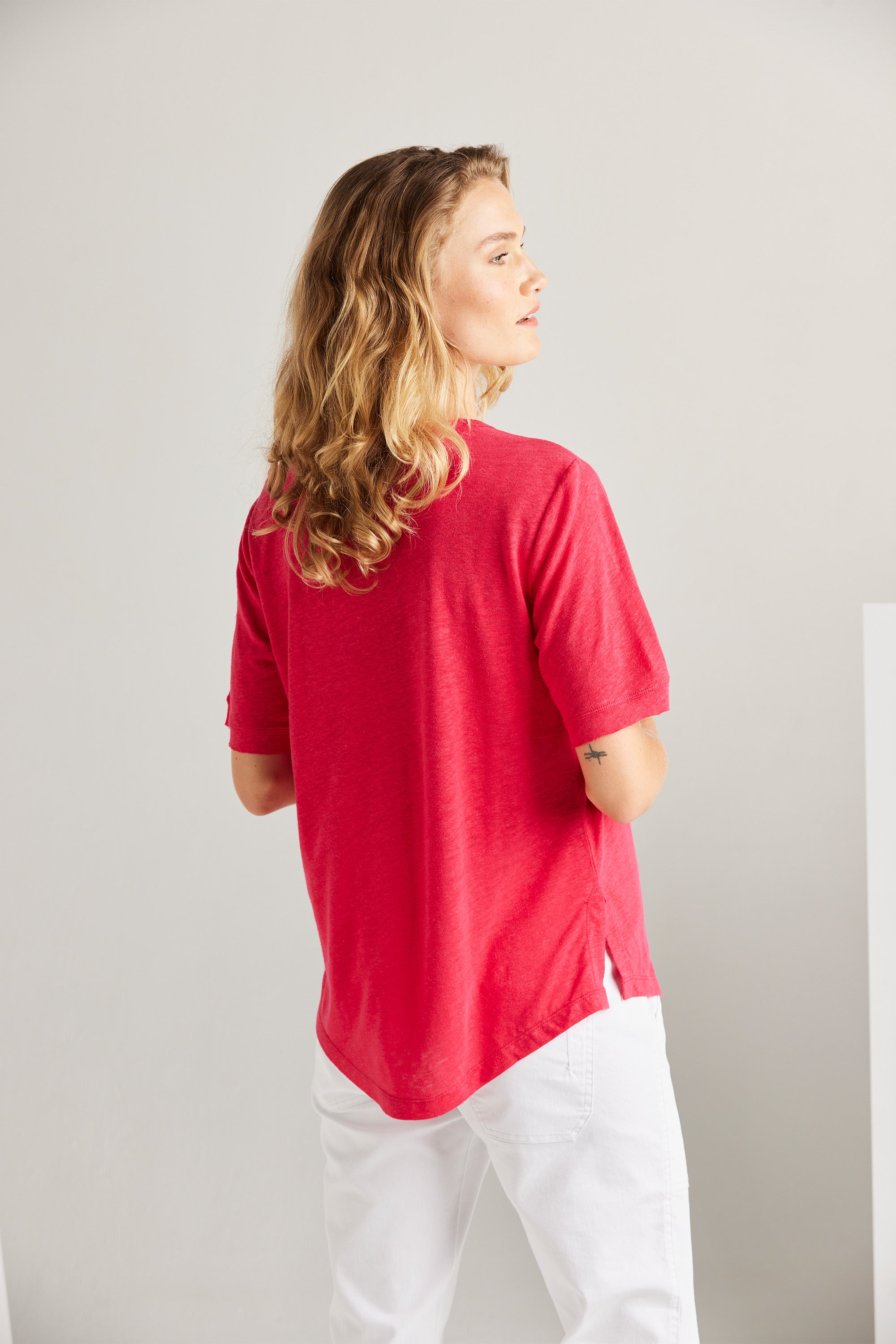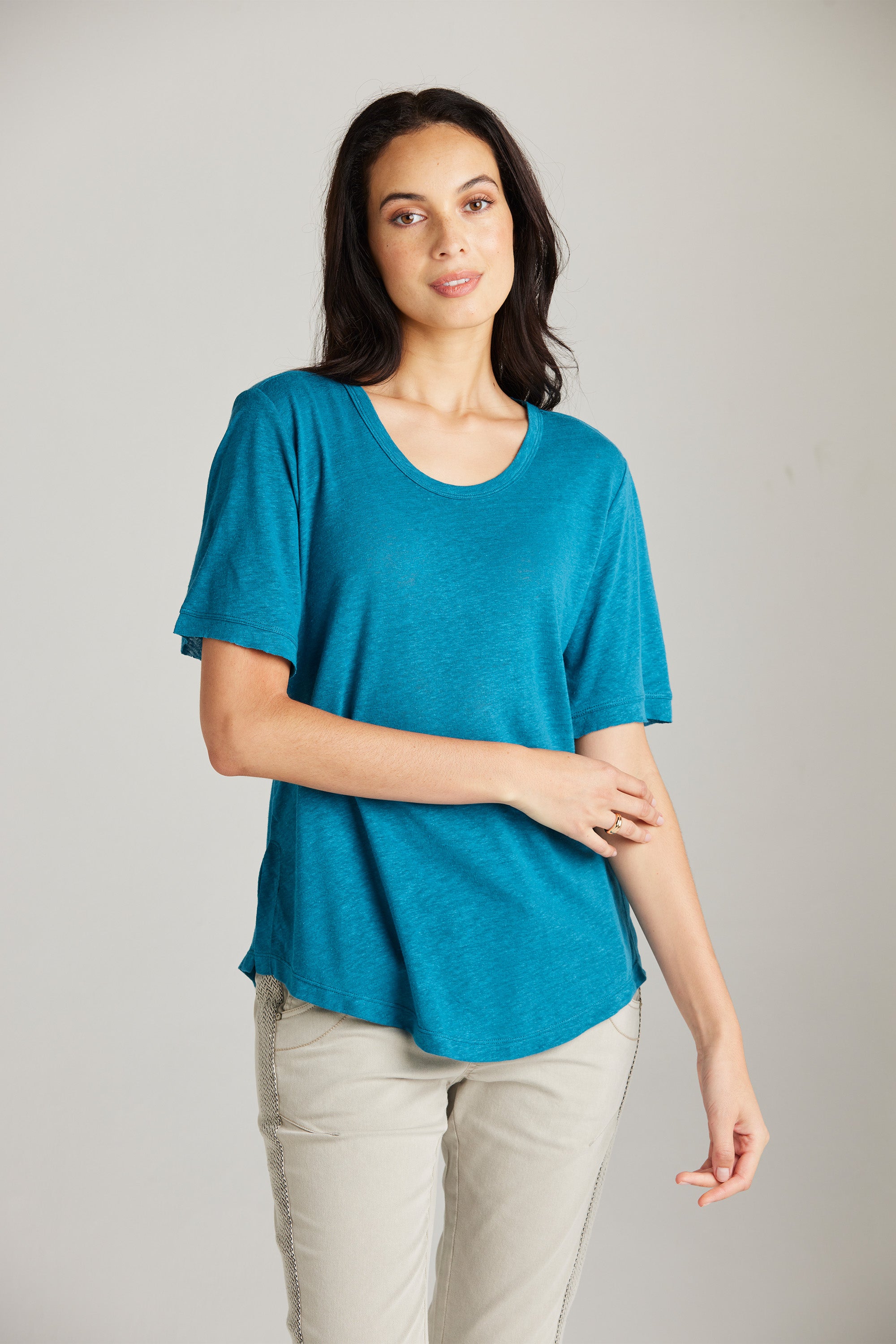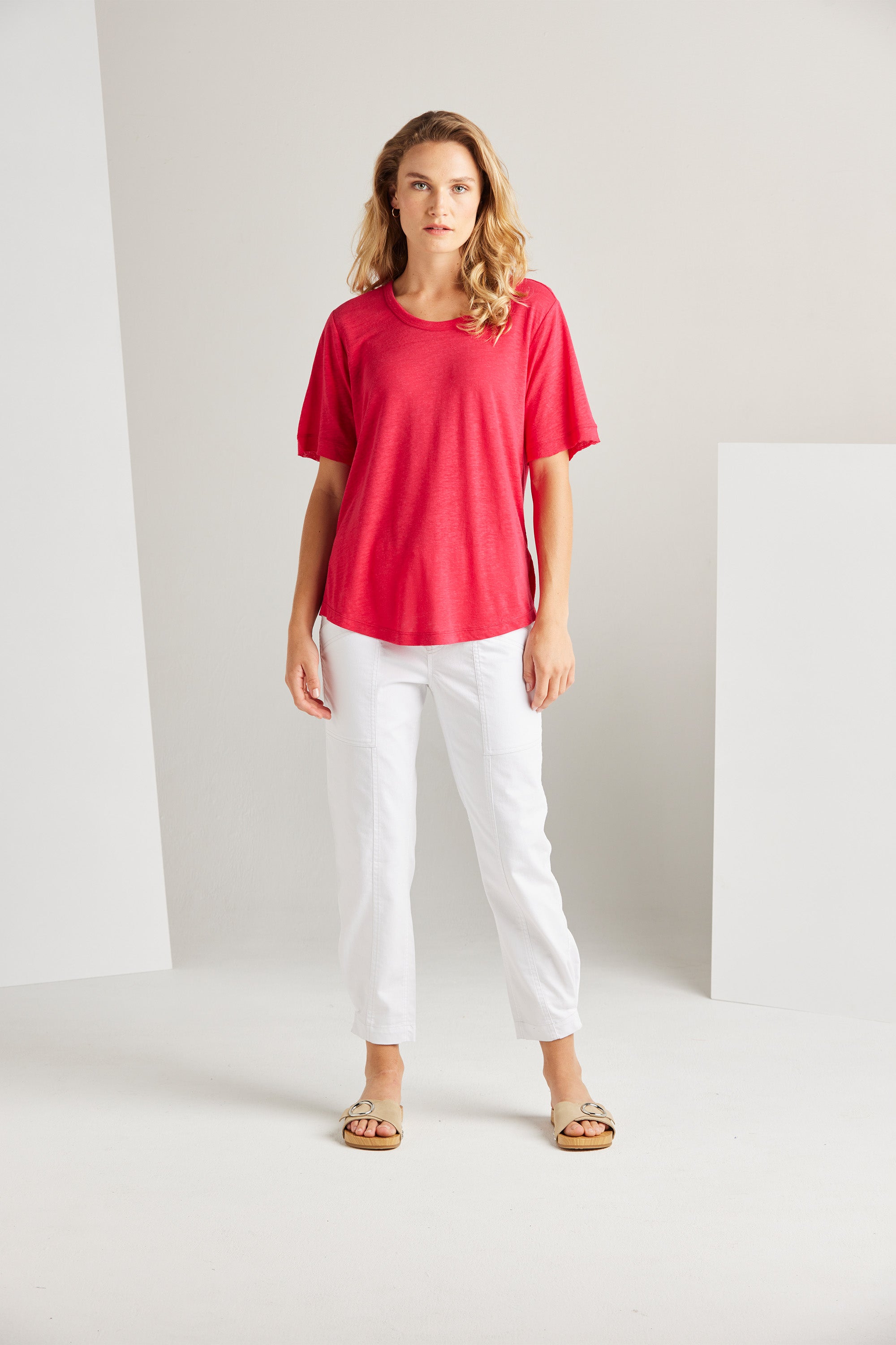 Refresh your wardrobe staples with this elevated basic. The Sara Top is in a solid colour linen viscose jersey blend. A timeless tee featuring a flattering crew-neck, and a curved hem with side splits. This top is available in five bright colours.