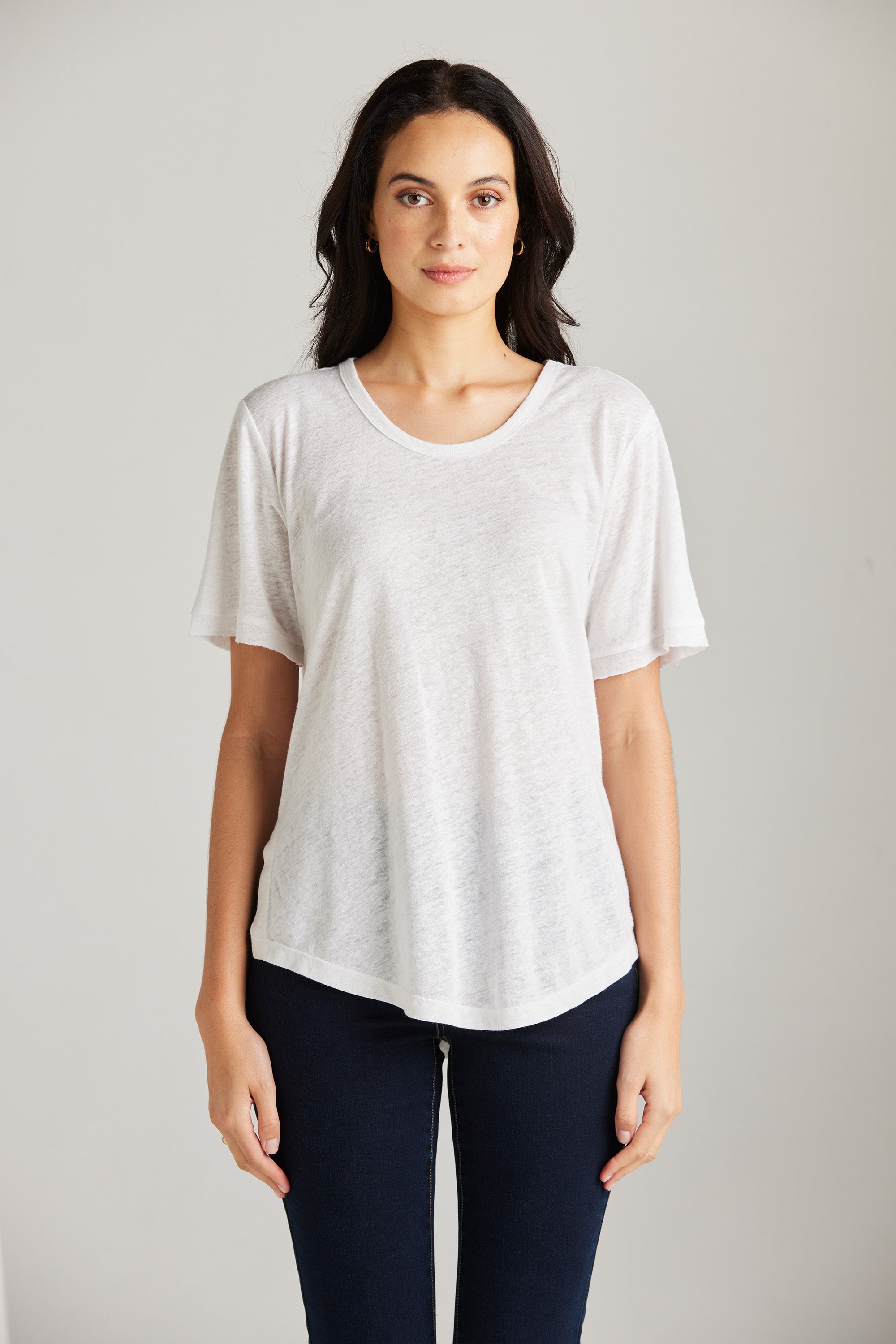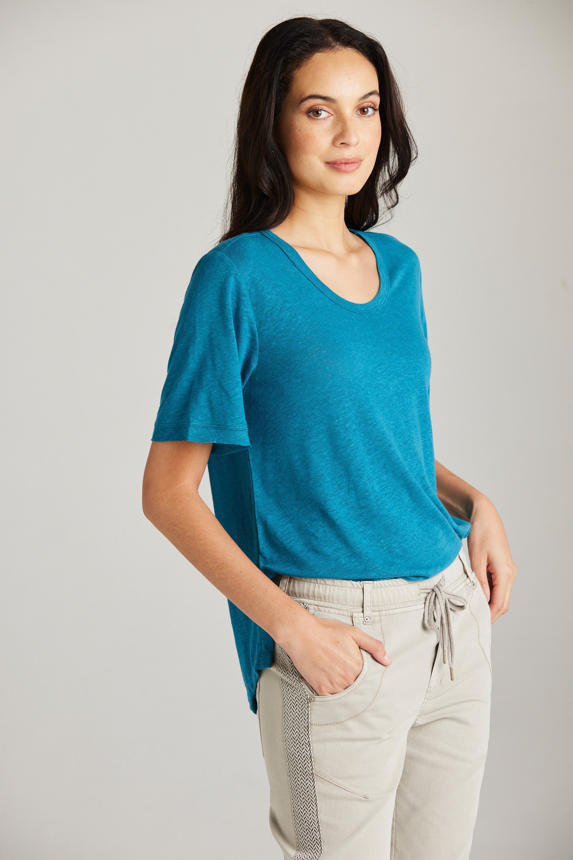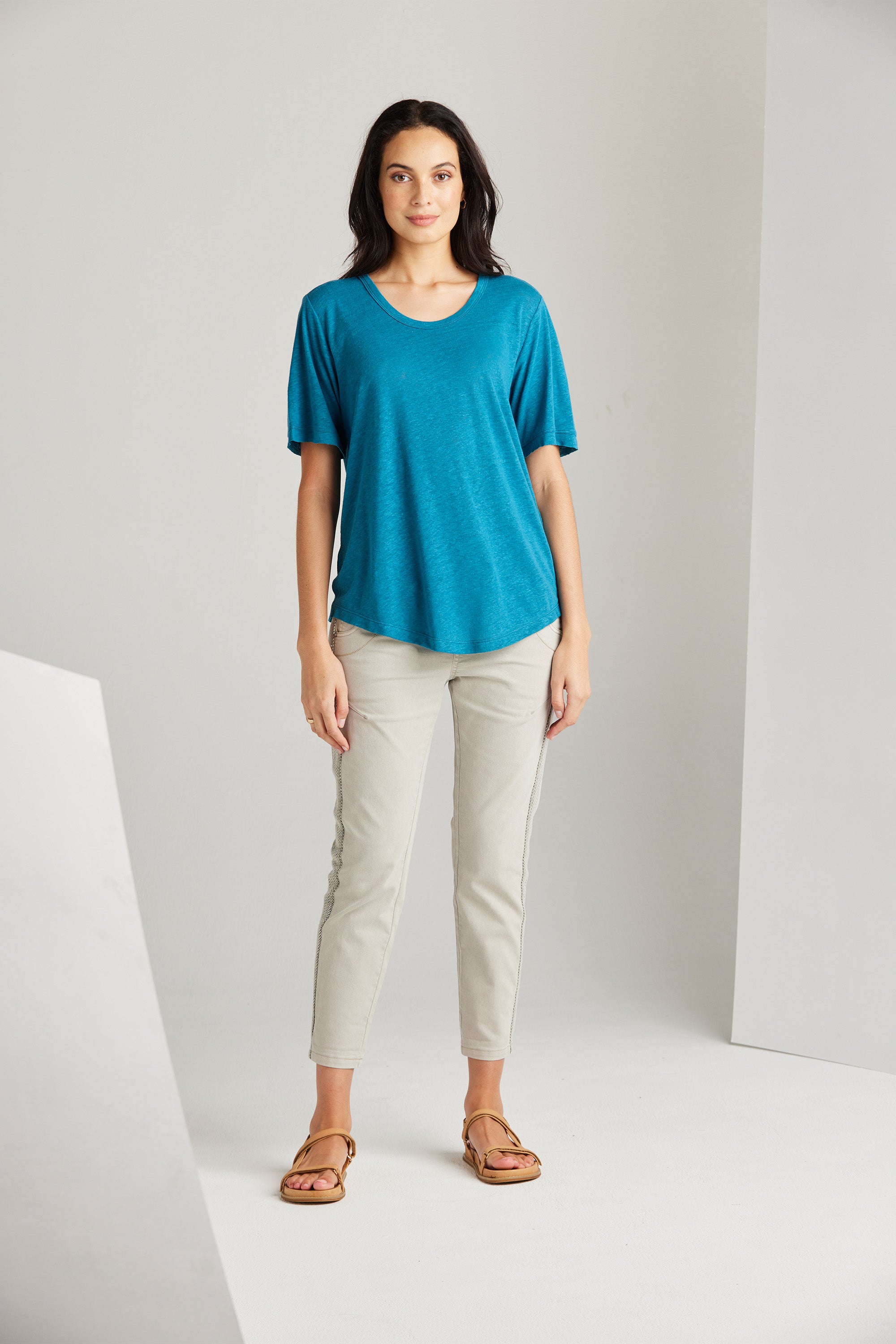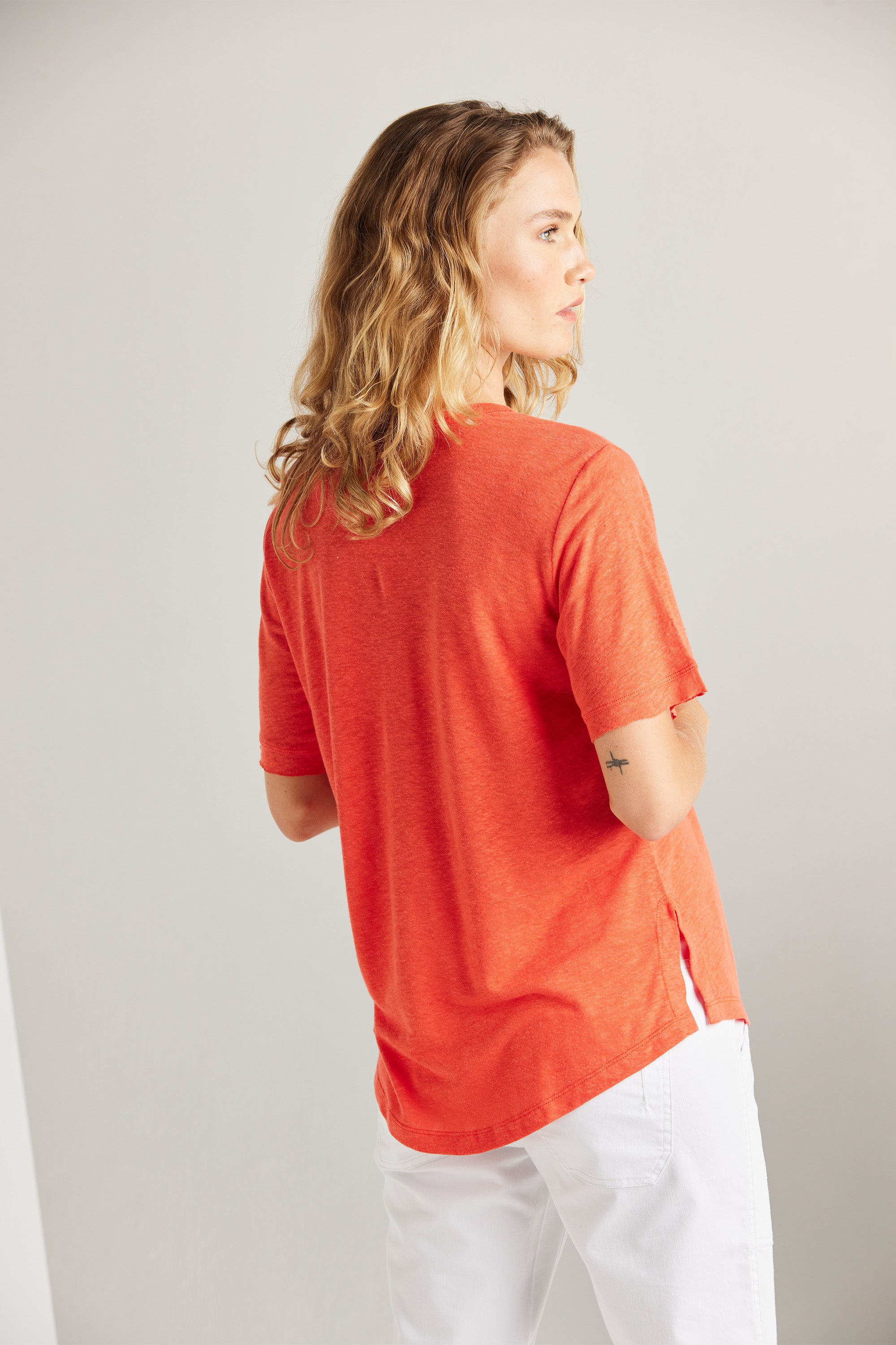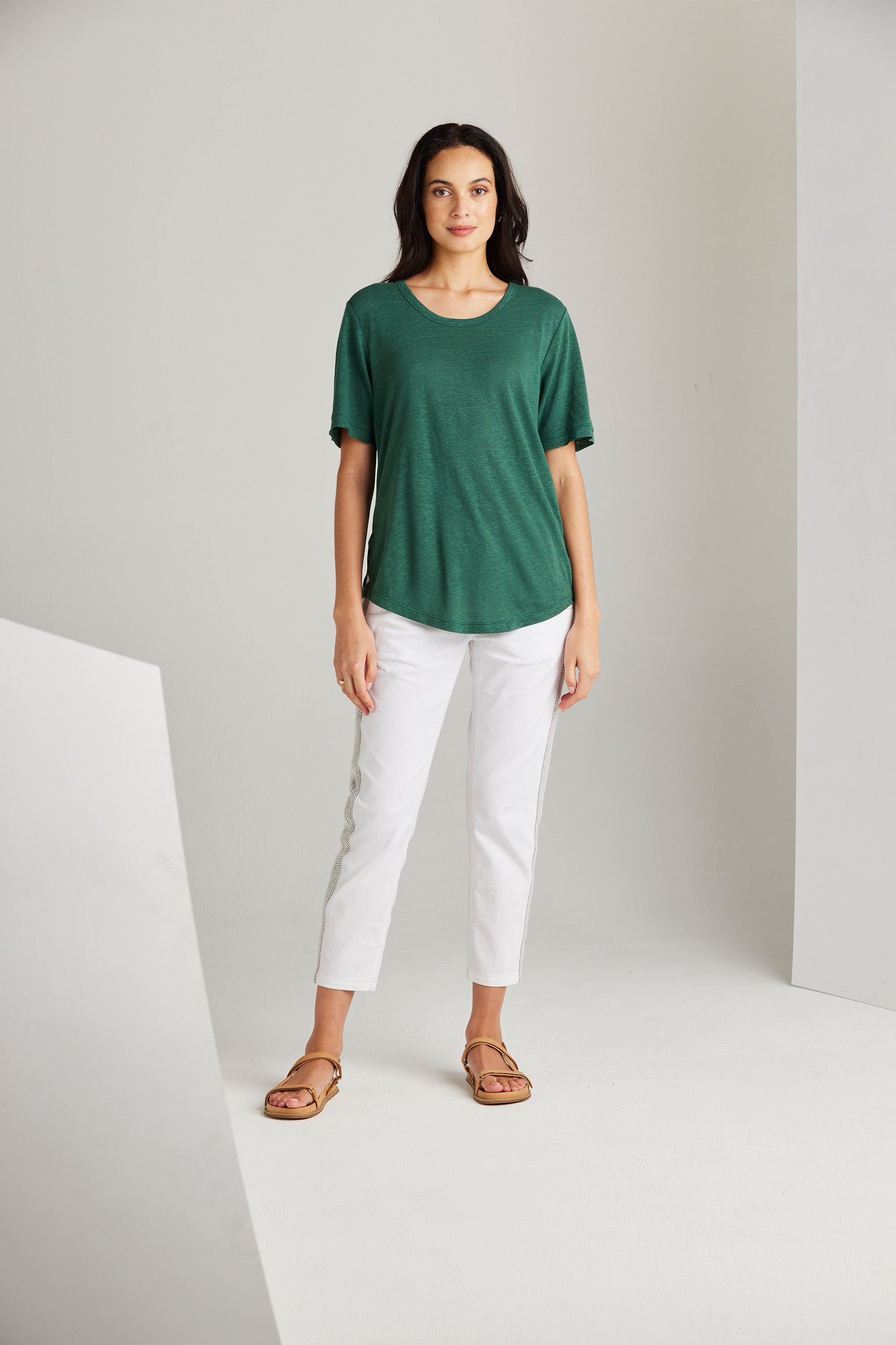 Refresh your wardrobe staples with this elevated basic. The Sara Top is in a solid colour linen viscose jersey blend. A timeless tee featuring a flattering crew-neck, and a curved hem with side splits. This top is available in five bright colours.