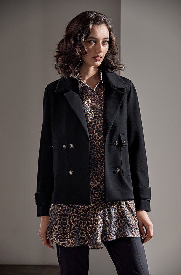 Scout ponti jacket with military look, jacket fit, fancy buttons, braided collar and cuff tab trim, giving it a polished refined finish.