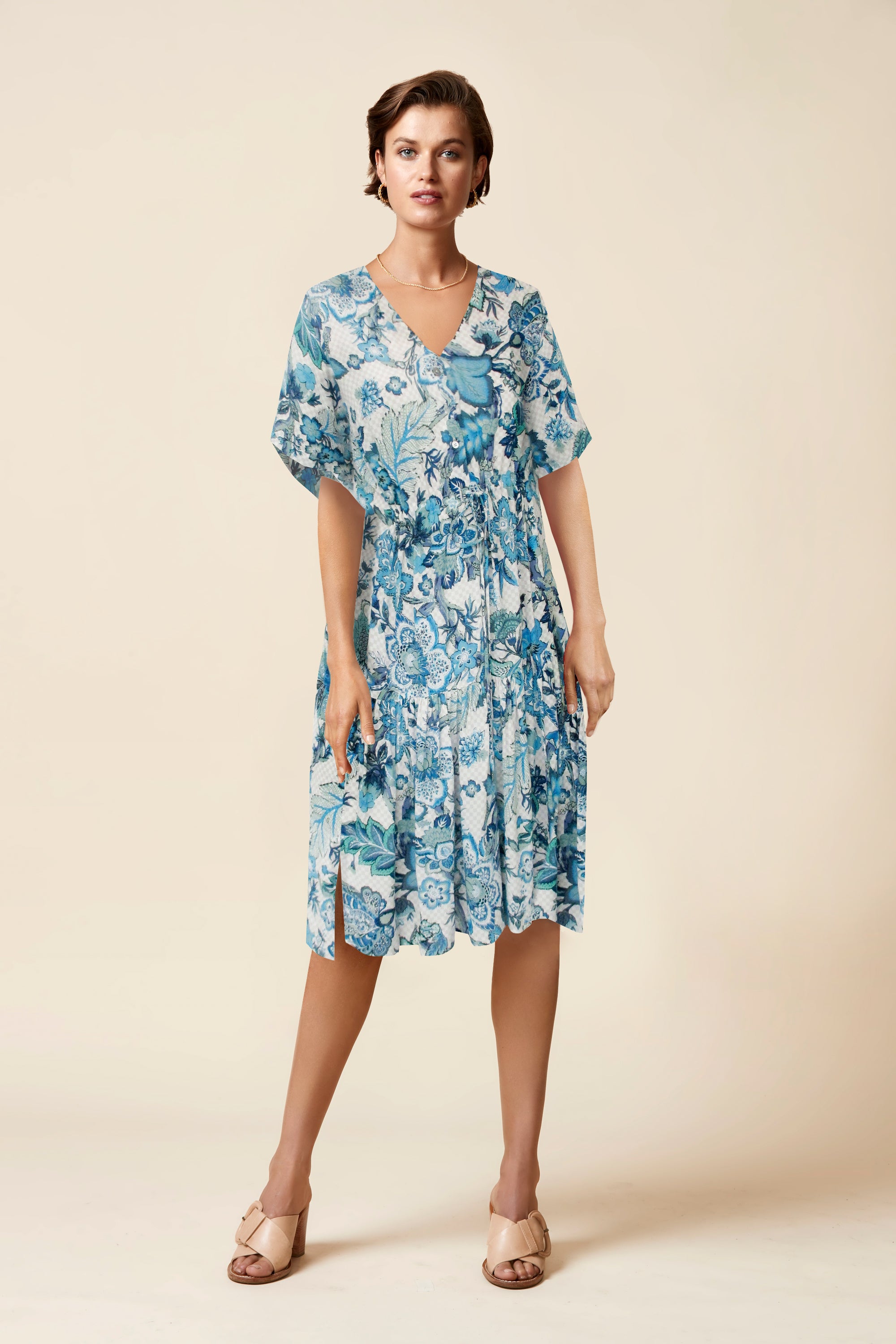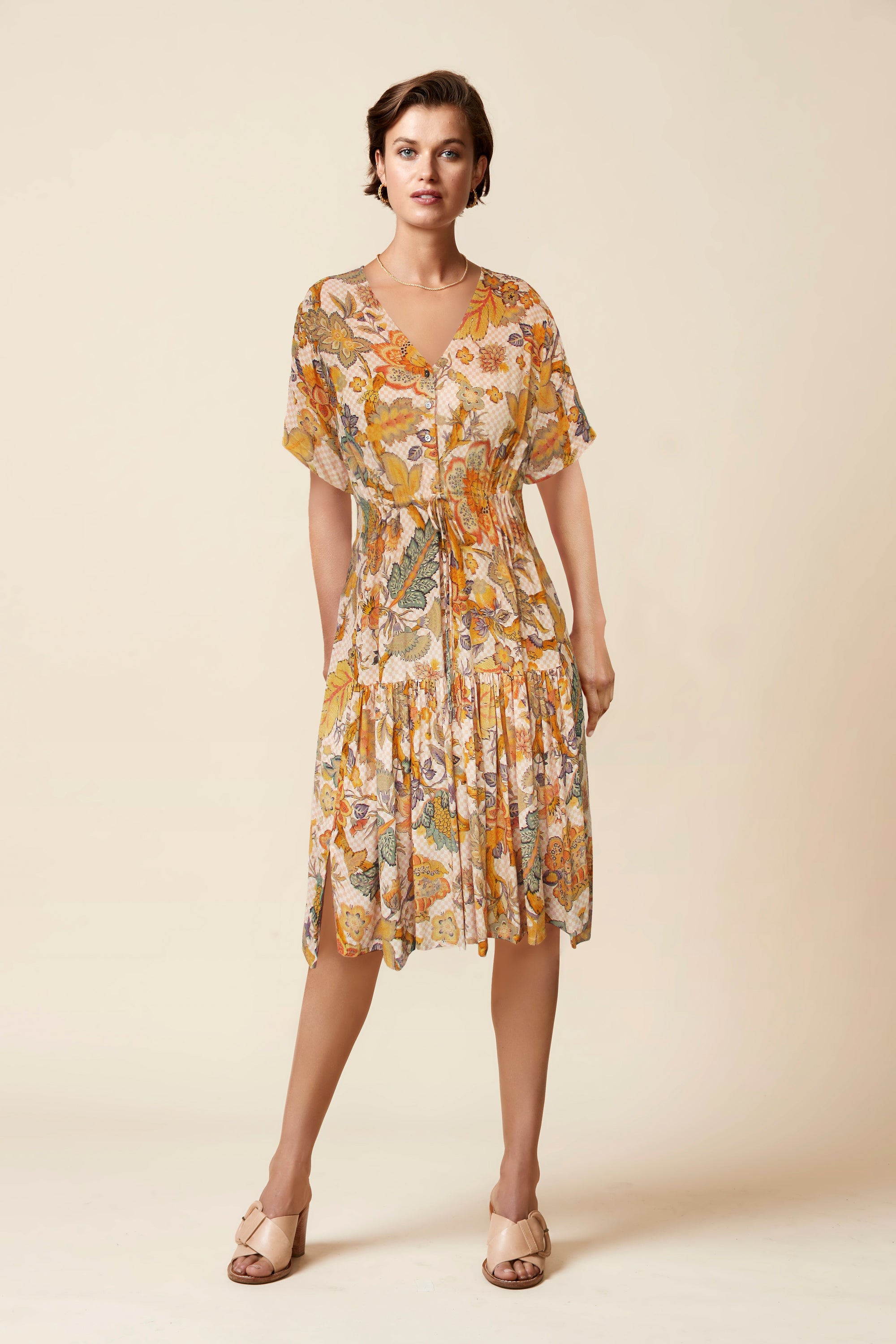 Intricate floral & checkerboard printed dress with adjustable drawstring detail at the front waist, gathering, and button front placket. The perfect spring occasion dress.
