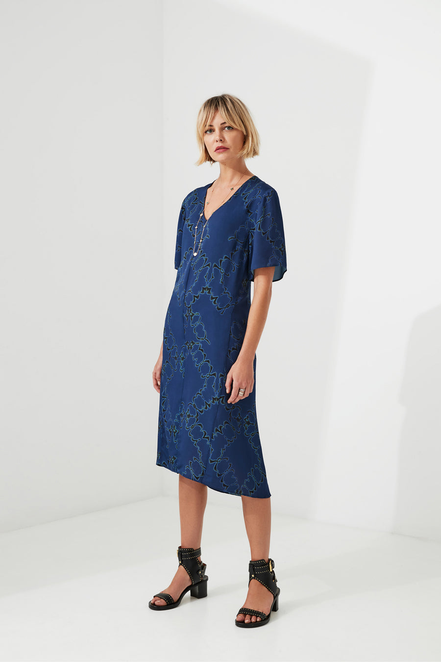 The perfect breezy spring dress in the Siegel print. Quality viscose, drapes to mid-calf at front hemline and extended length at back.