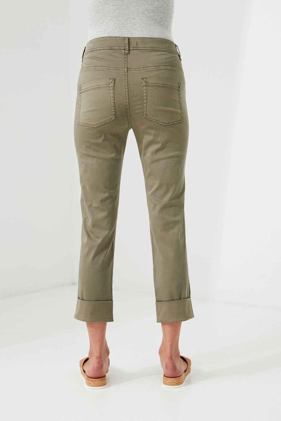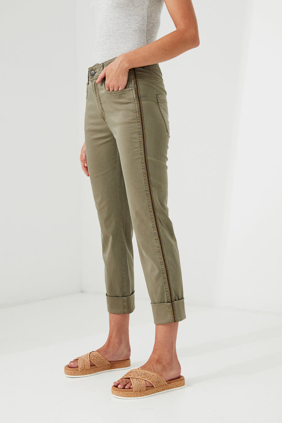 A cool casual, slim fit 7/8 cuffed pant, jean pocket and fly detailing, subtle side tape. The soft handle and slightly distressed finish is achieved by special garment wash.