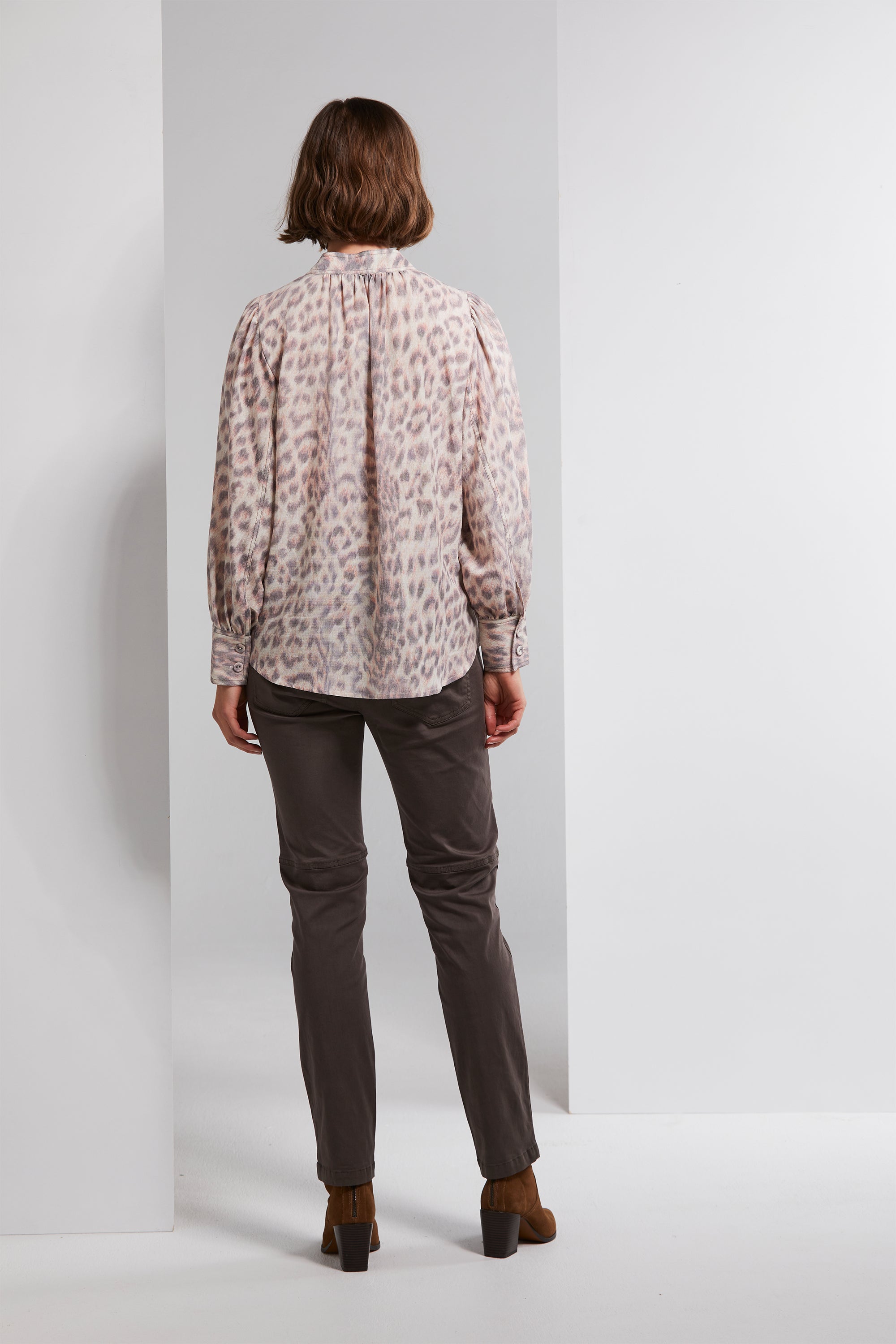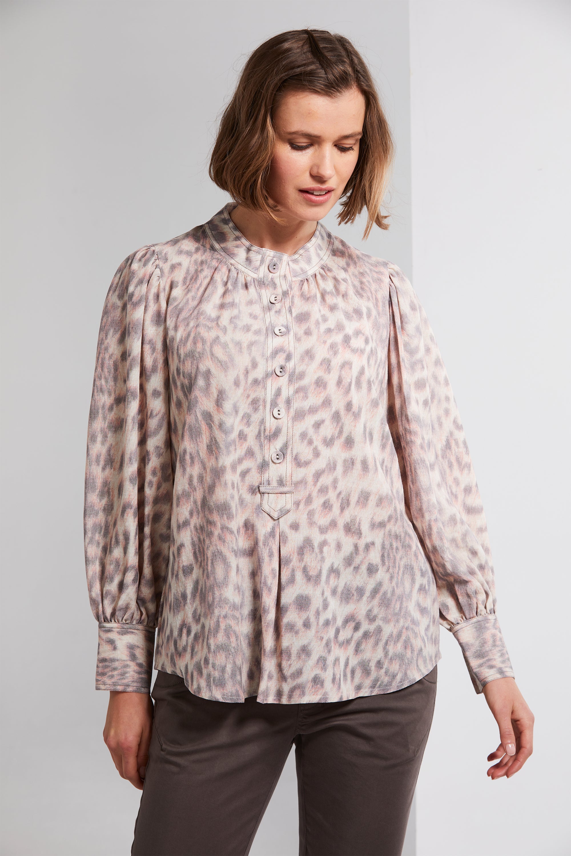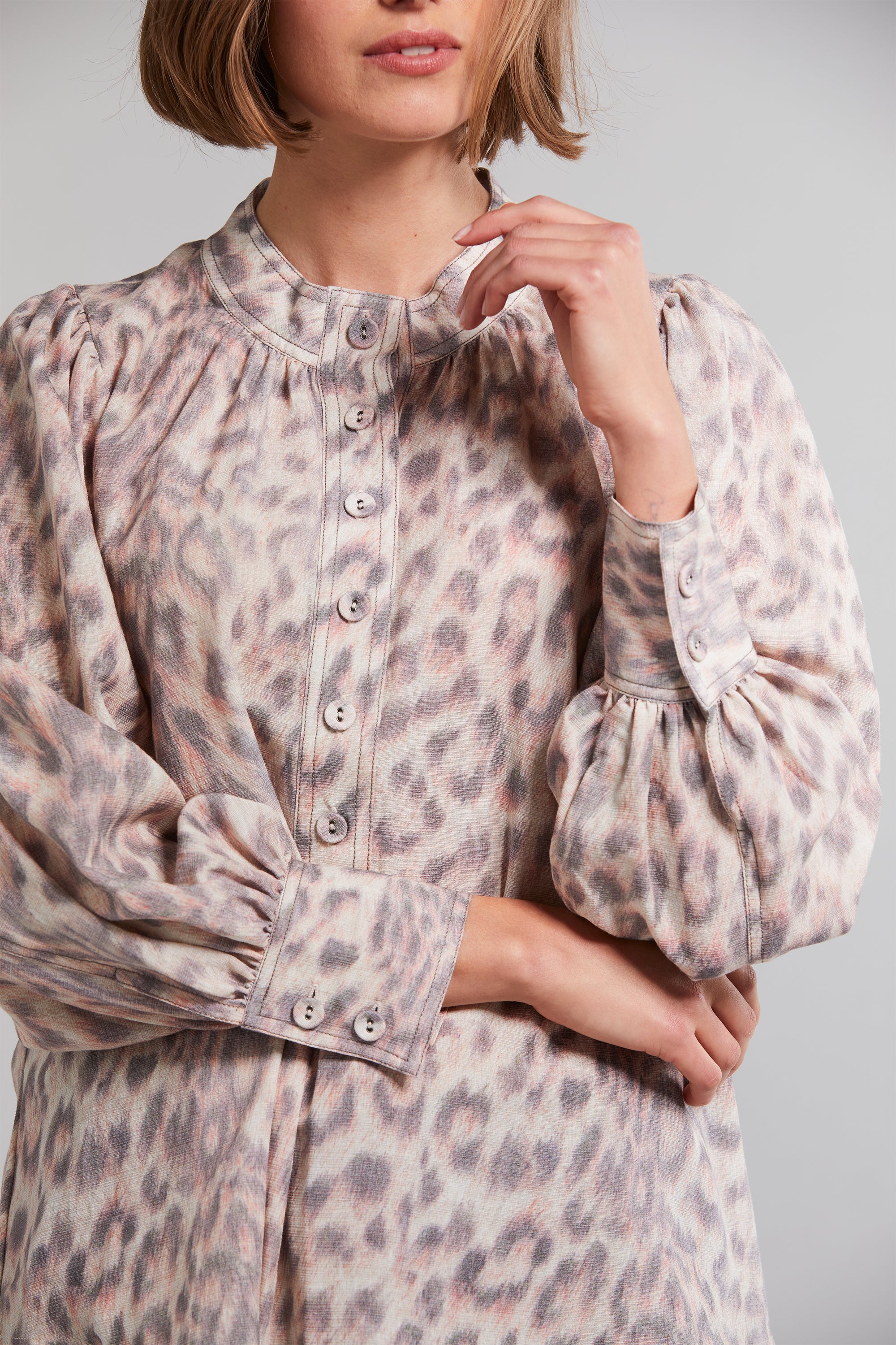 The Snow Shirt. This versatile piece features a placket neckline adorned with a fabric tab and self-covered metal hole buttons. The subtle tuck at the centre front, soft gather at the sleeve head and off-the-back yoke creates a floaty silhouette.
