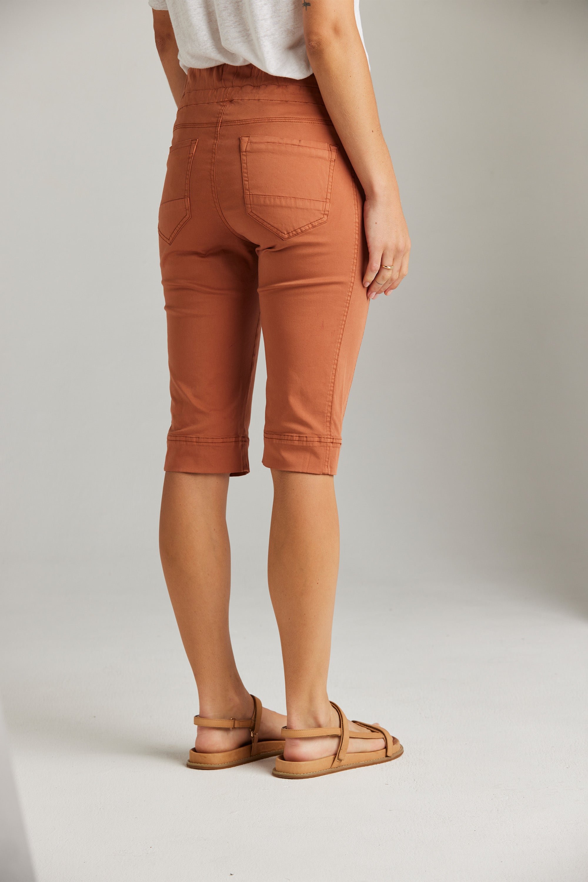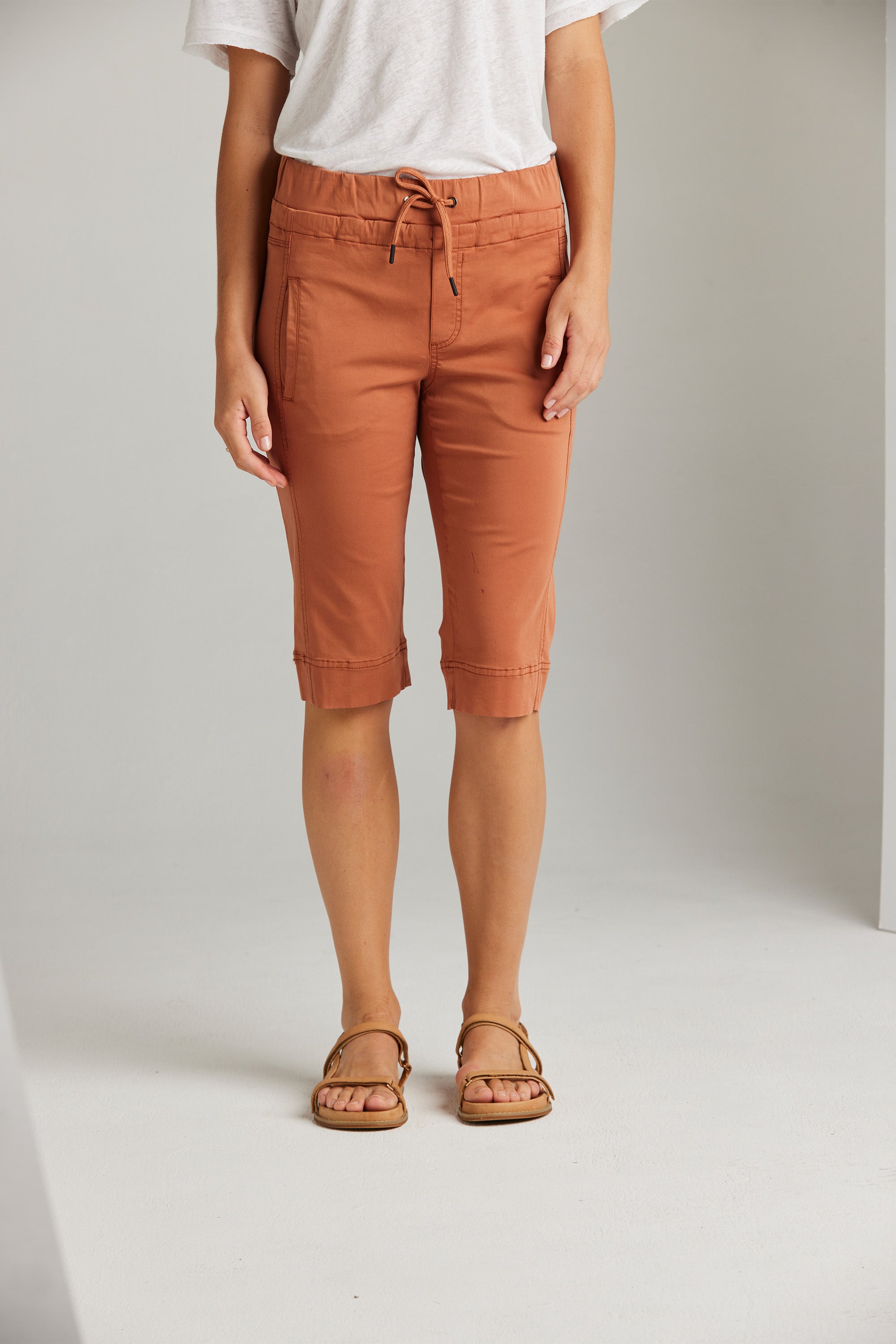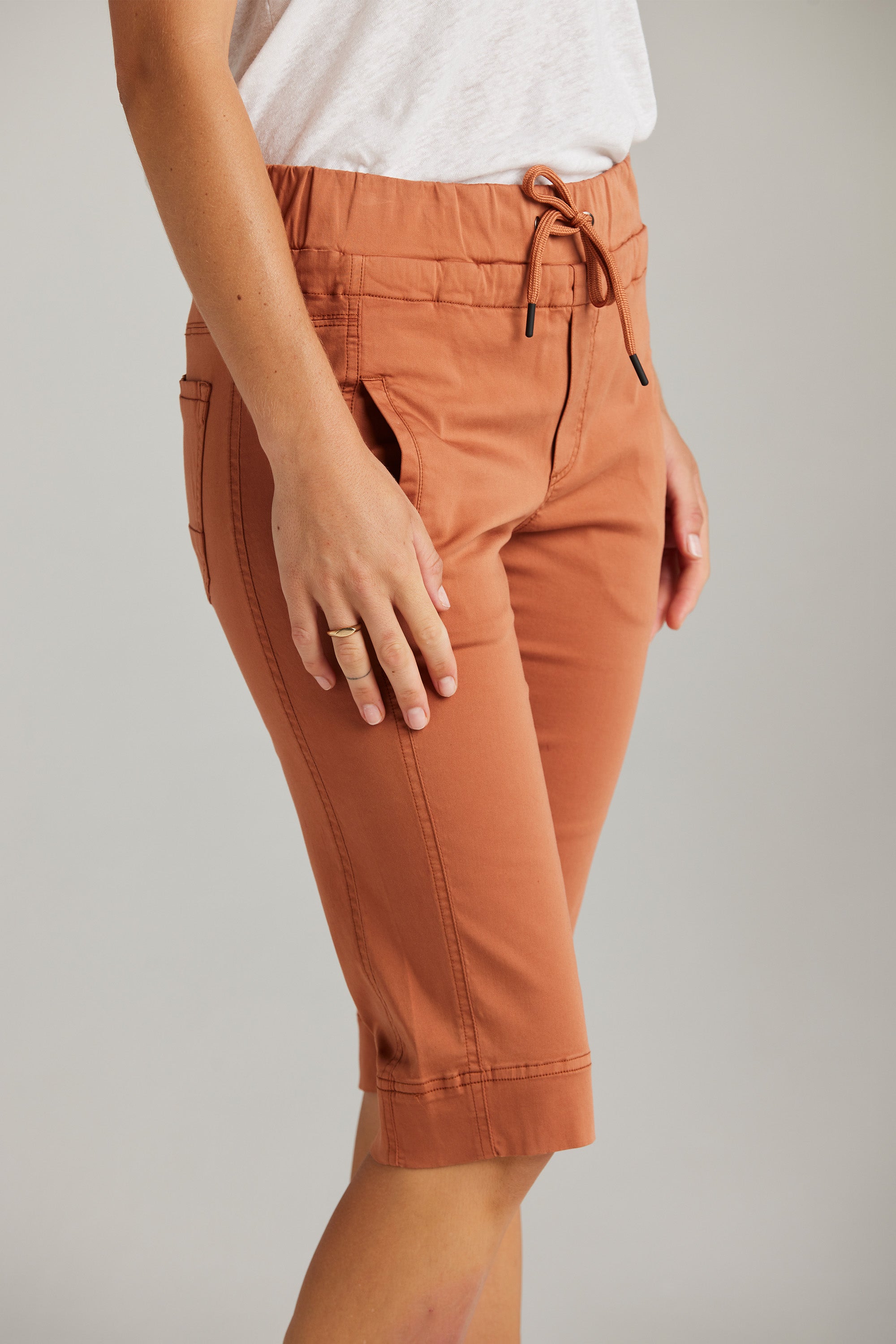 These knee-length shorts are designed for a relaxed feel and have an elasticated waistband with an adjustable drawstring for ultimate comfort. The style features heavy embroidery stitching, side leg panels, and side welt pockets. This short is garment dyed to achieve a distressed look and soft hand feel.