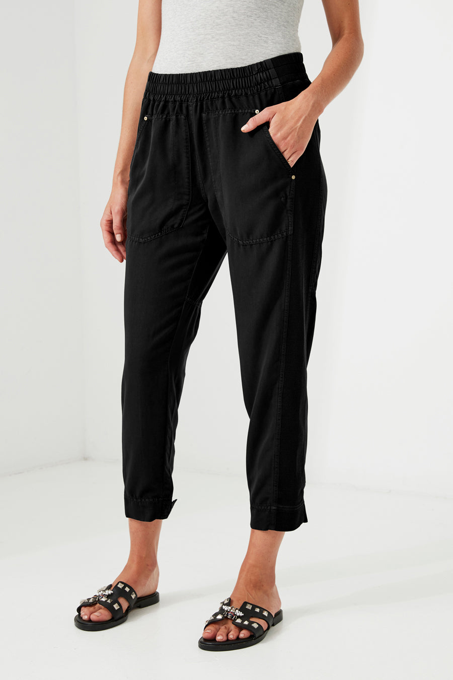 Casual weekend 7/8 pant, easy fit elastic waist, functional front pocket, featured contrast rib side panel and adjustable tabs at hem.