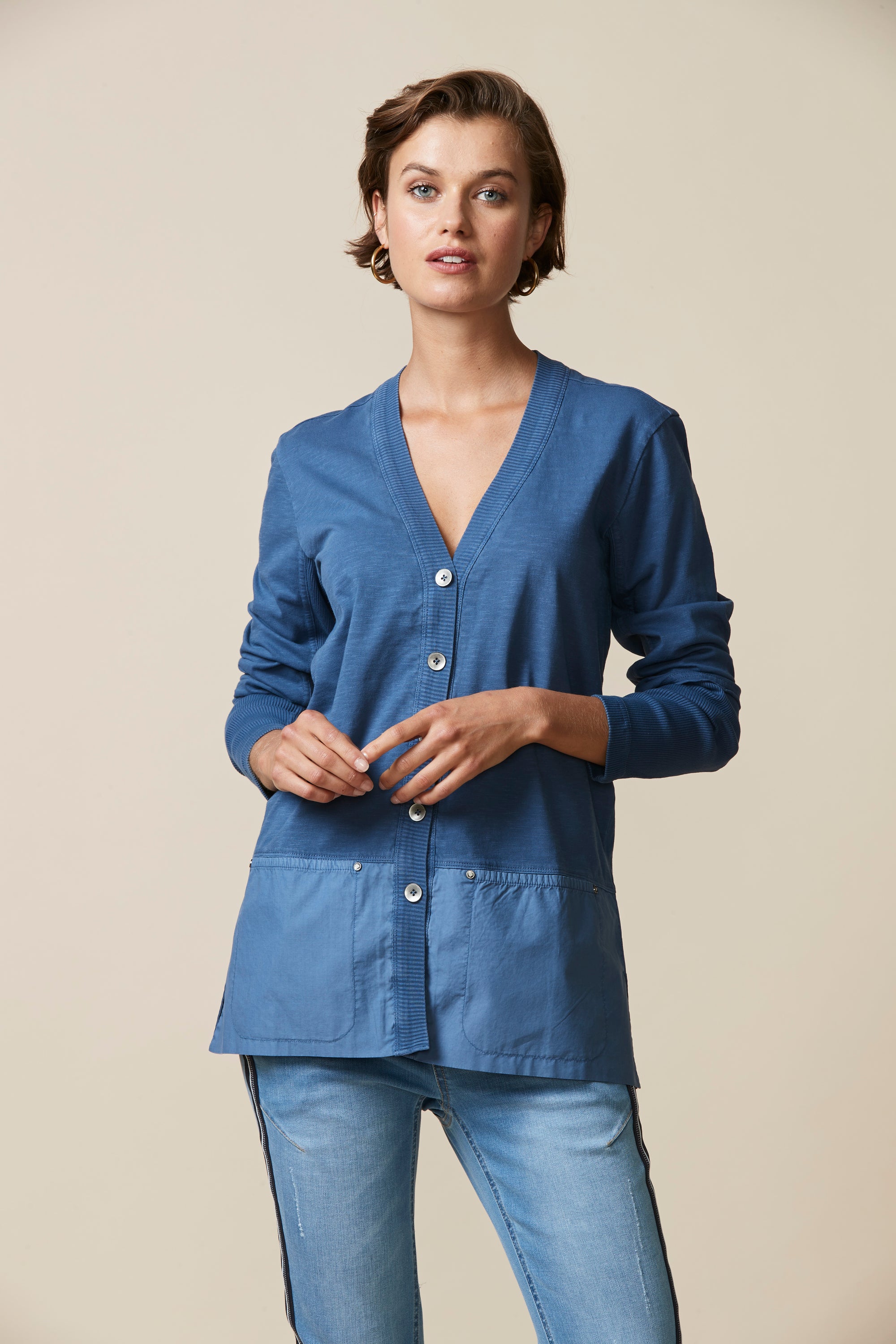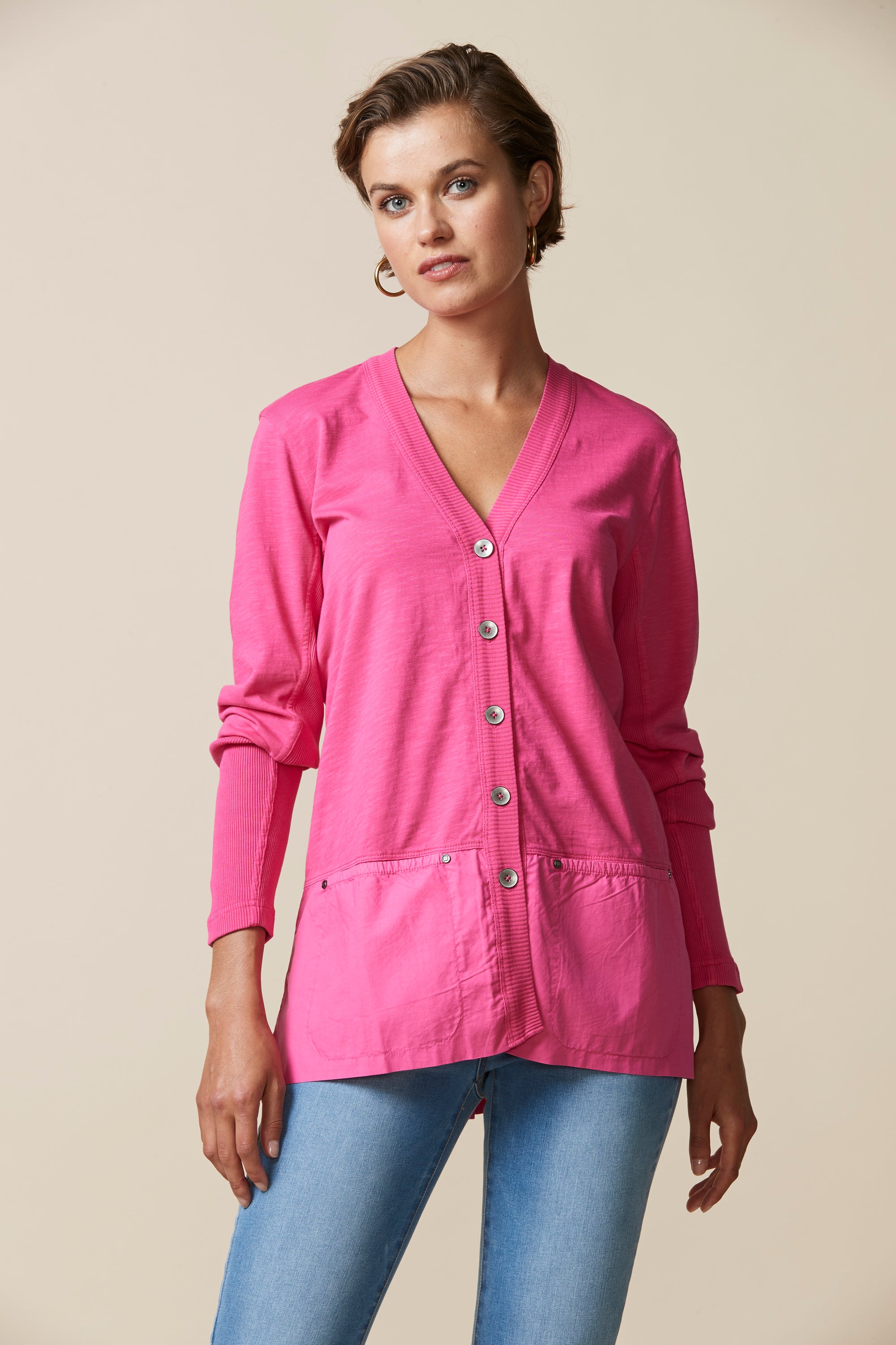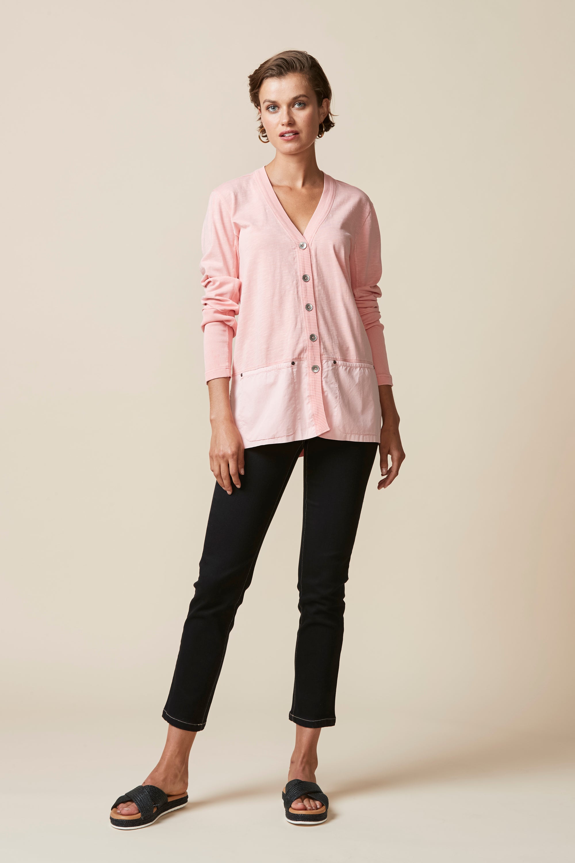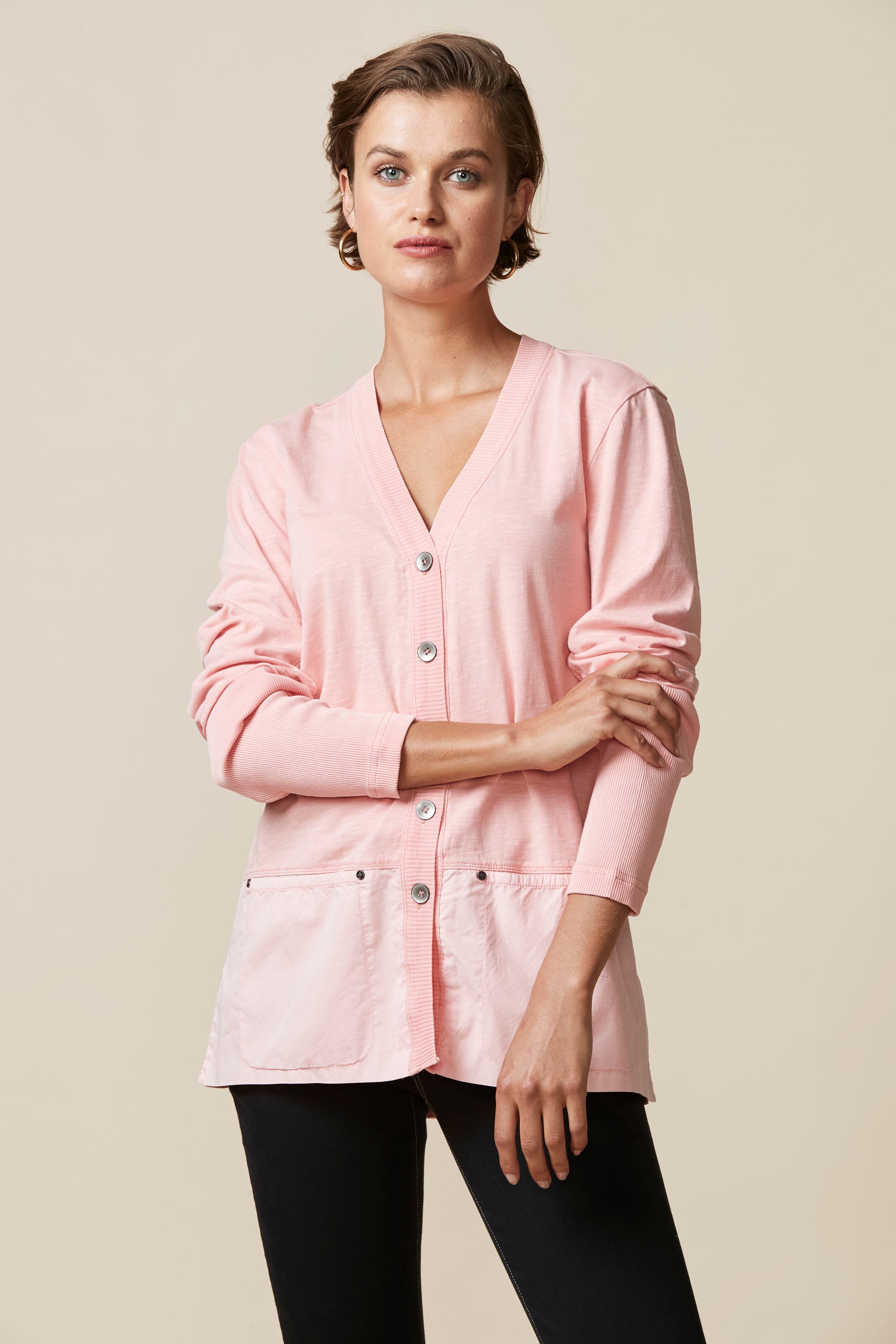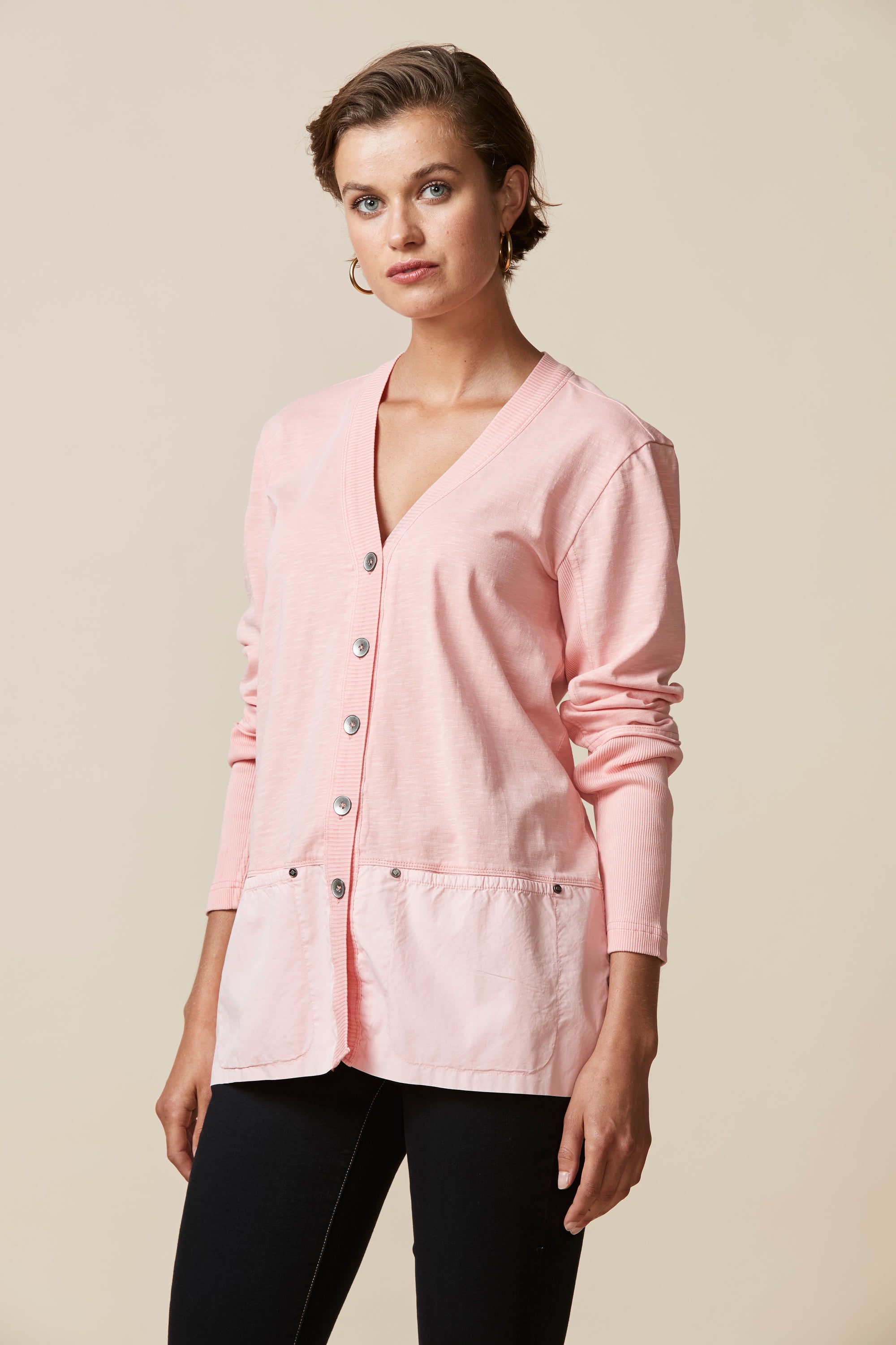 A light-weight cardigan handy for those cooler days. Deep rib cuff, contrast hem panel with overlapping split at centre back.