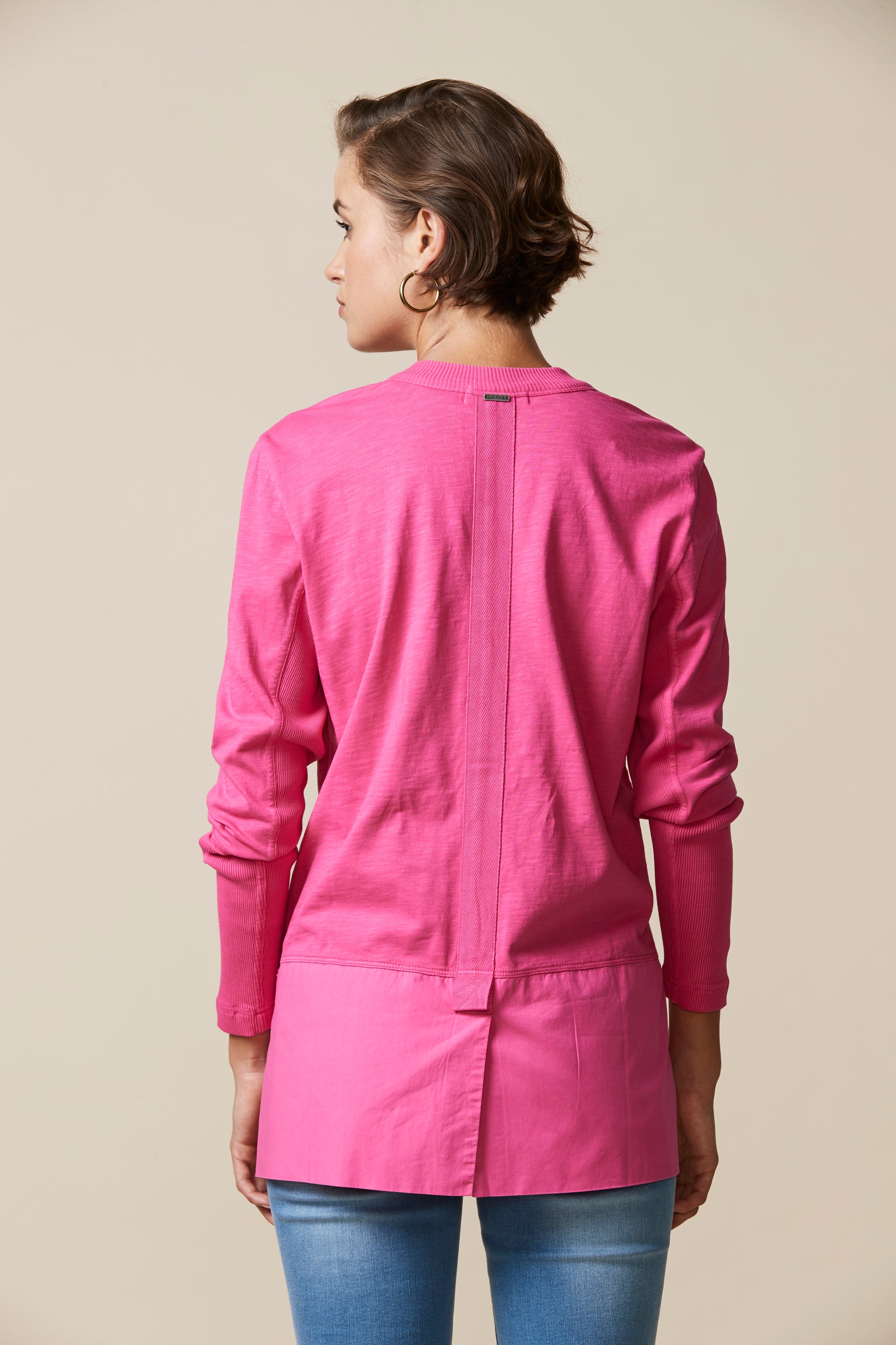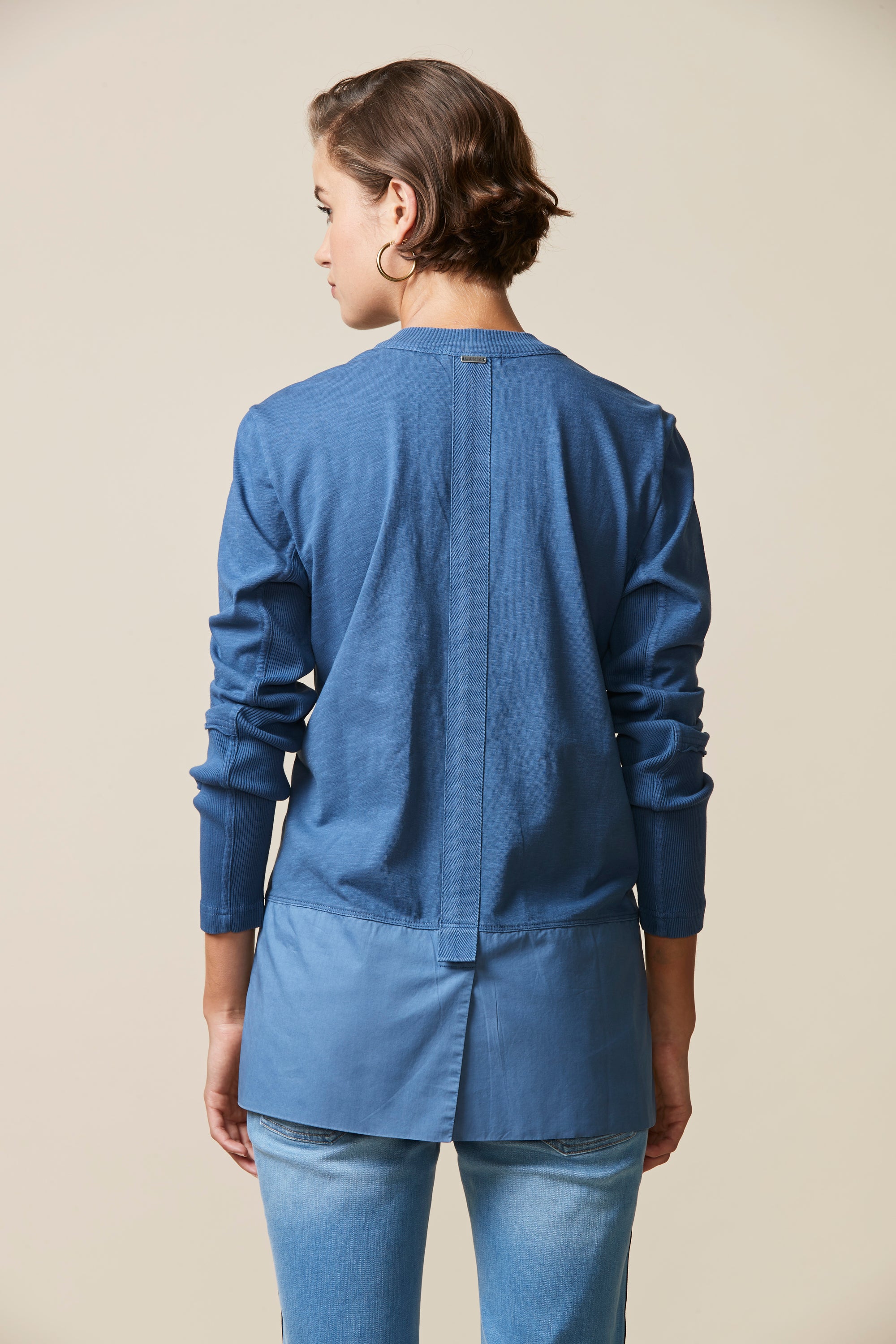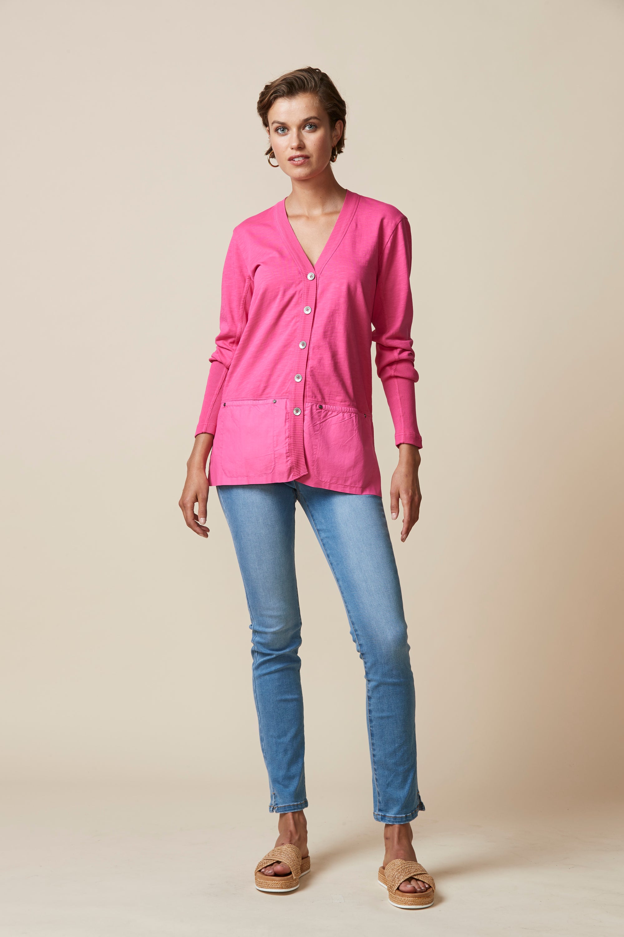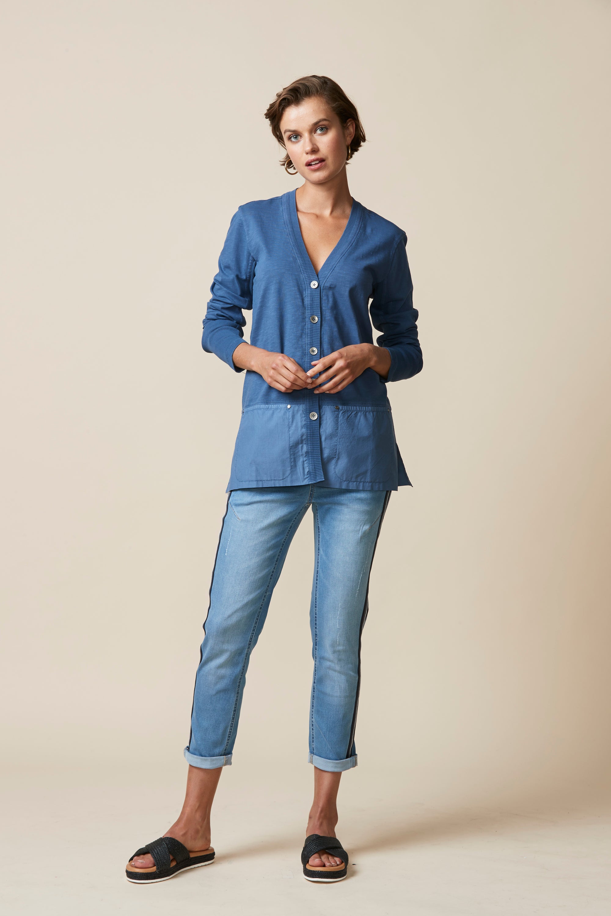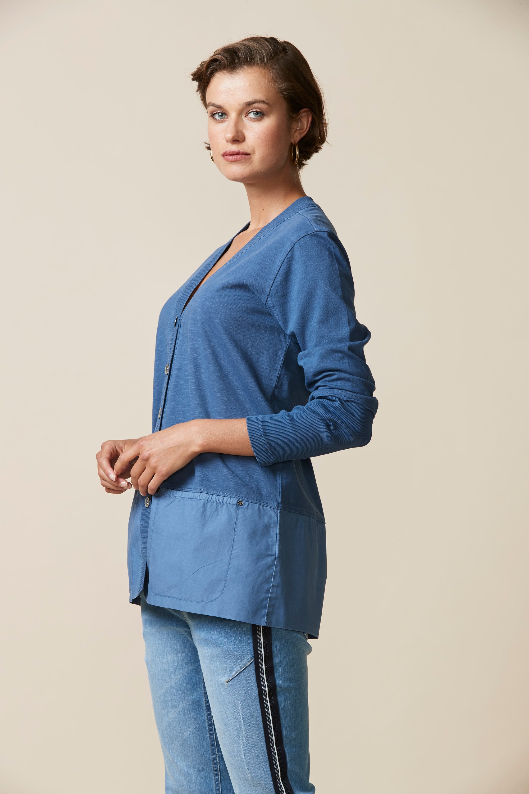 A light-weight cardigan handy for those cooler days. Deep rib cuff, contrast hem panel with overlapping split at centre back.