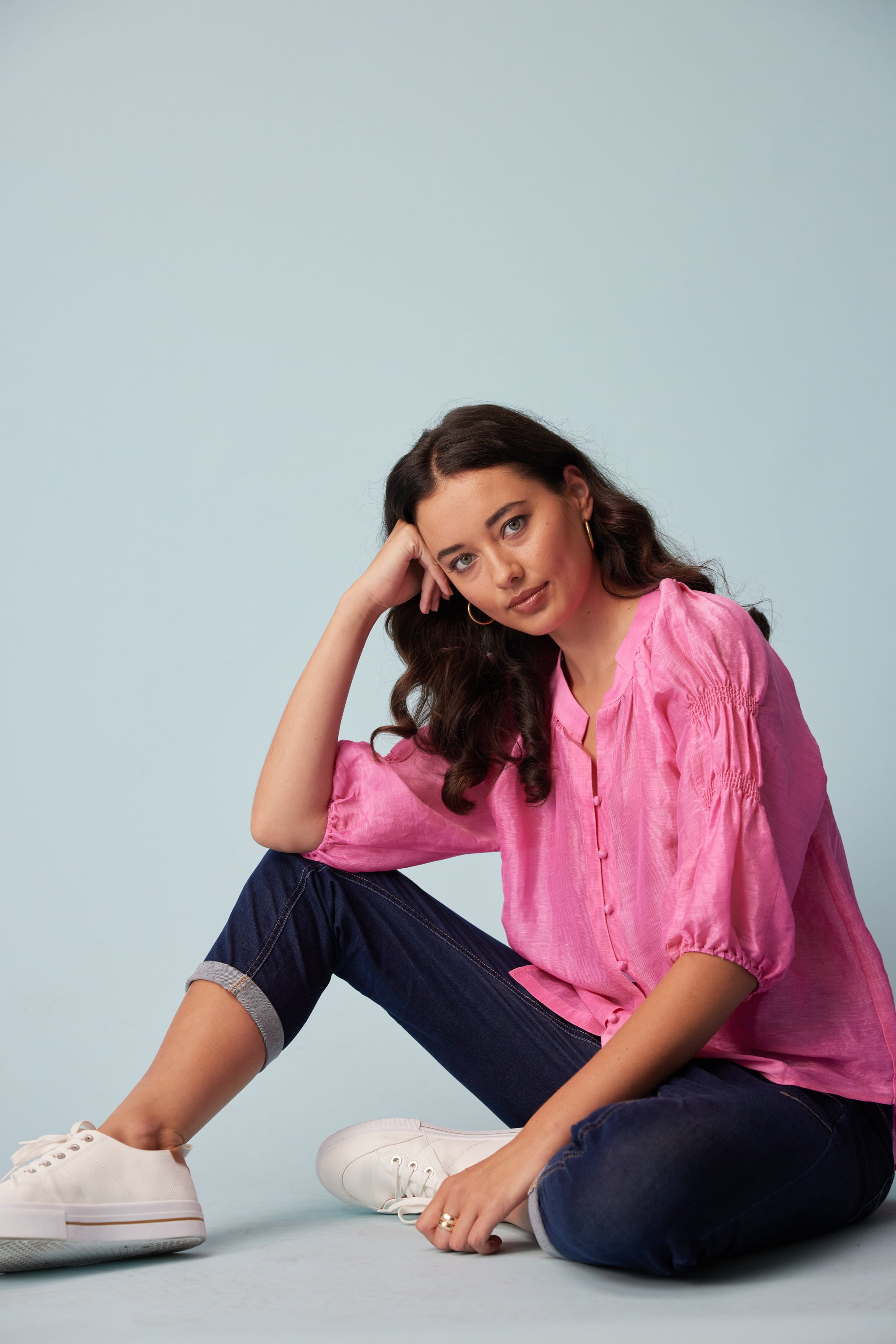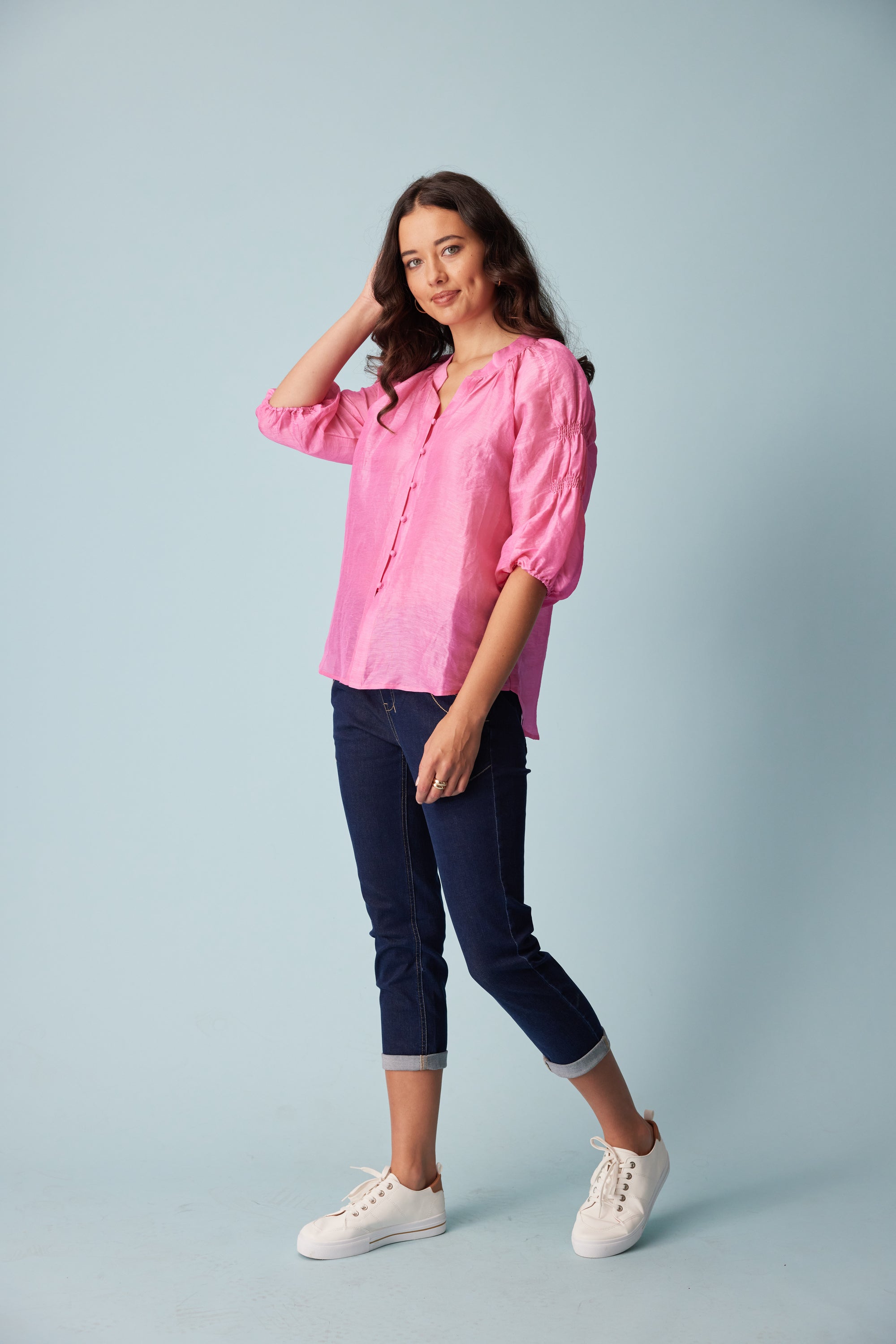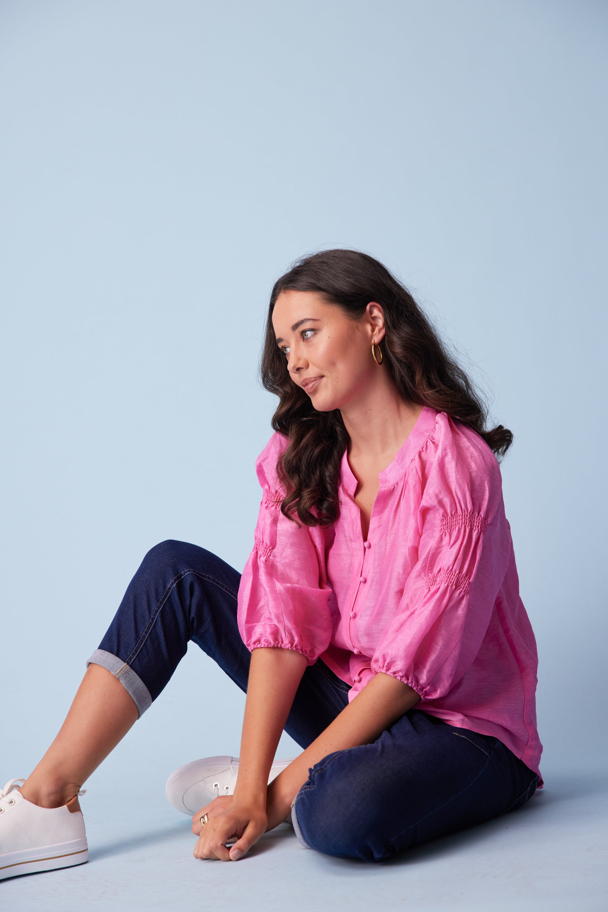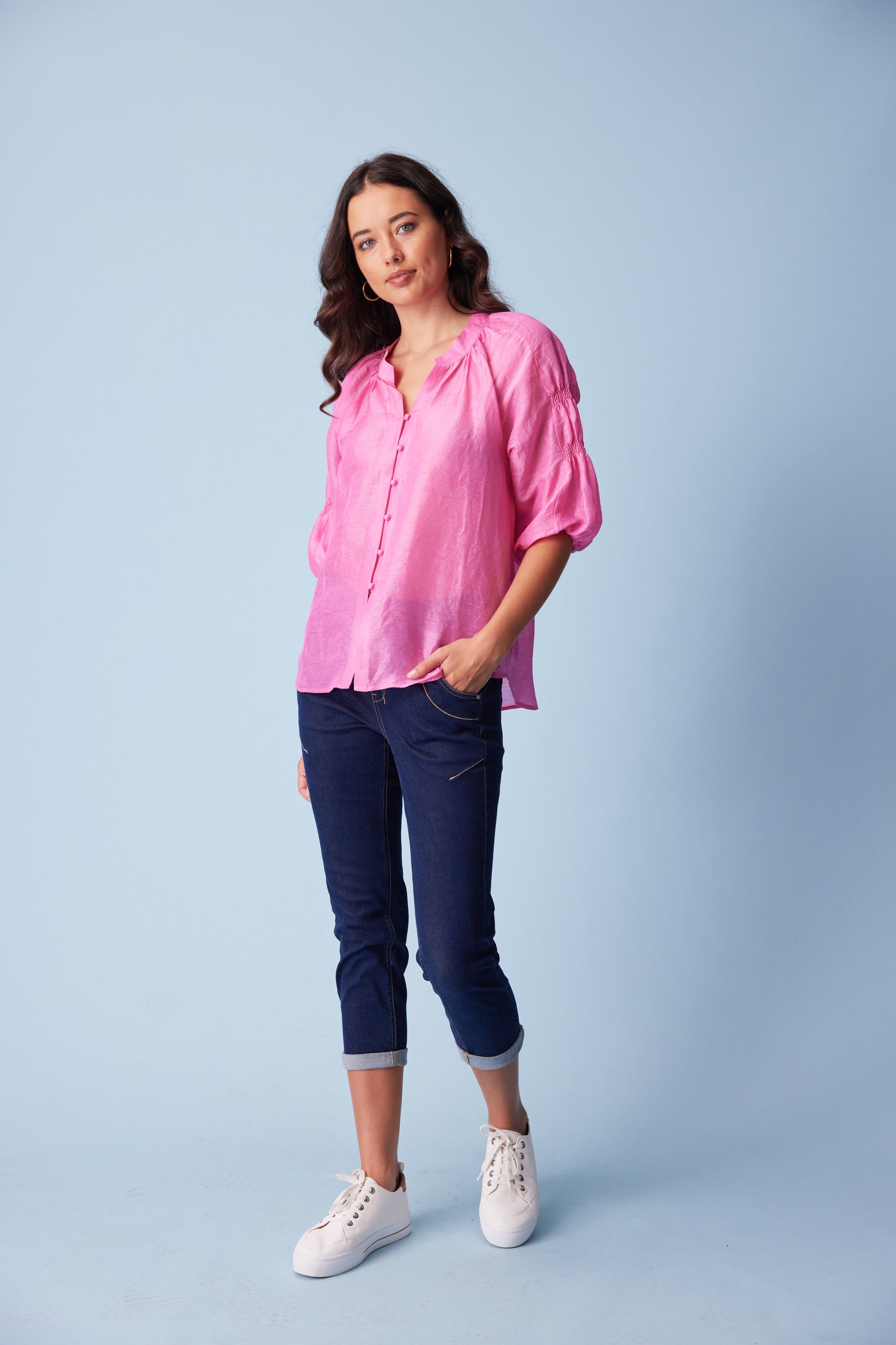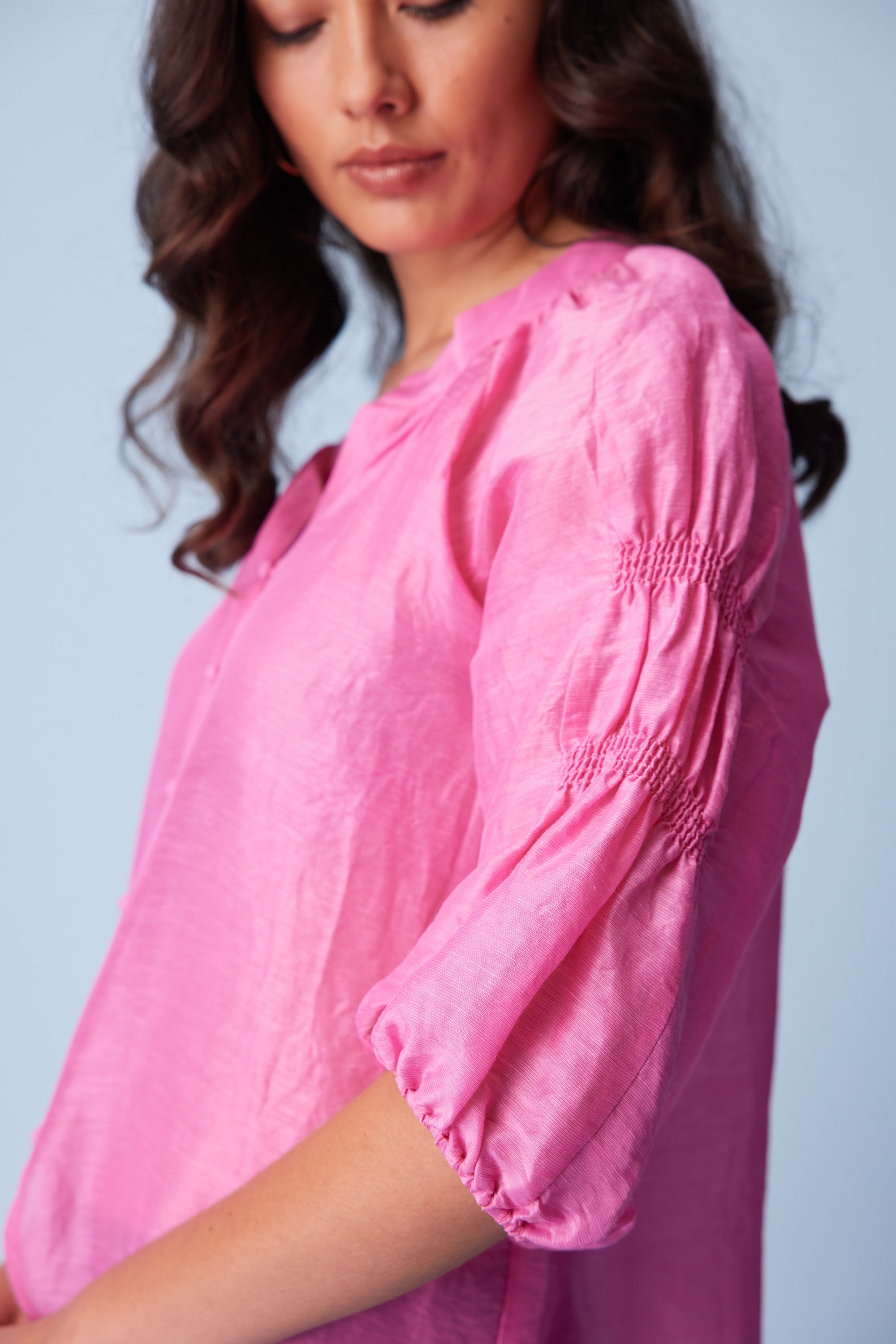 A textured silk linen shirting takes form in a relaxed fit raglan sleeve shirt. The soft gathered neckline, fabric covered buttons and shirring detail at the outer sleeves all contribute to the refined femininity of this style.