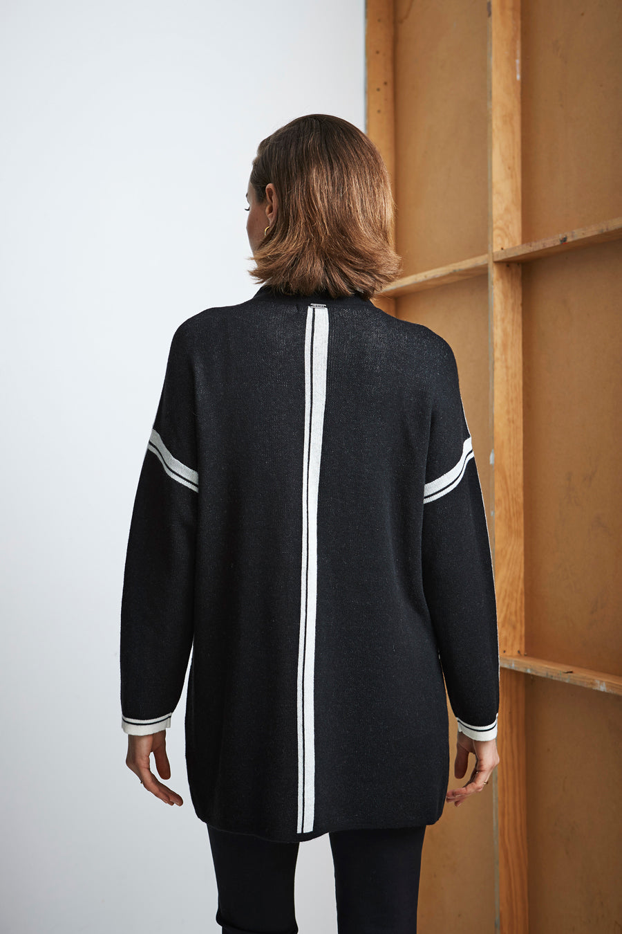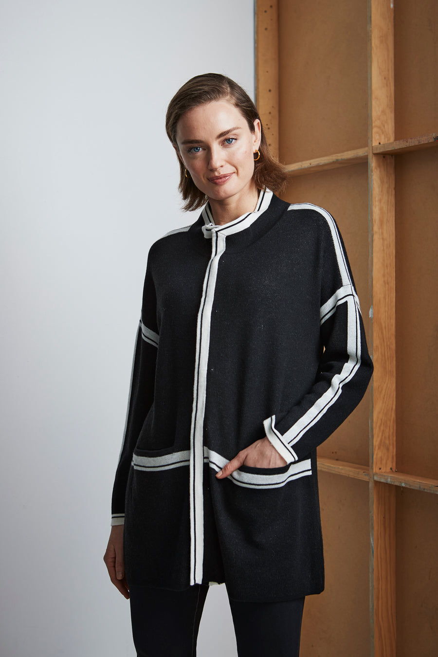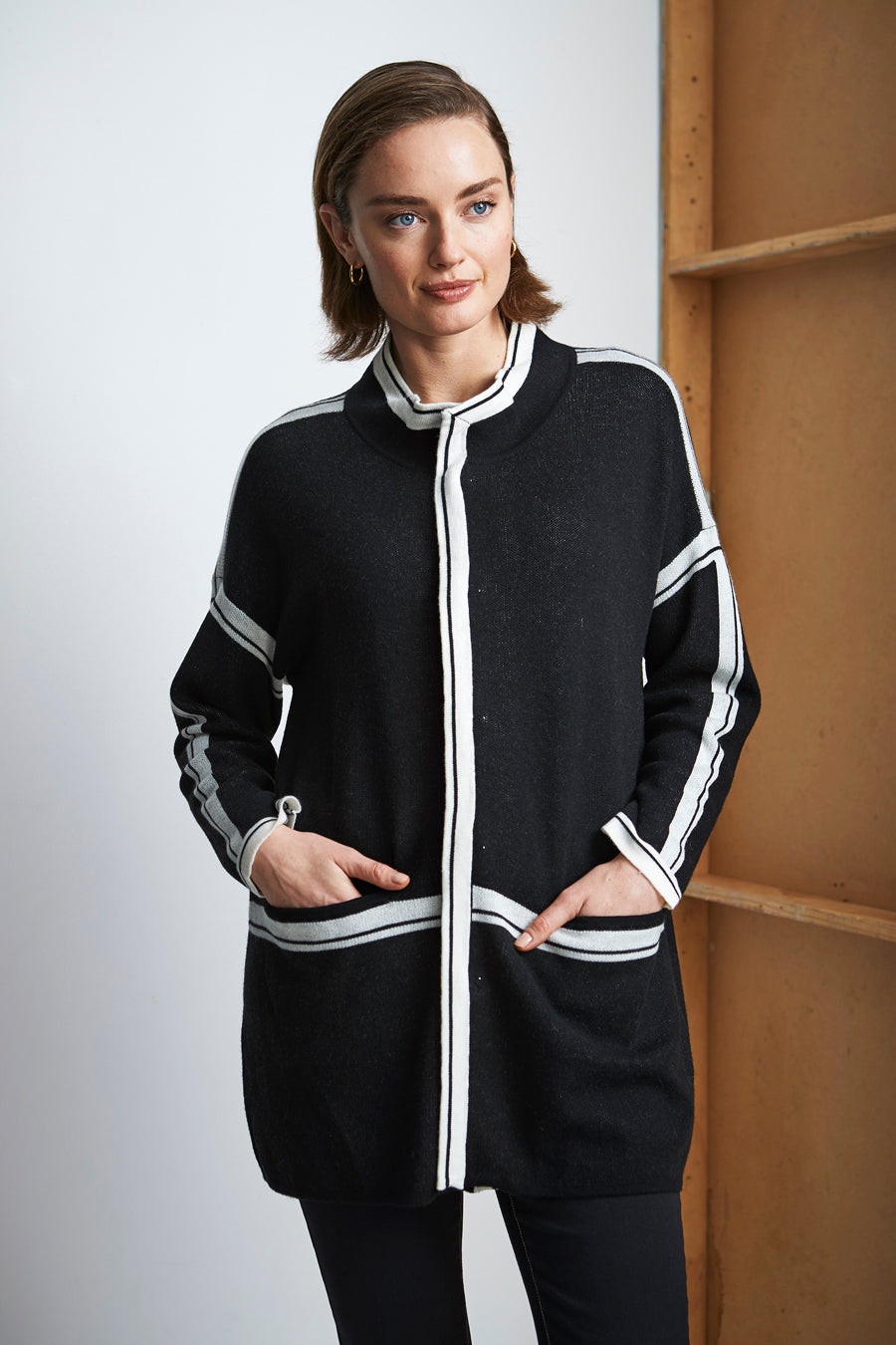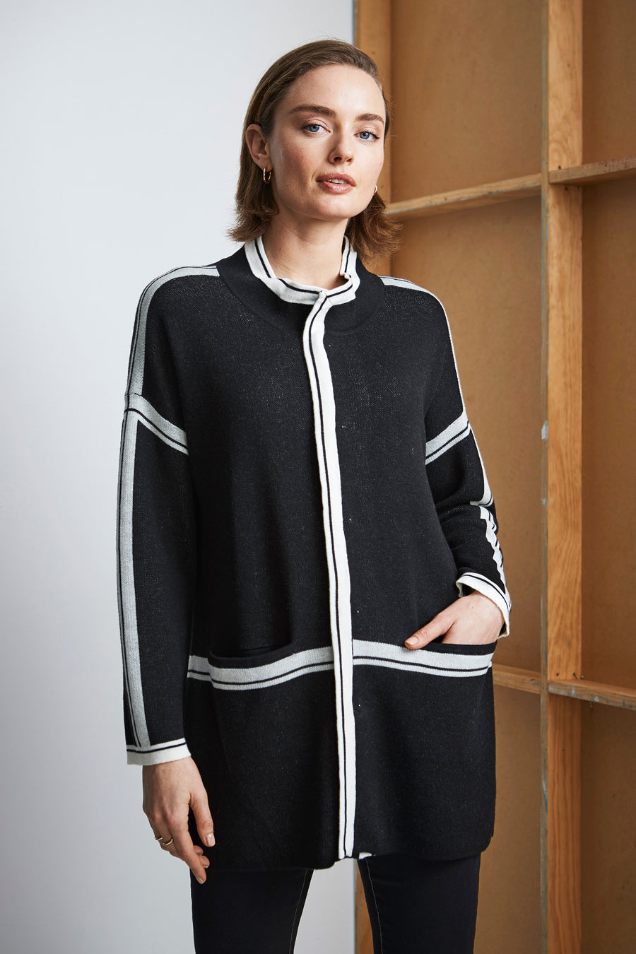This long line cardi — not-to-be-missed; stand collar, drop shoulder, domed front opening and front pockets. Showcasing clean contrast stripes around collar edge, front opening, centre back, waist and sleeves.