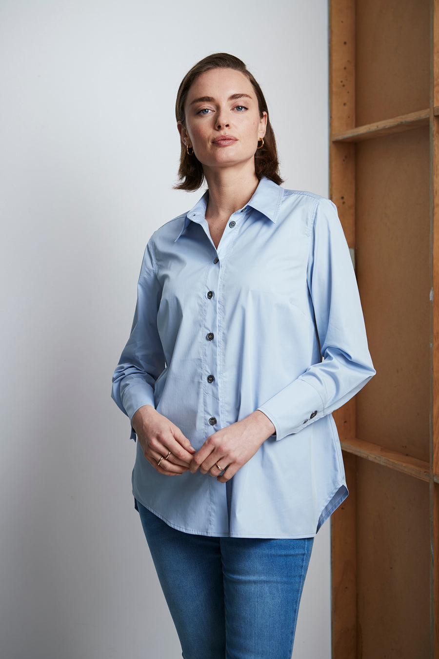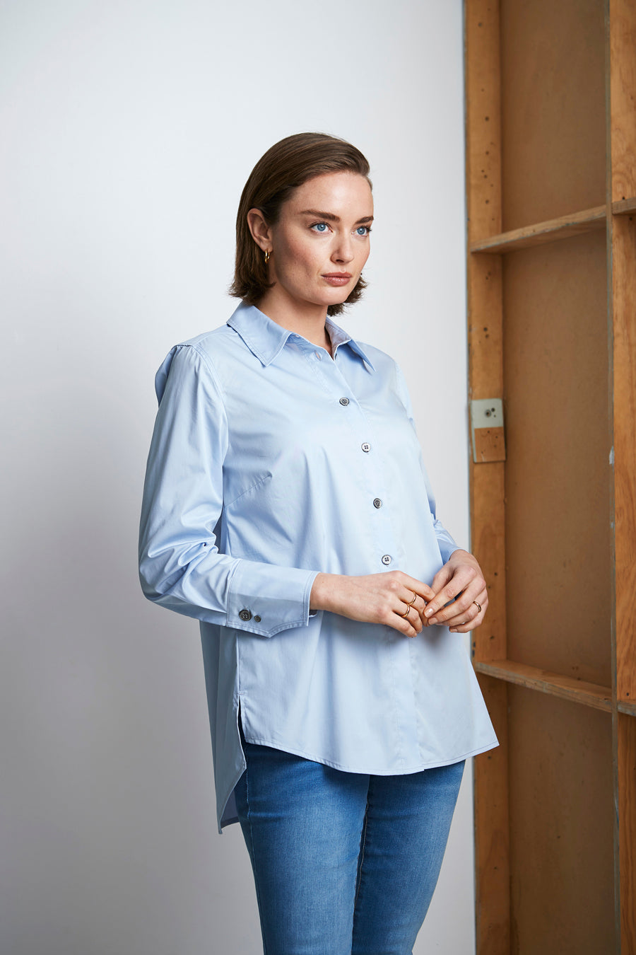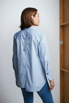 Super cool winter stretch shirt with antique nickel buttons and iconic cuff detailing, geometric shaped hemline, featuring novelty stripe tape at back yoke.
