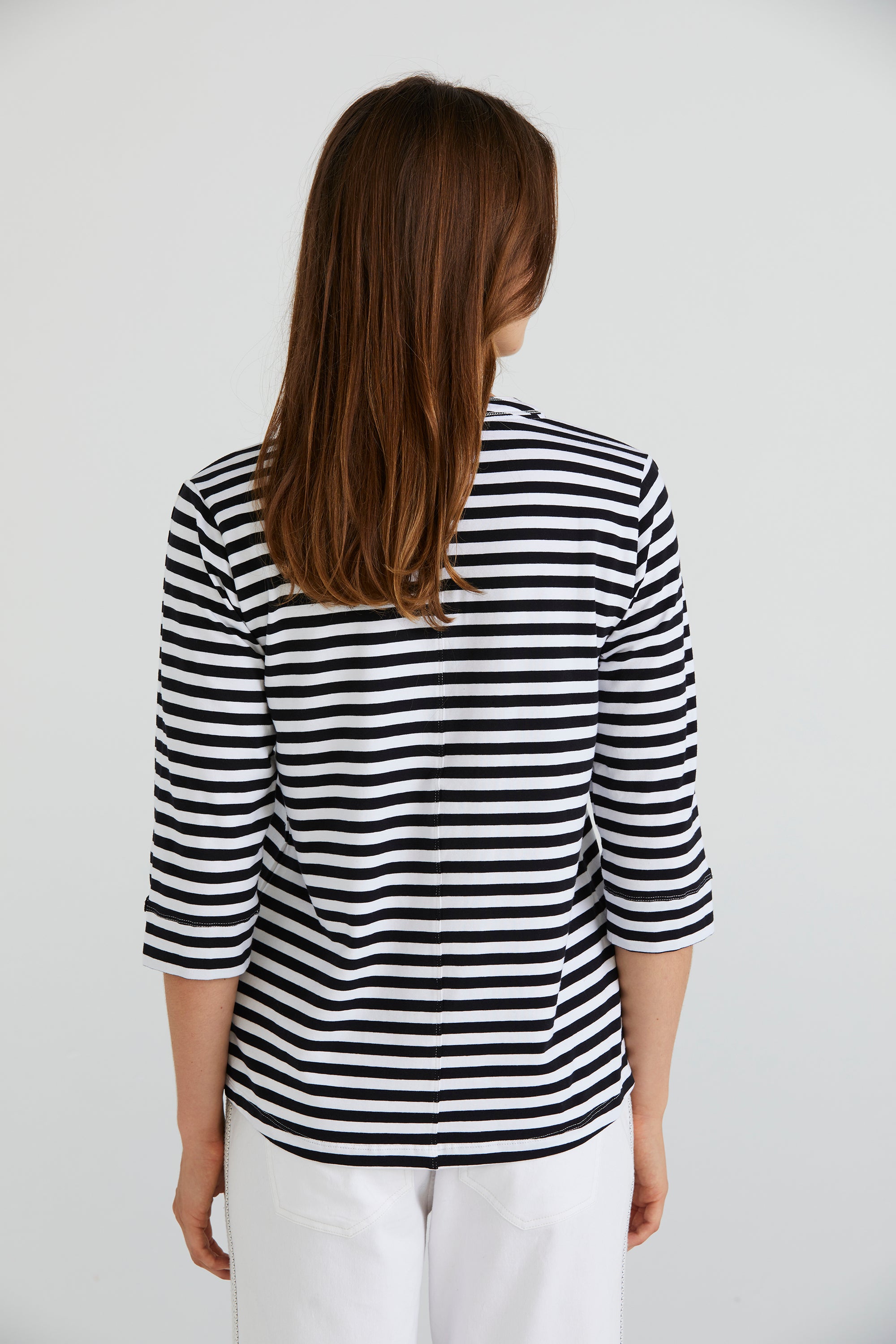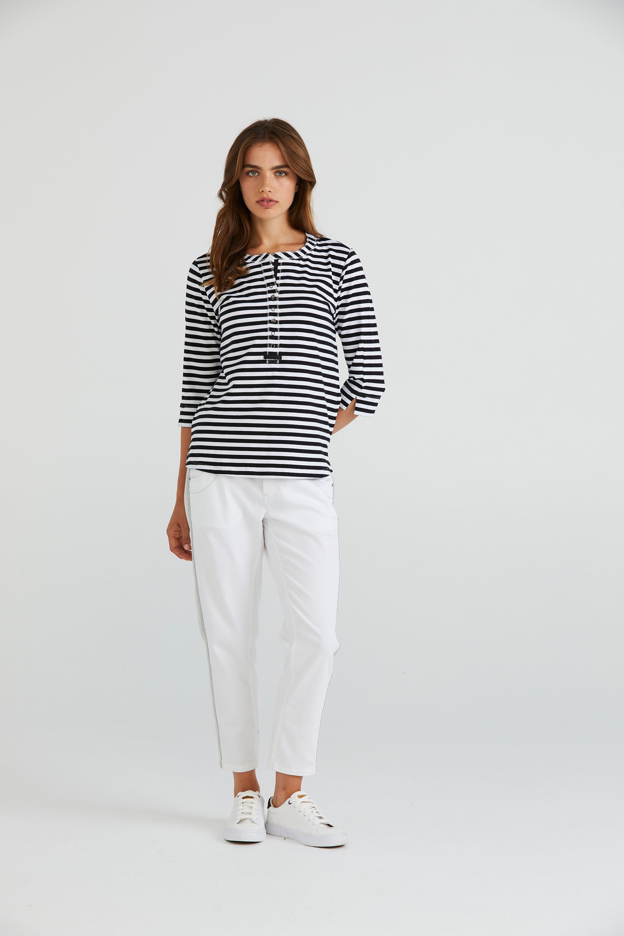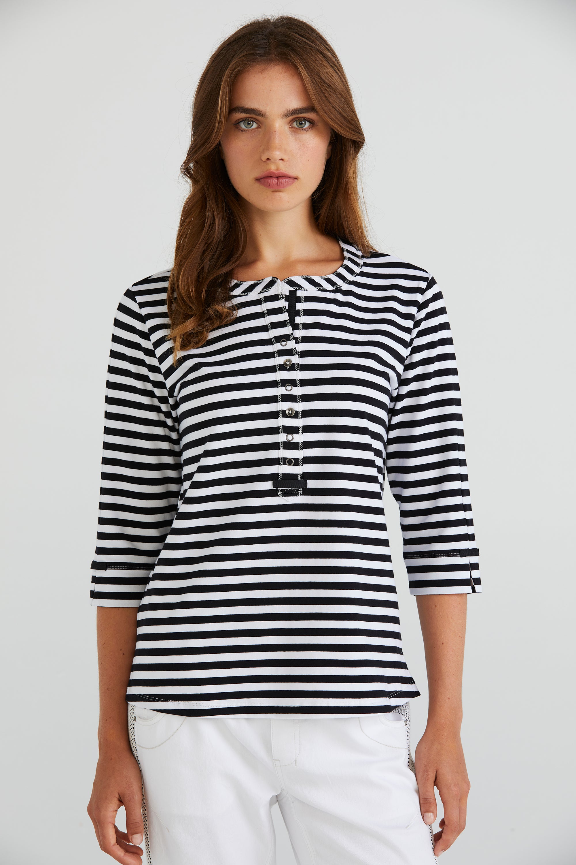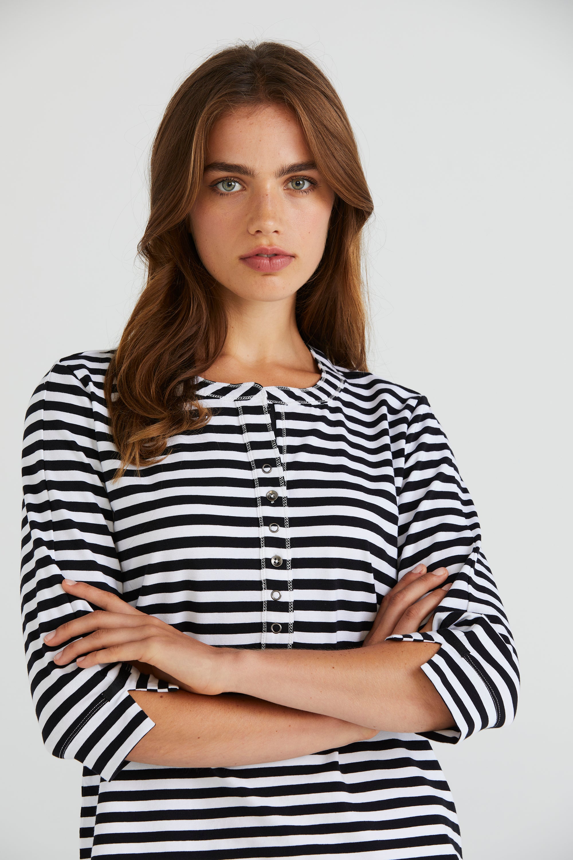 Elevate your modern comfort with our Sugar Top. Made from striped stretch cotton, it boasts a deep placket neckline adorned with snap domes and metallic buttons for a contemporary twist. The dyed-to-match tape detail on the under-placket and placket loops adds a touch of sophistication.