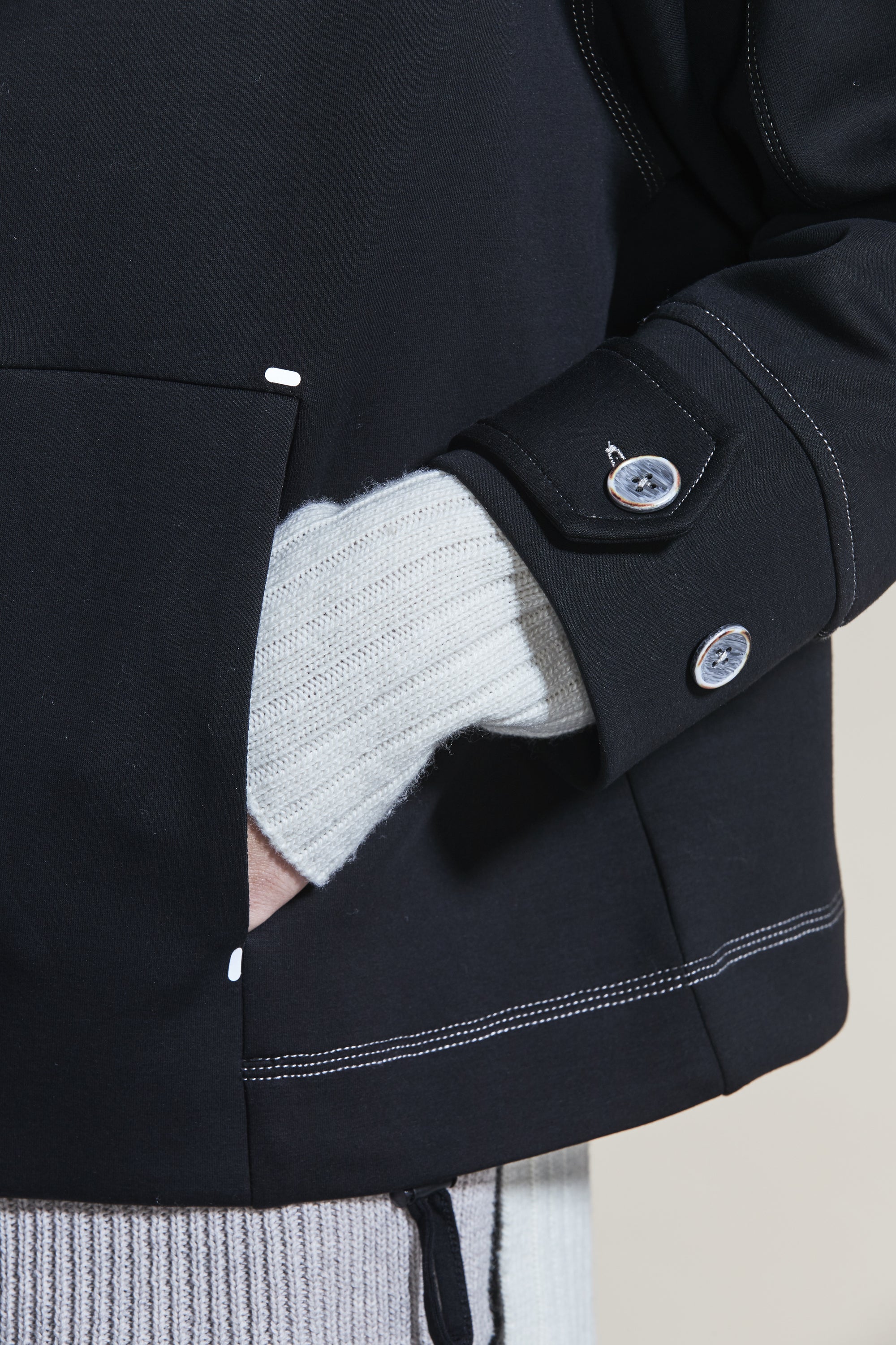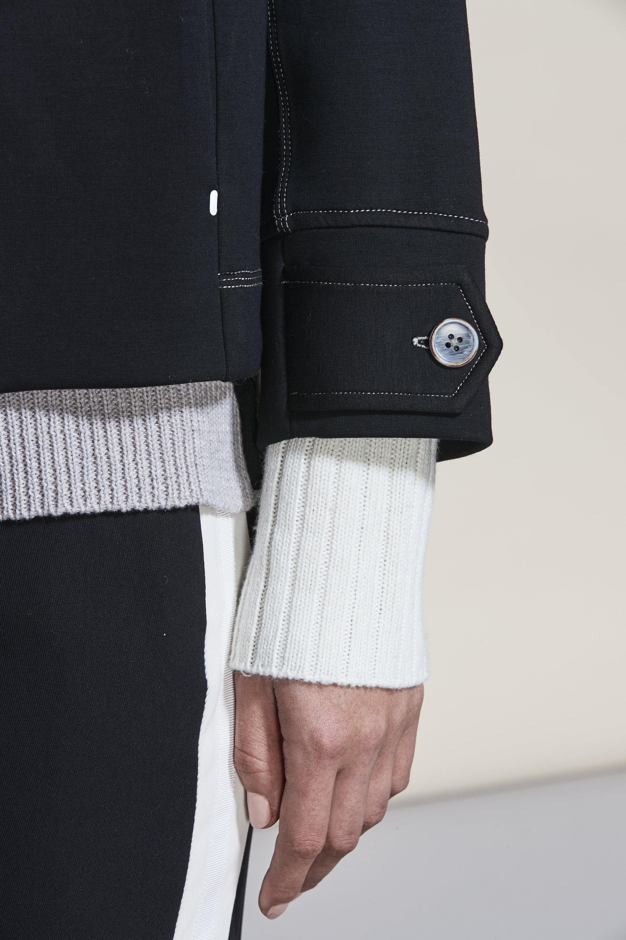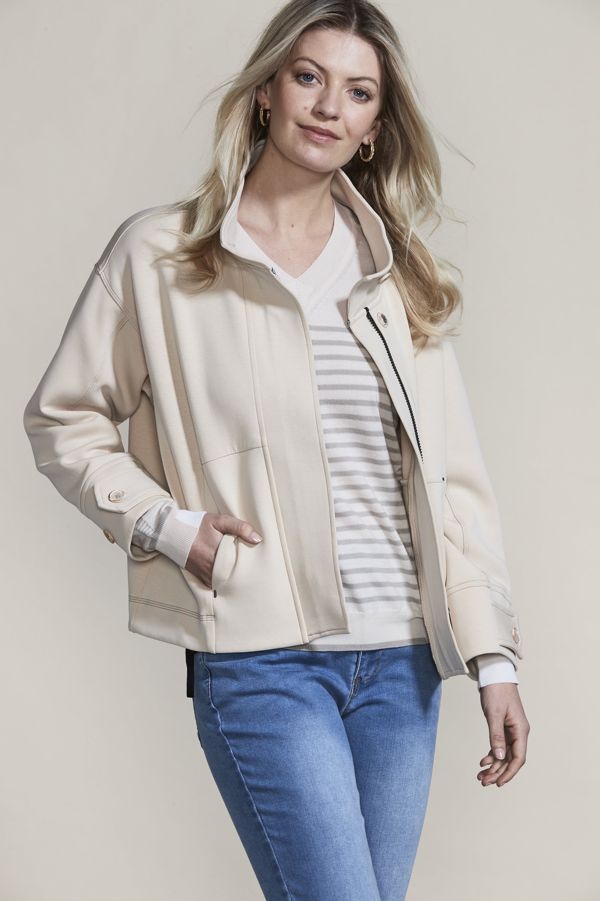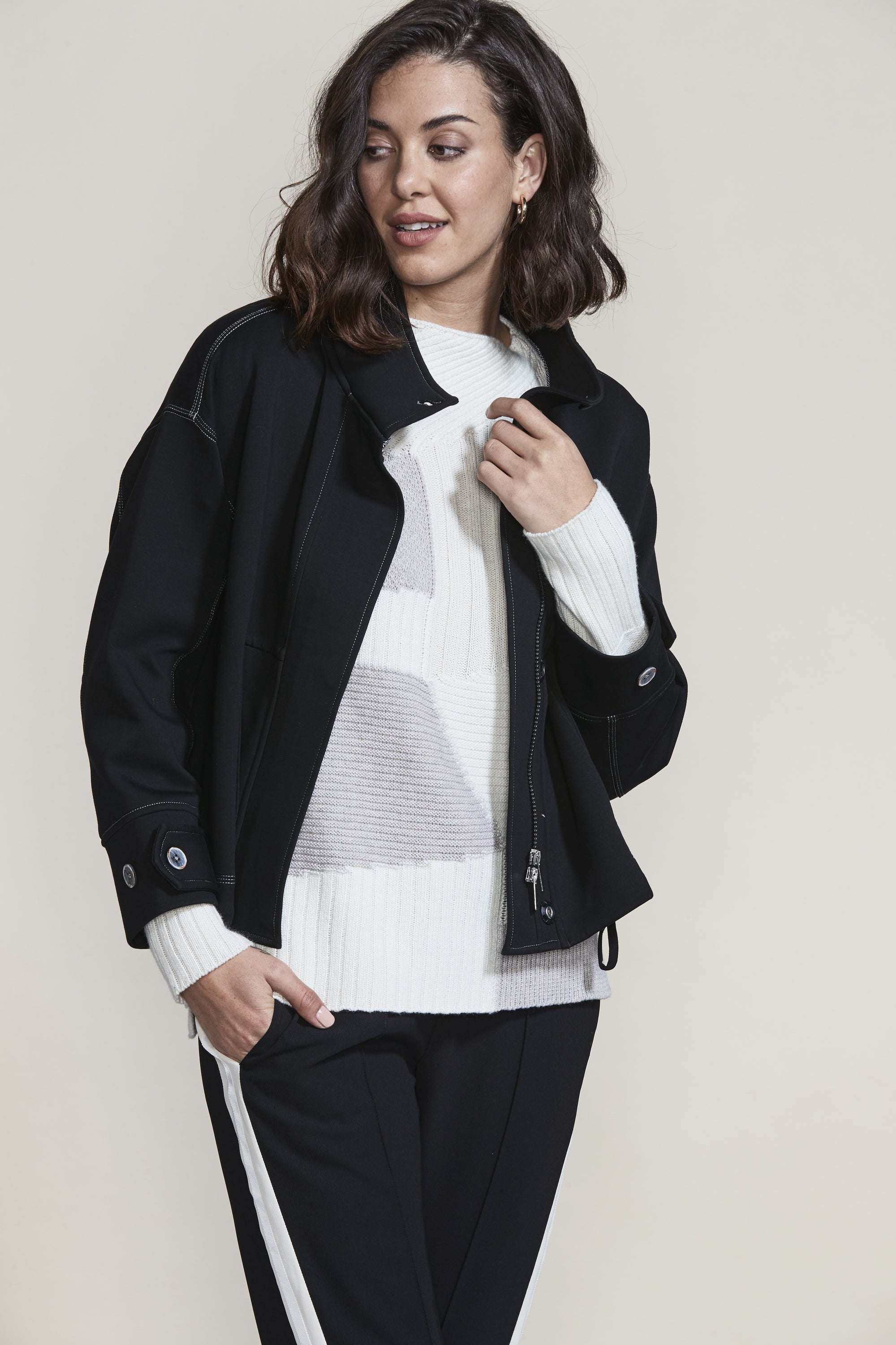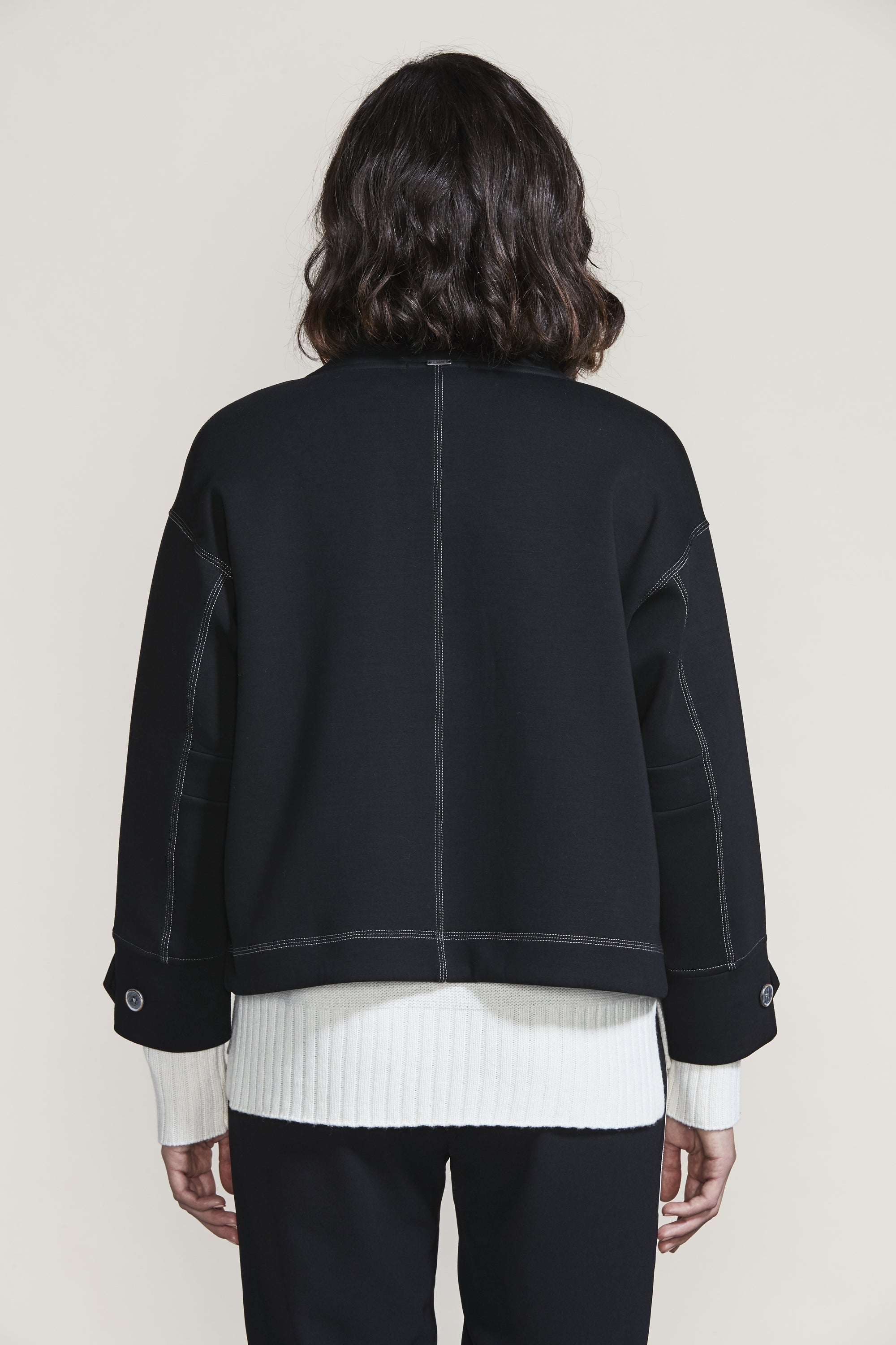 A modern boxy jacket in sleek bonded jersey. Subtle sporty details such as heat sealed tape, contrast stitching and internal drawcord hem complete the sports luxe feel.