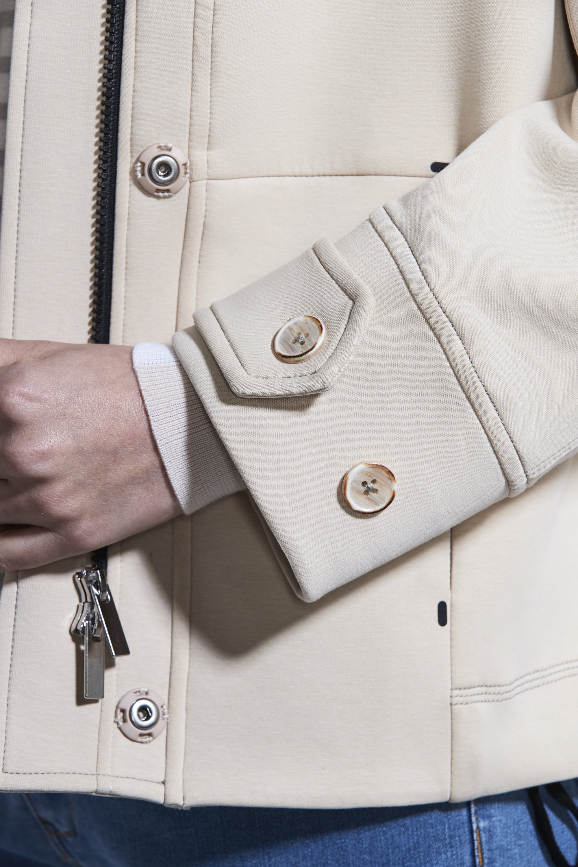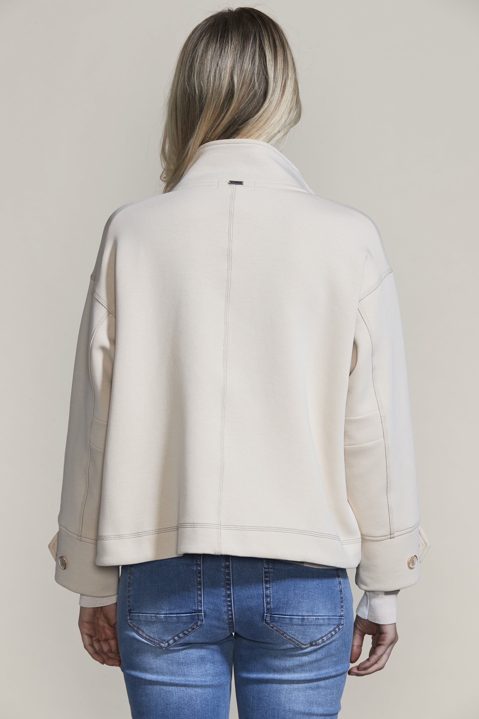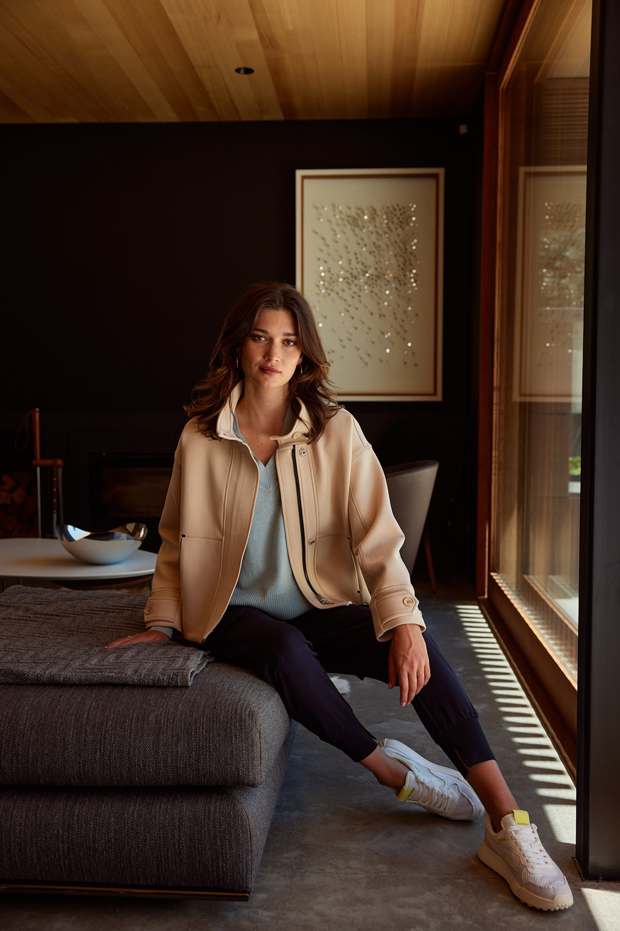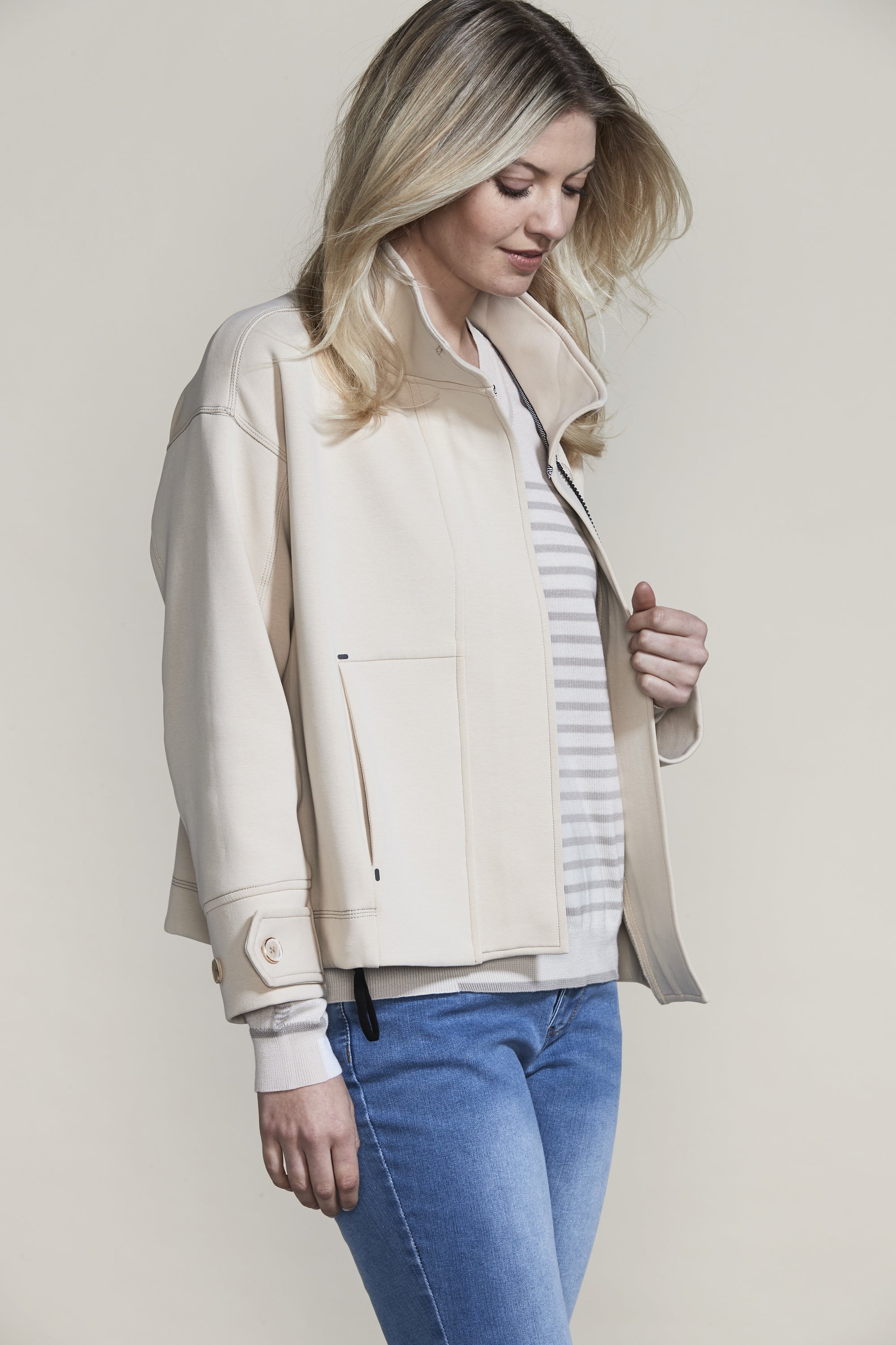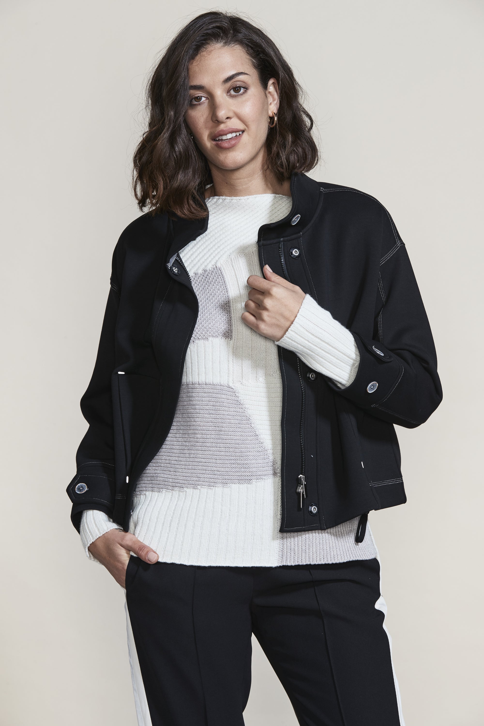 A modern boxy jacket in sleek bonded jersey. Subtle sporty details such as heat sealed tape, contrast stitching and internal drawcord hem complete the sports luxe feel.