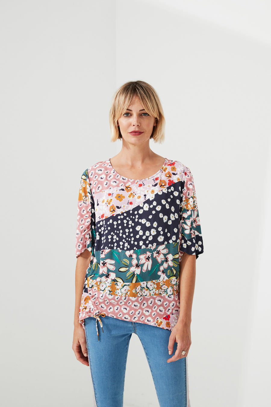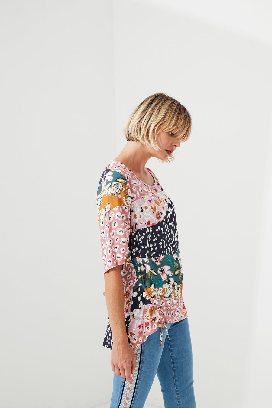 An eye catching top in our Swipe Floral print, featuring hem shaping, and drawstring detail, short sleeves with soft gather detail.