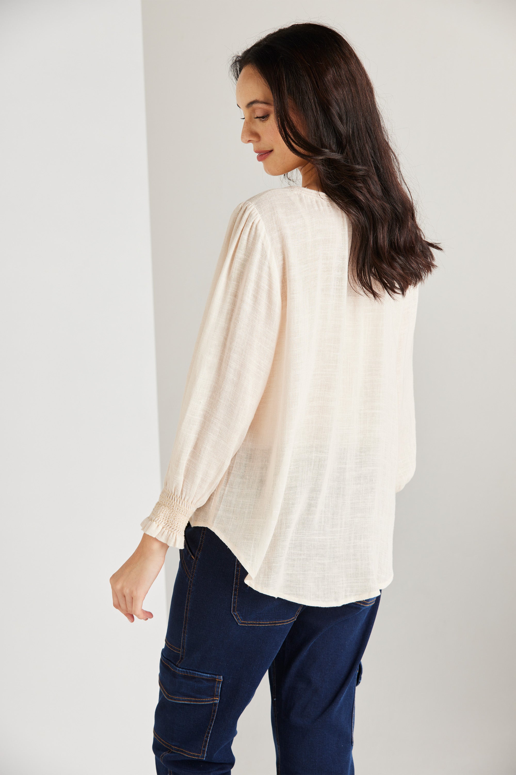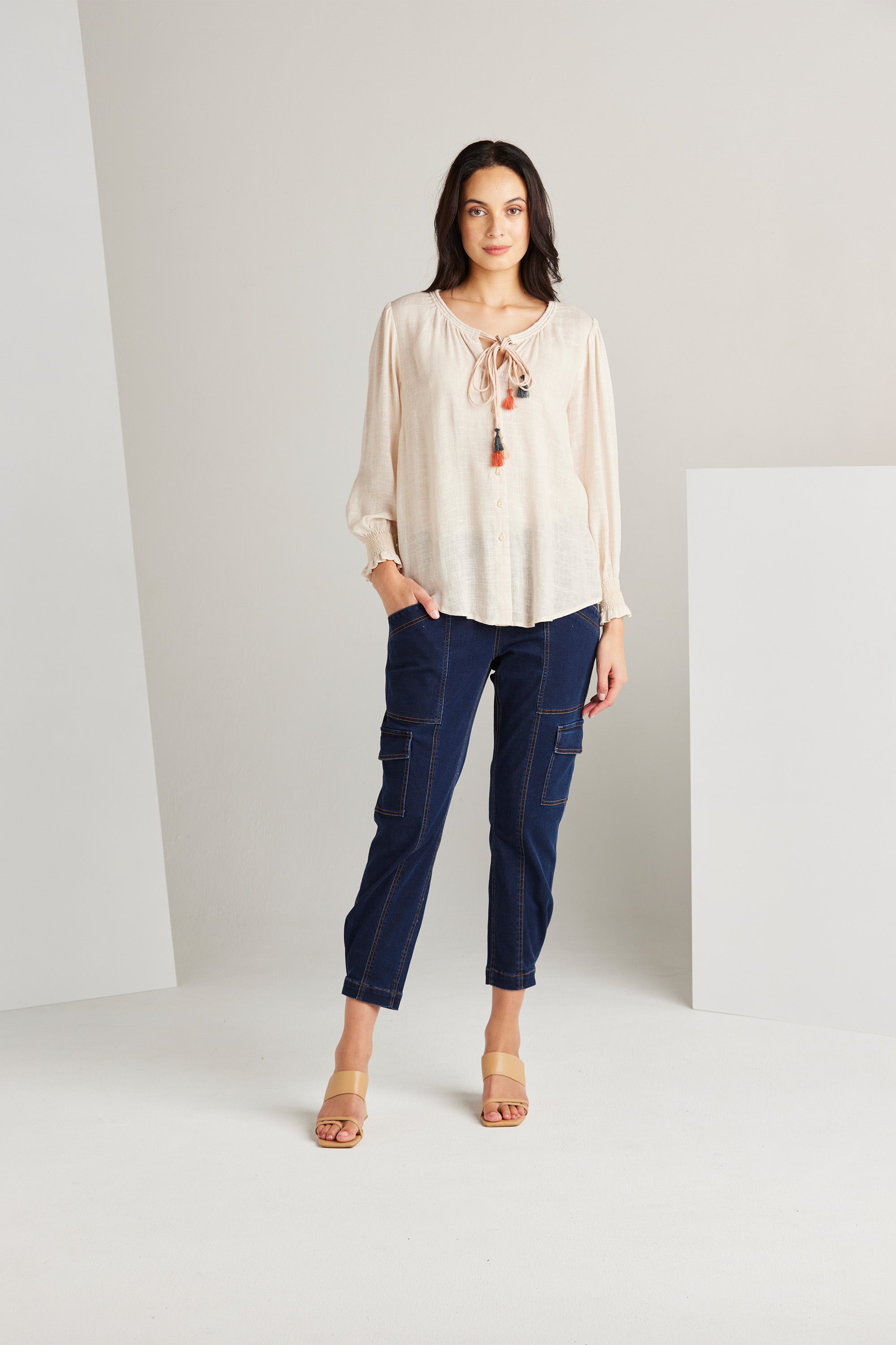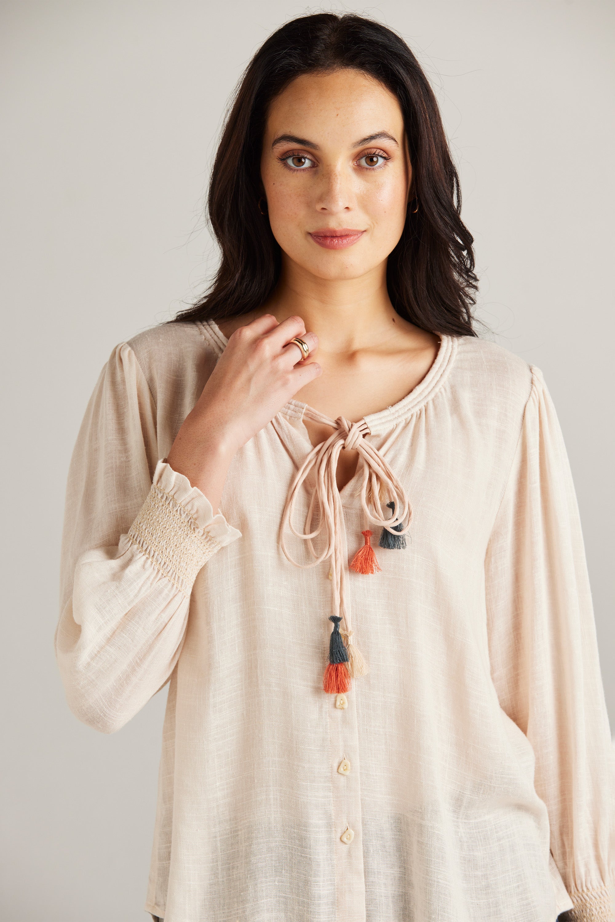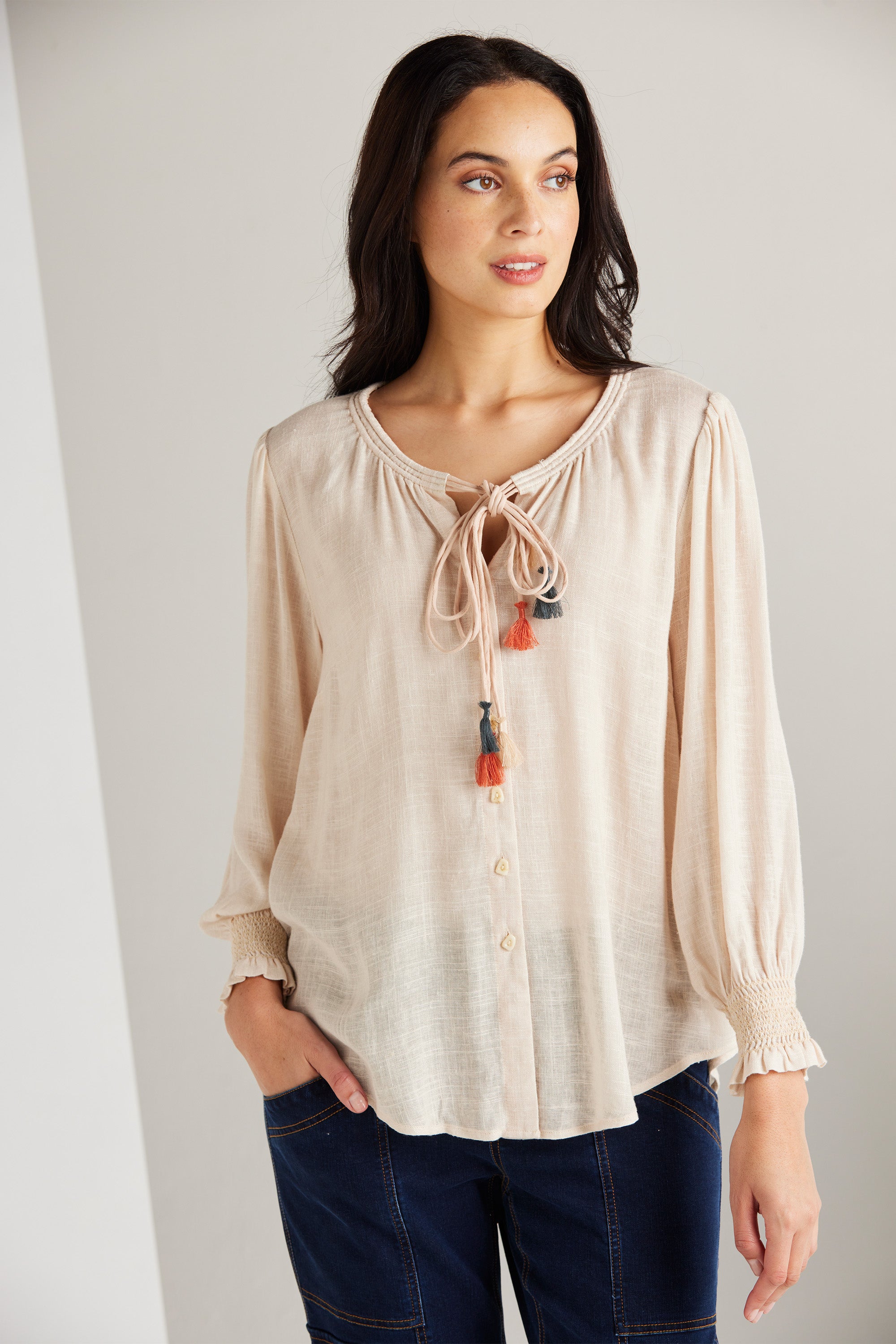 The Tassel Top is a culmination of feminine style and simplicity. Cut in a lightweight rayon linen blend, it evokes a romantic and artisanal air. Beautifully crafted casing with rouleau ties around the neckline and mixed colours tassel ends add a playful touch.