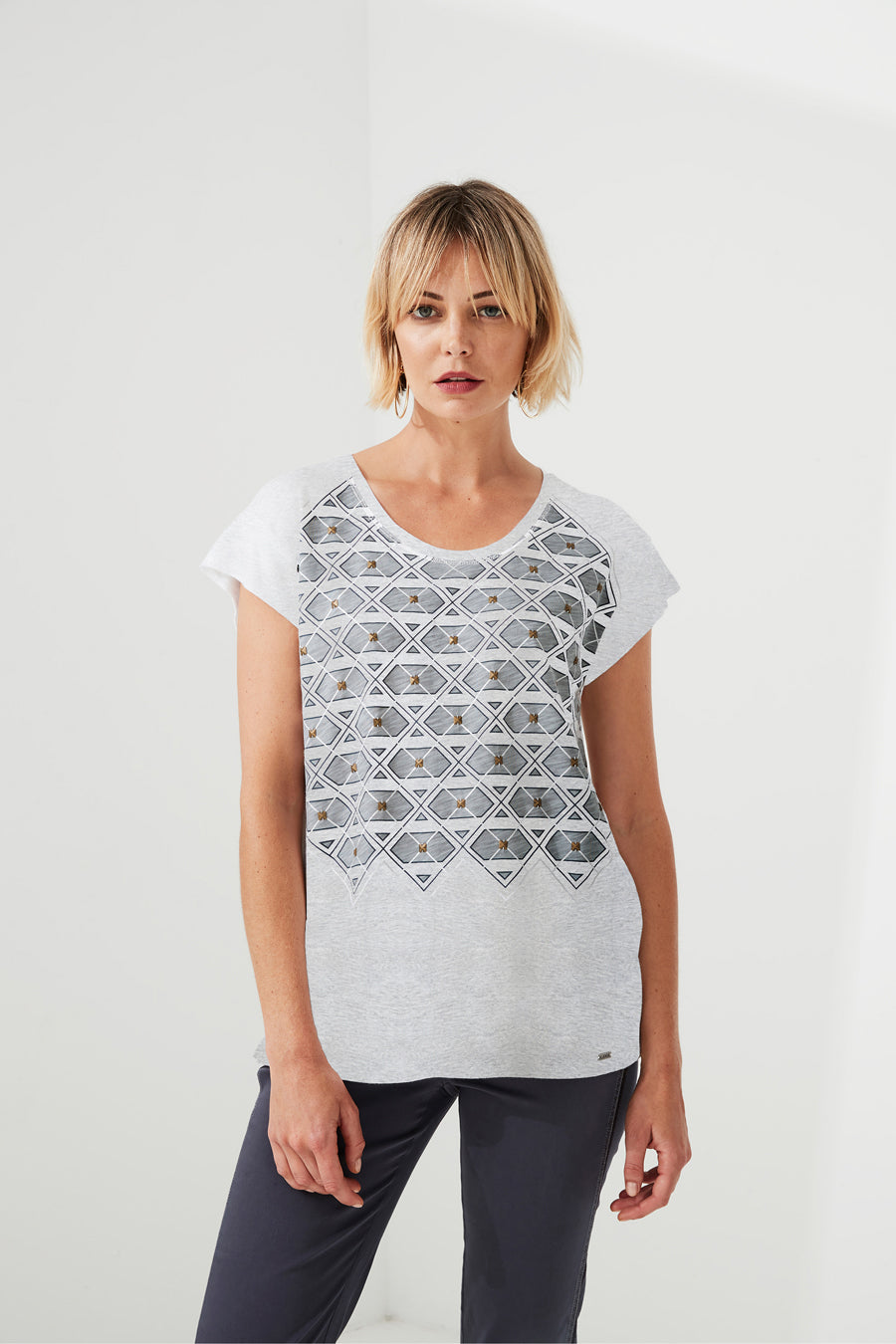An essential soft stretch cotton blend tee, scooped neck, cap sleeve, with screen print and embellishment on front.