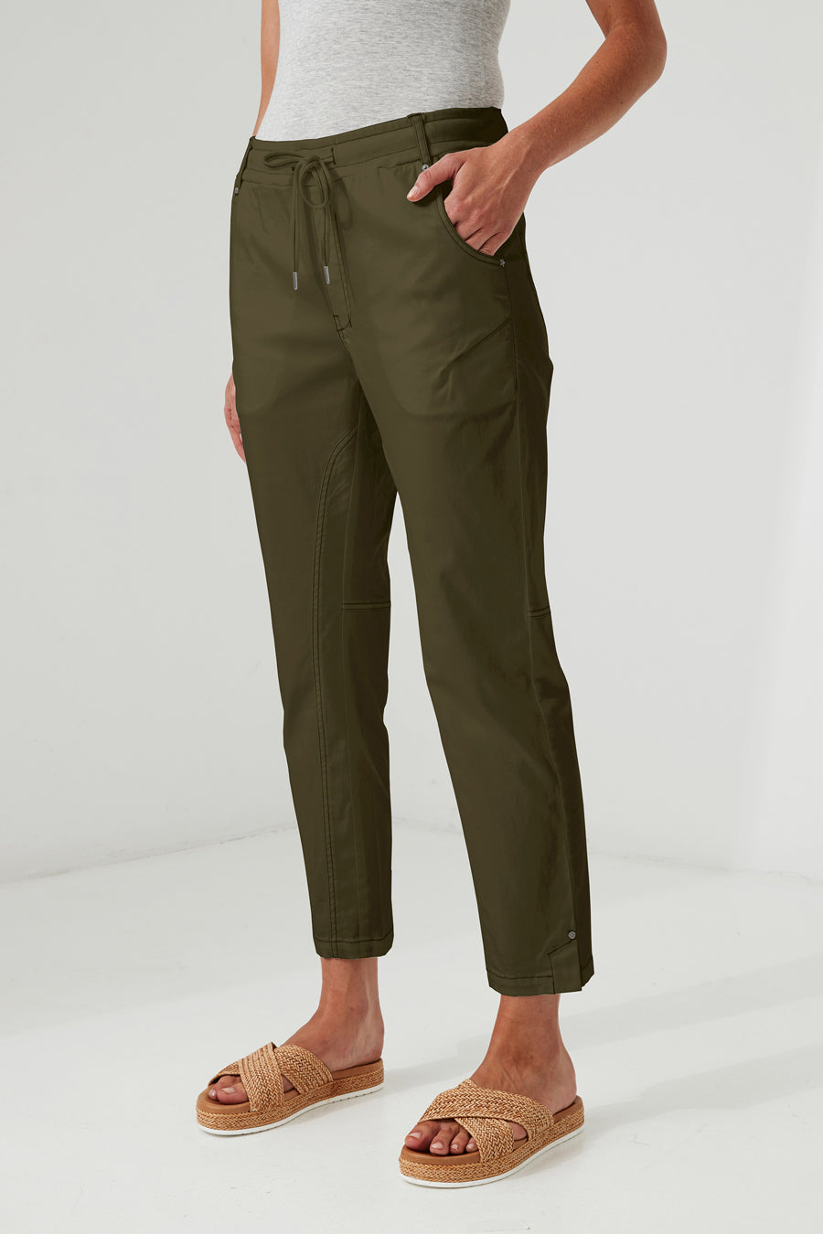 A cool casual 7/8 pant, elastic rib waistband with drawcord, mock fly and front pockets. The soft handle and slightly distressed finish is achieved by special garment wash.