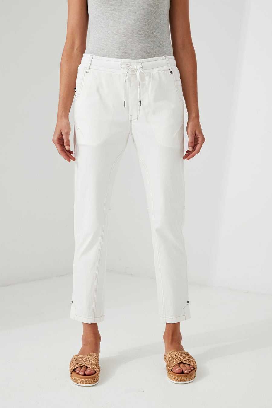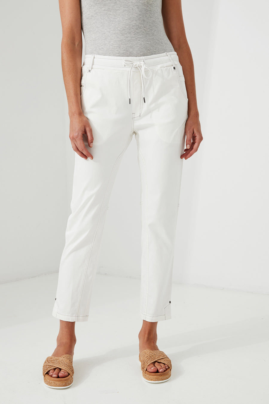 A cool casual 7/8 pant, elastic rib waistband with drawcord, mock fly and front pockets. The soft handle and slightly distressed finish is achieved by special garment wash.