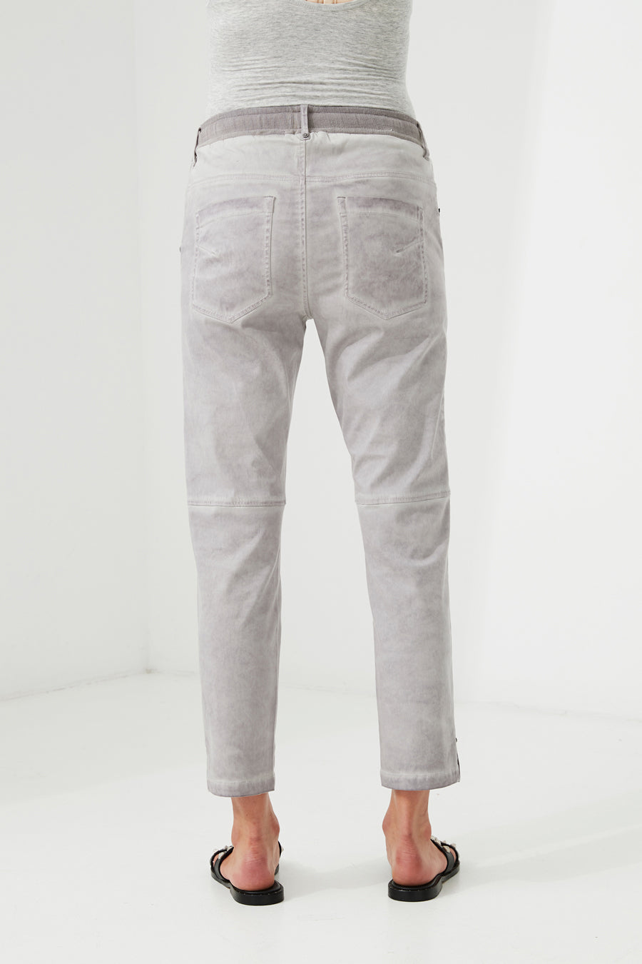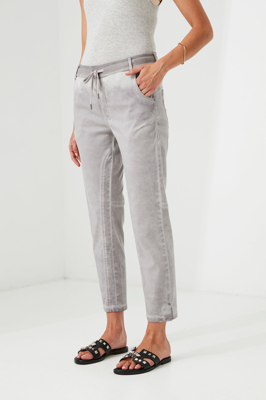 A cool casual 7/8 pant, elastic rib waistband with drawcord, mock fly and front pockets. The soft handle and slightly distressed finish is achieved by special garment wash.