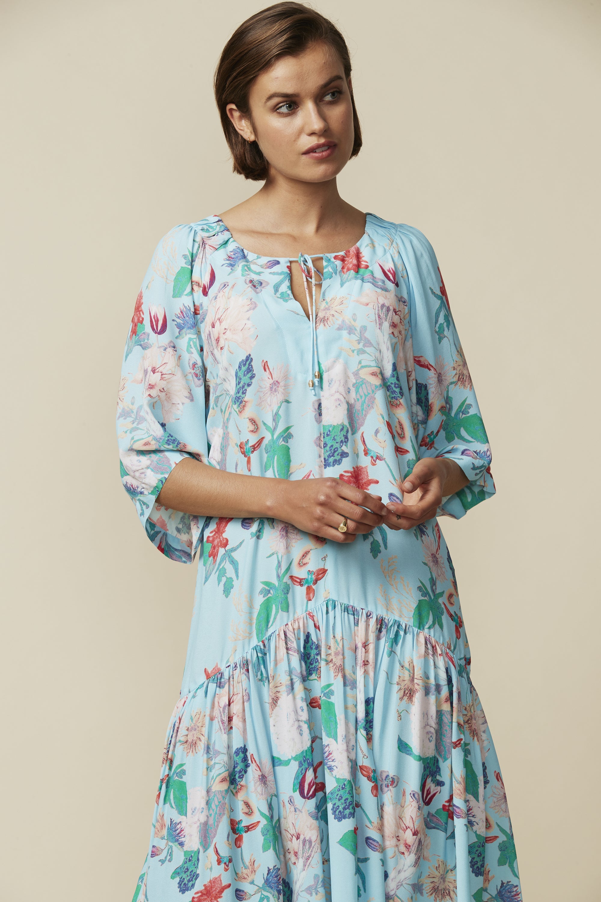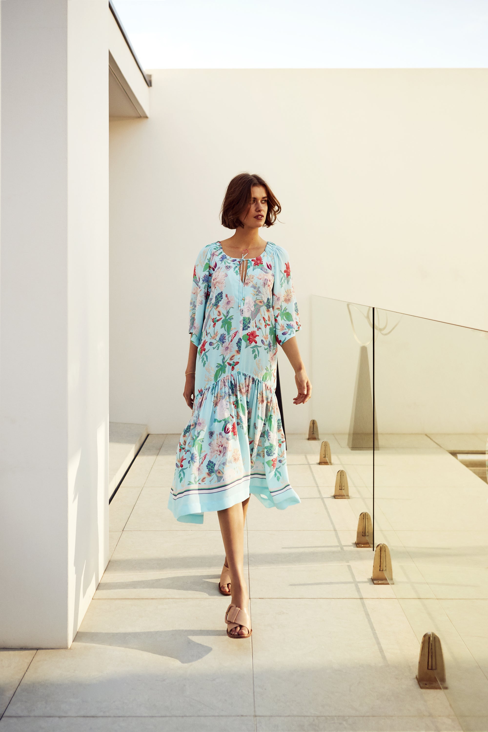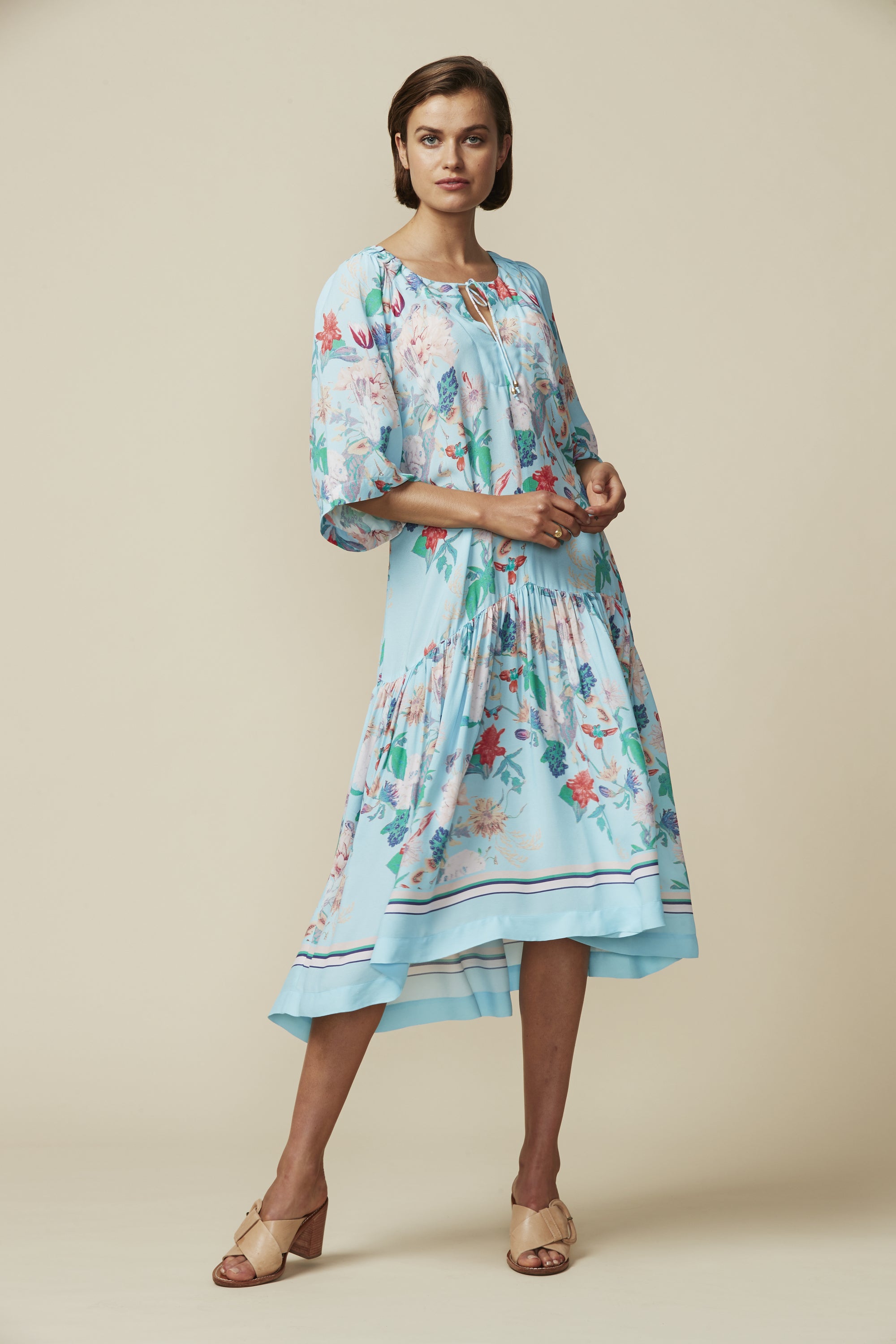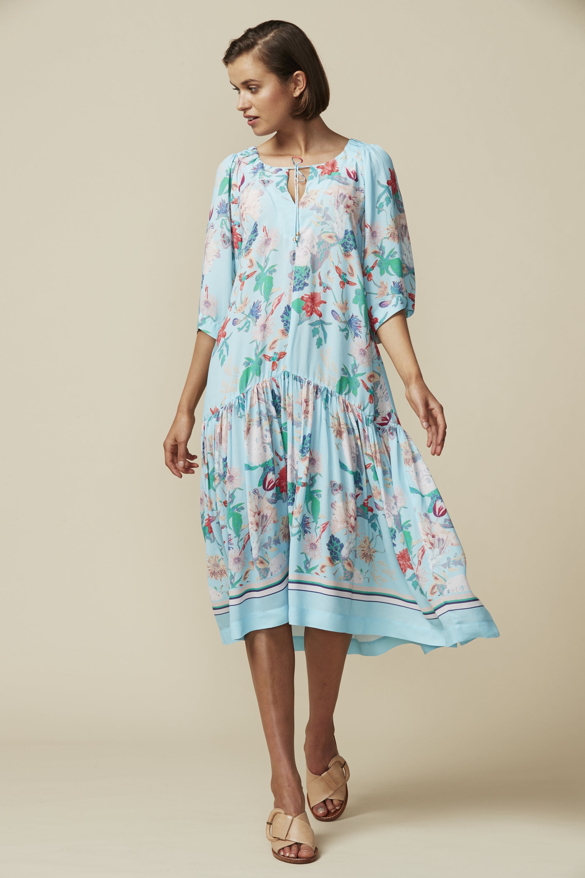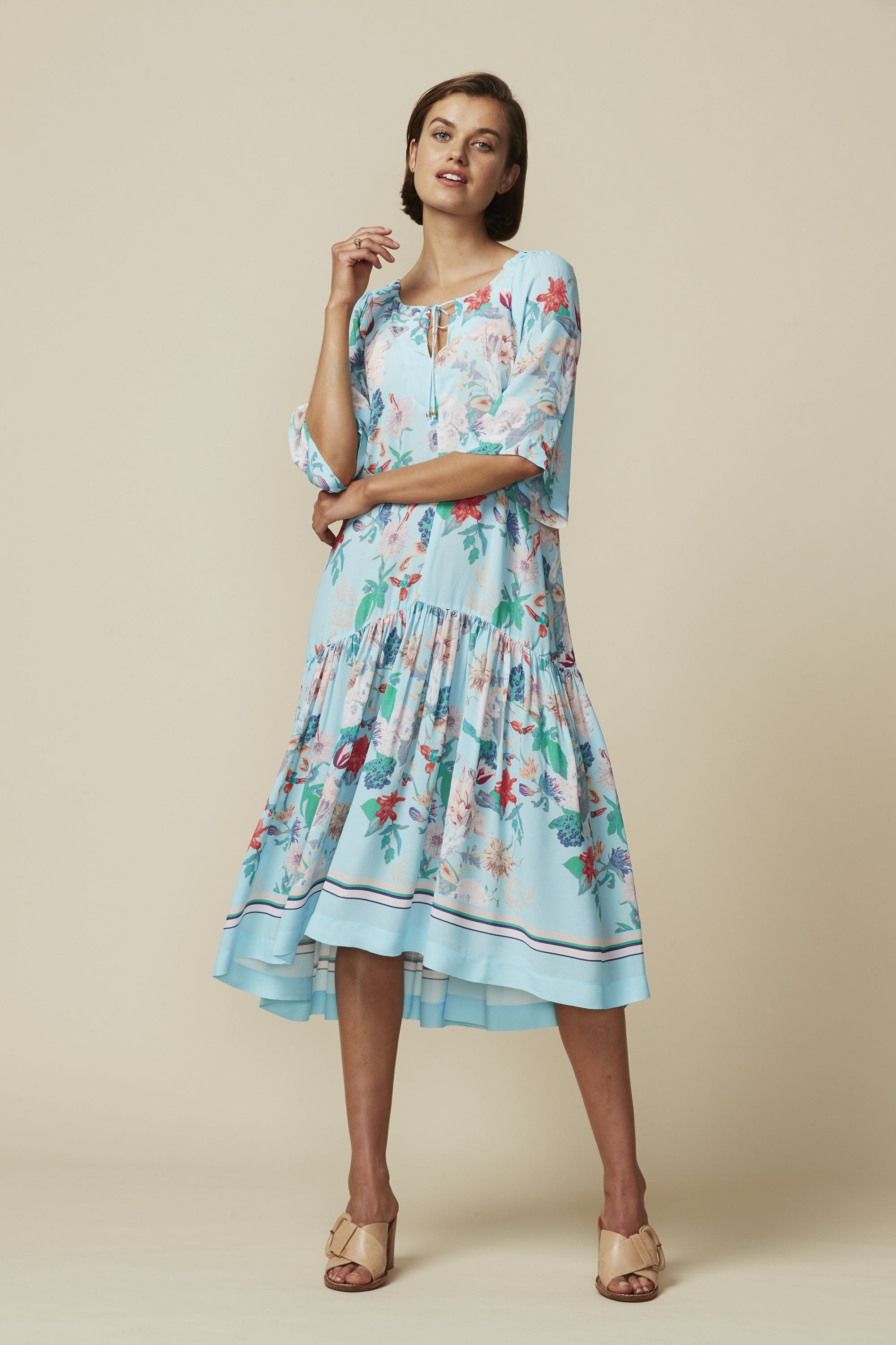 Thyme Dress is in a captivating print with border frill hem — relaxed sleeves, front tie neck with gathered detail at shoulder. Dress up with heals for a formal party; or dress down with sneakers.