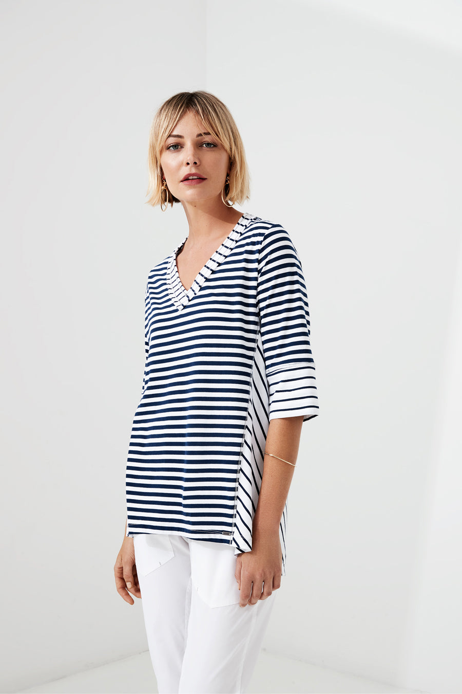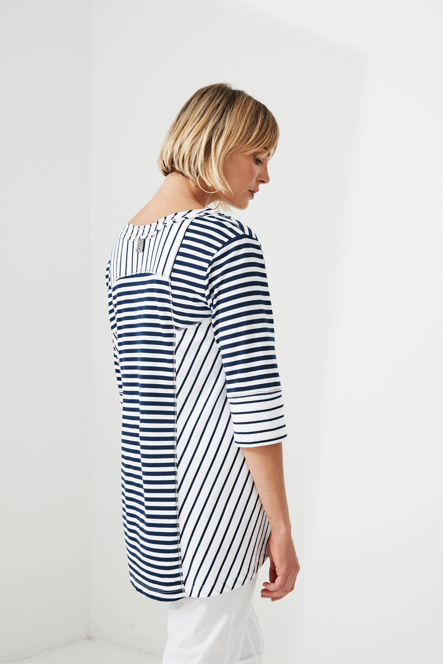 100% organic cotton, easy fit and flare, 3/4 sleeve, mixed striped tee, worn with our Signal Jacket for an effortless look.