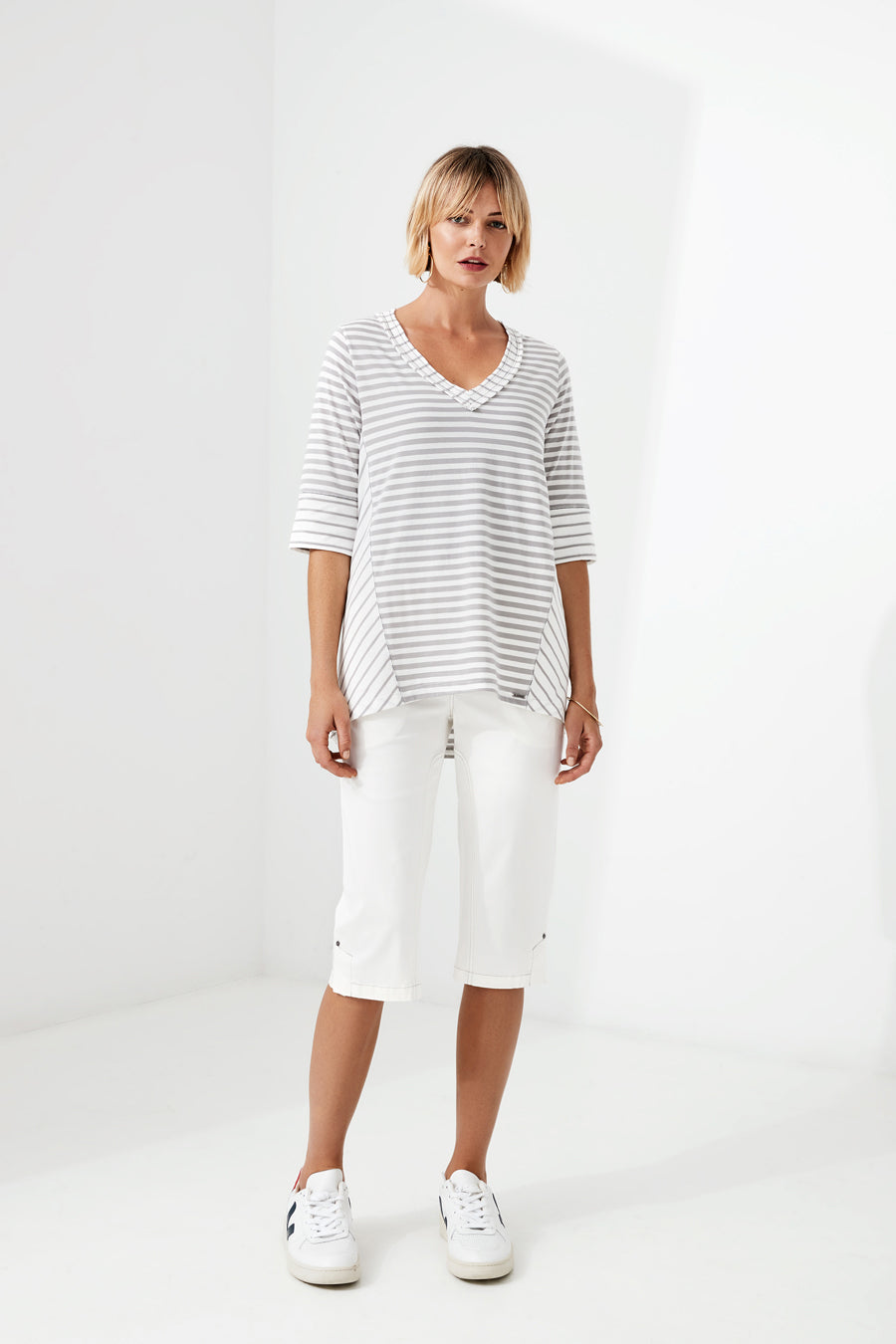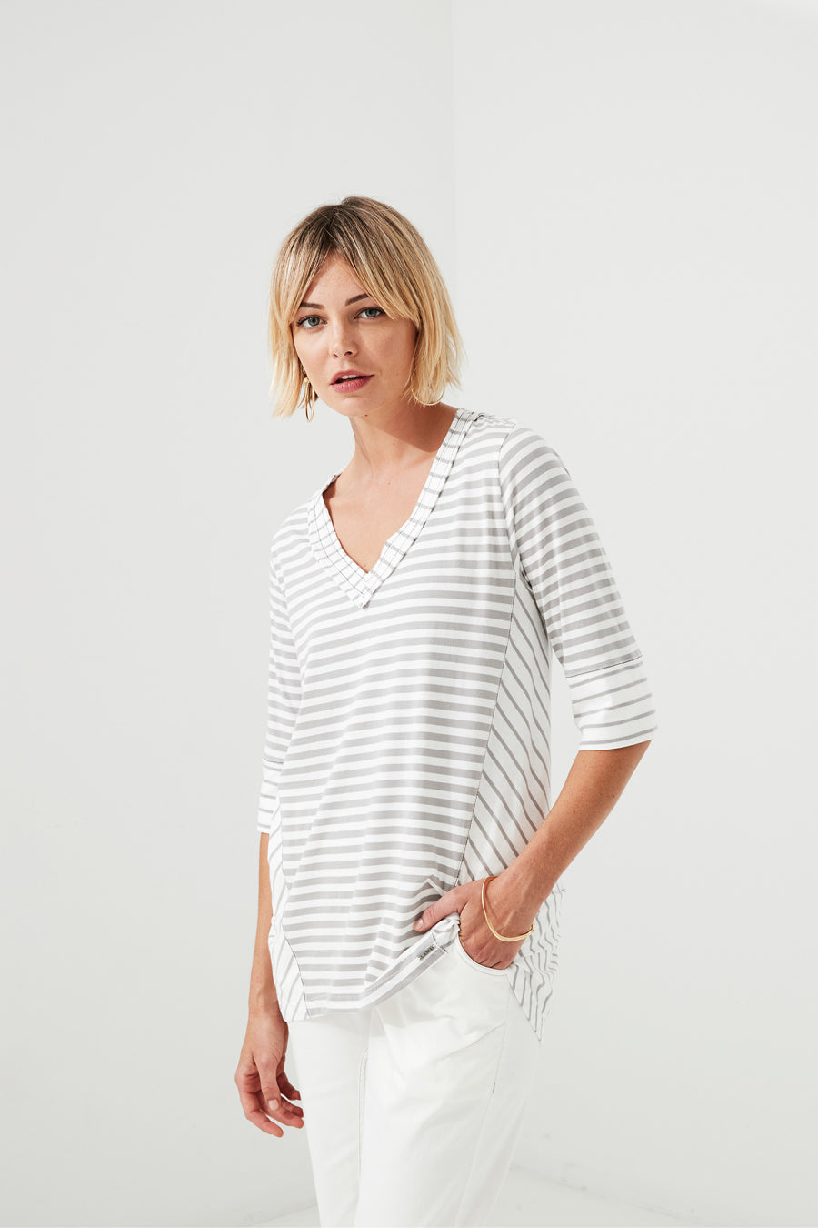 100% organic cotton, easy fit and flare, 3/4 sleeve, mixed striped tee, worn with our Signal Jacket for an effortless look.