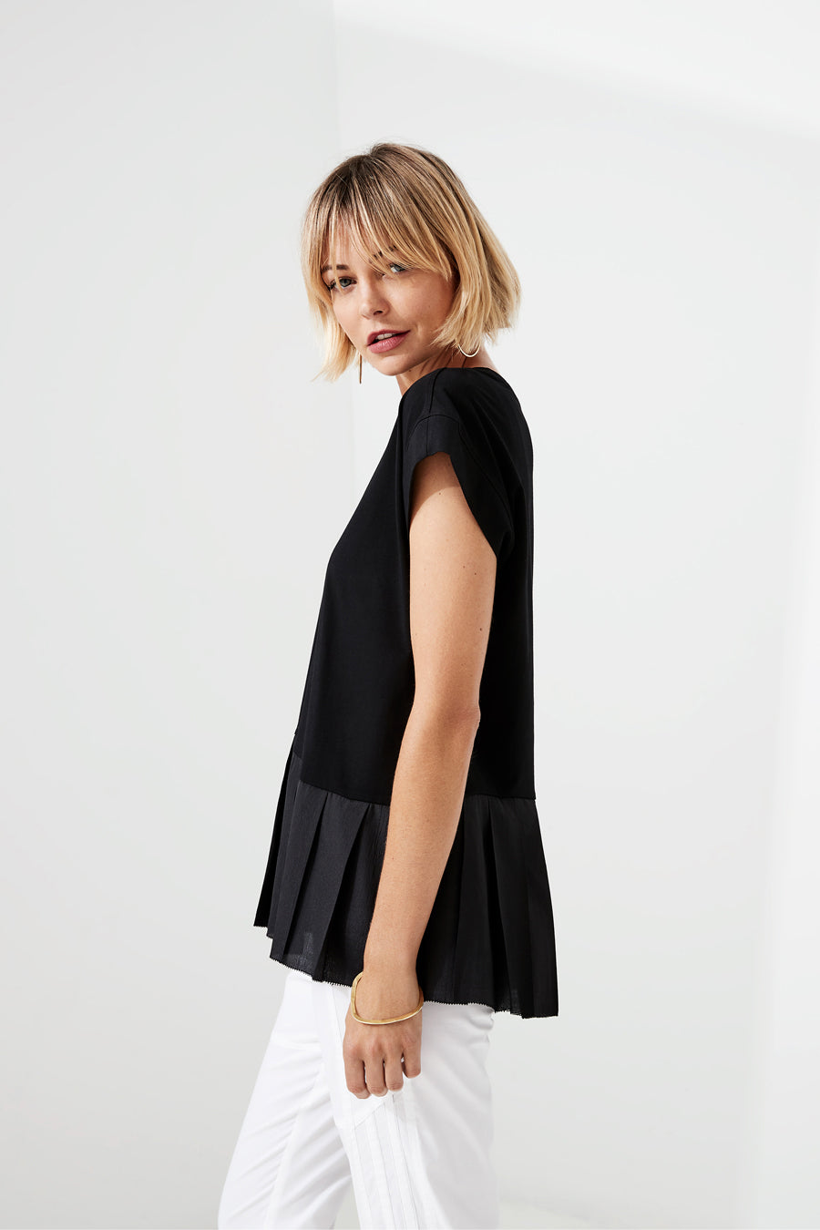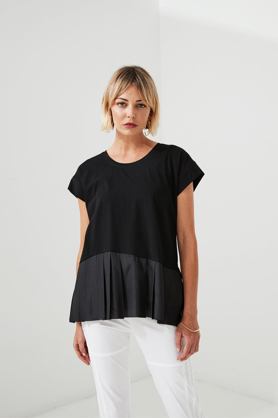 An essential soft stretch cotton tee, an easy-wear round neck, with contrast pleated woven lower panel.