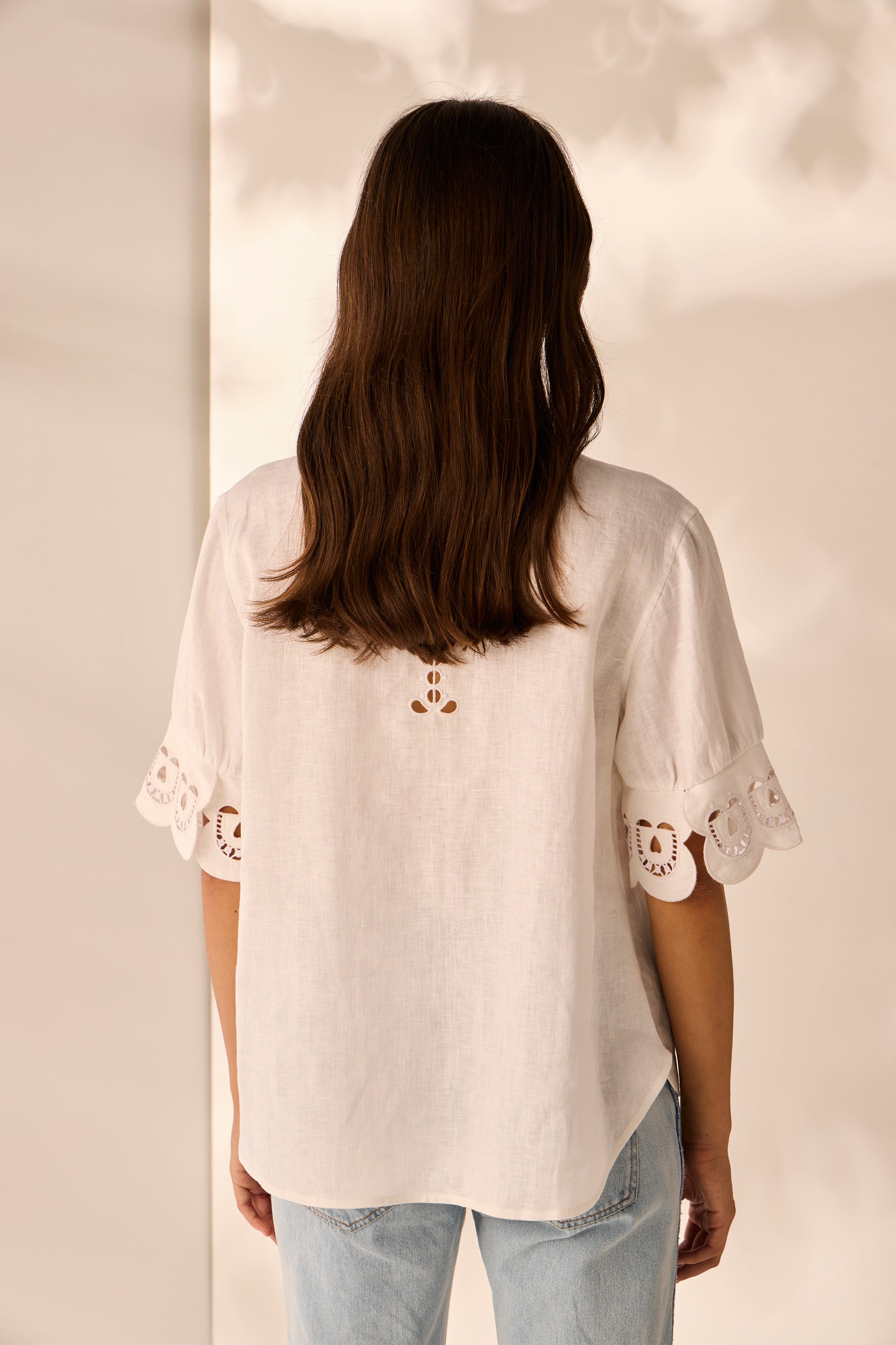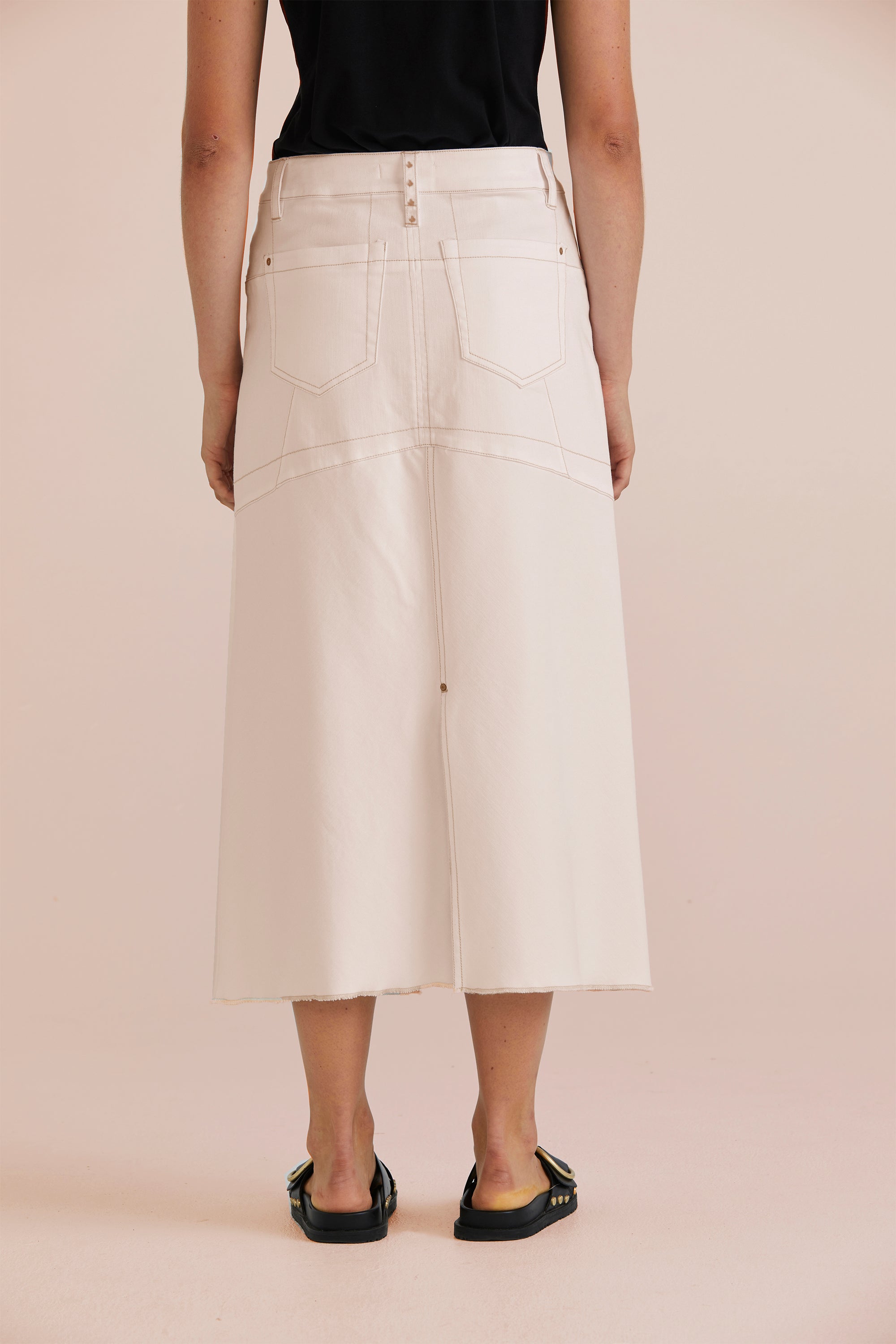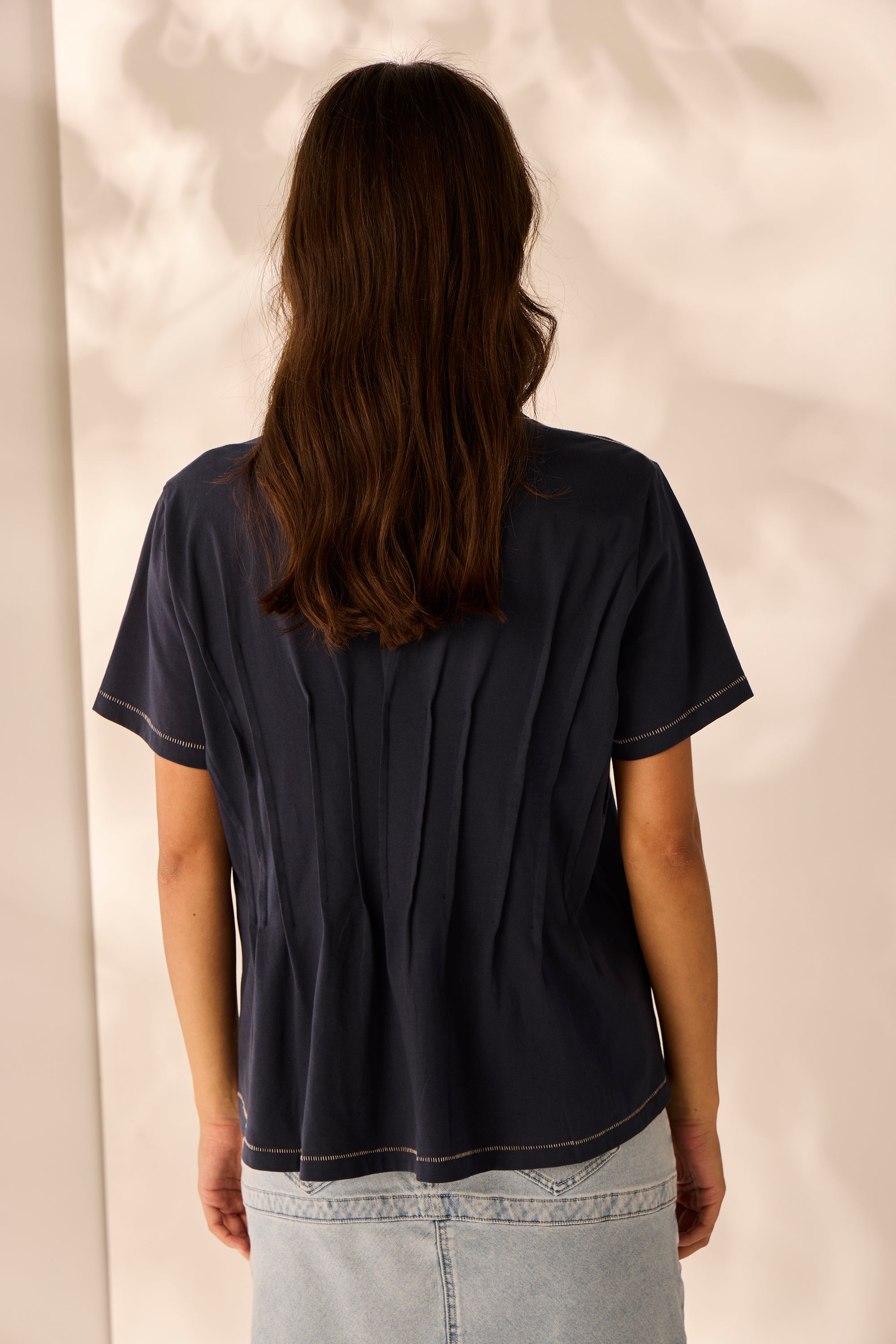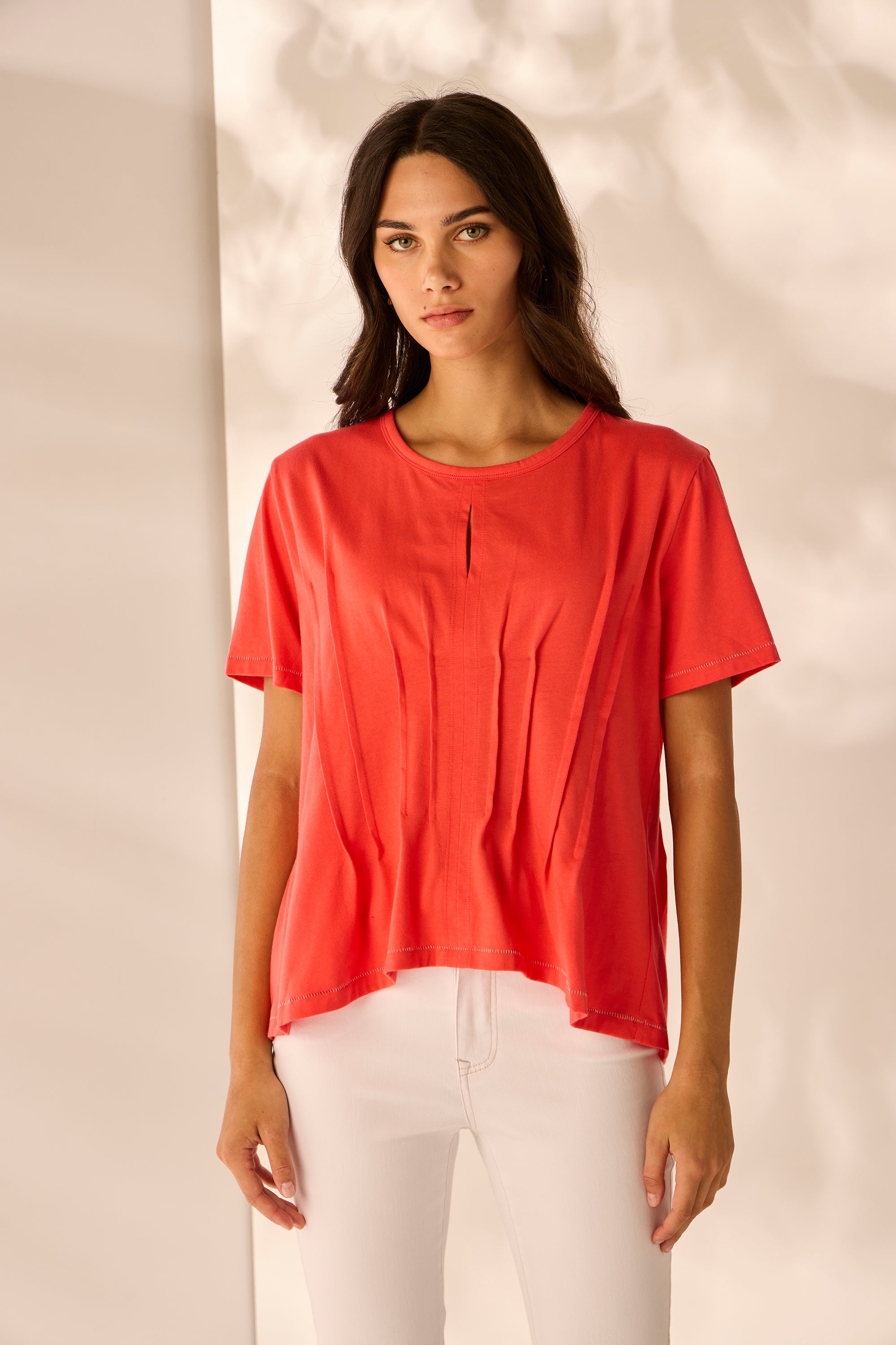 An essential soft stretch cotton tee, an easy-wear round neck, with contrast pleated woven lower panel.